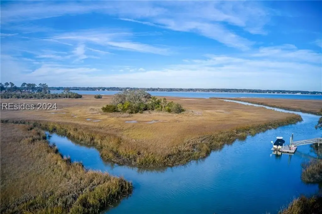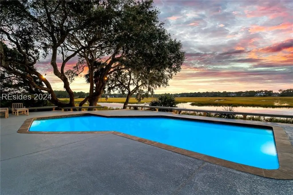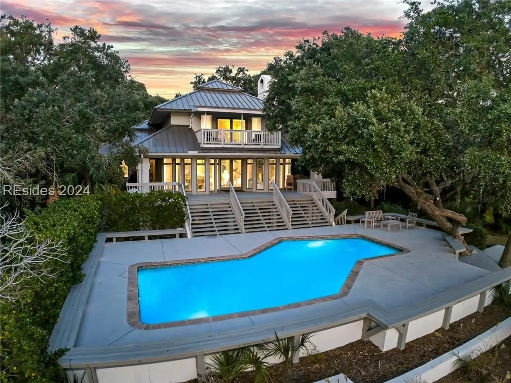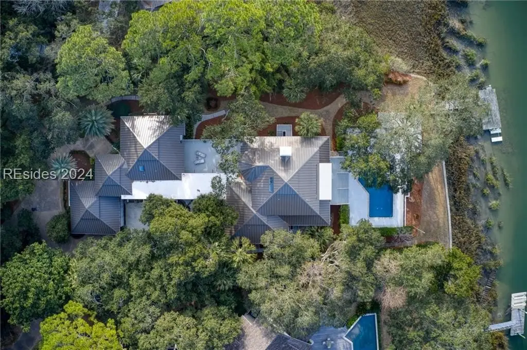 This one-of-a-kind property is privately sited on an almost acre lot with panoramic marsh and water views providing the perfect backdrop for spectacular sunsets. Kermit Huggins, a renowned architect, designed this property with 2 structures that harmoniously co-exist with their natural surroundings. Special features include a new metal roof, hardwood flooring, pella windows/doors, renovated kitchen, and interior paint. The main house boasts a luxurious upper-level owner's suite, and the guest house has 2 en-suite bedrooms plus a kitchenette. Incredible outdoor living with a heated/cooled saltwater pool, expansive deck, and private dock. Waterfront Perfection!