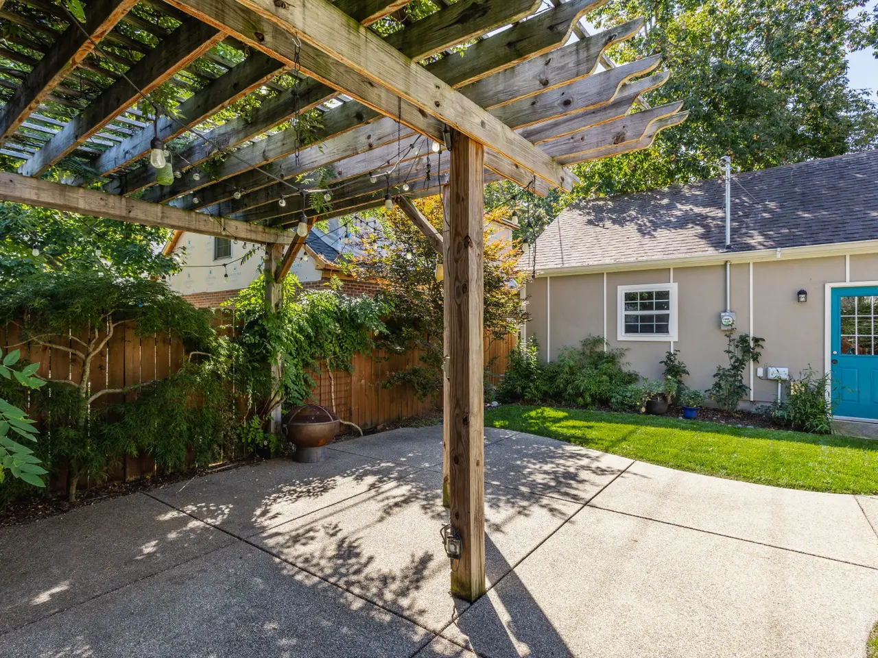 Wood pergola in private backyard