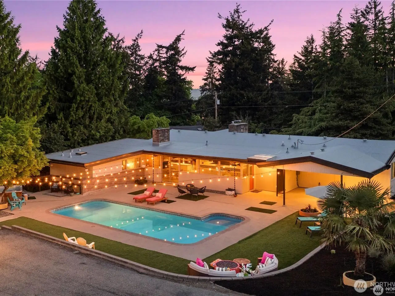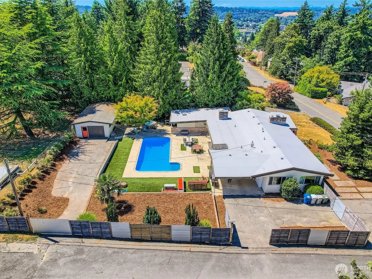 Stunning modern mid-century home with timeless style & a backyard oasis! This light-filled residence features clean lines, large windows, & warm wood tones throughout. Spacious main-level living areas flow effortlessly--perfect for entertaining or everyday life. The kitchen opens directly to the patio & pool area, creating seamless indoor-outdoor living. The daylight basement offers incredible flexibility with a bedroom, workout room, entertainment room, & 3/4 bath ideal for guests, hobbies, or multi-generational living w/separate entry. Enjoy your private retreat with an in-ground pool, expansive patio, & fully fenced yard. New furnace 2024. Located in a quiet, established Kent neighborhood near parks, shopping, schools, & 167. A rare find!