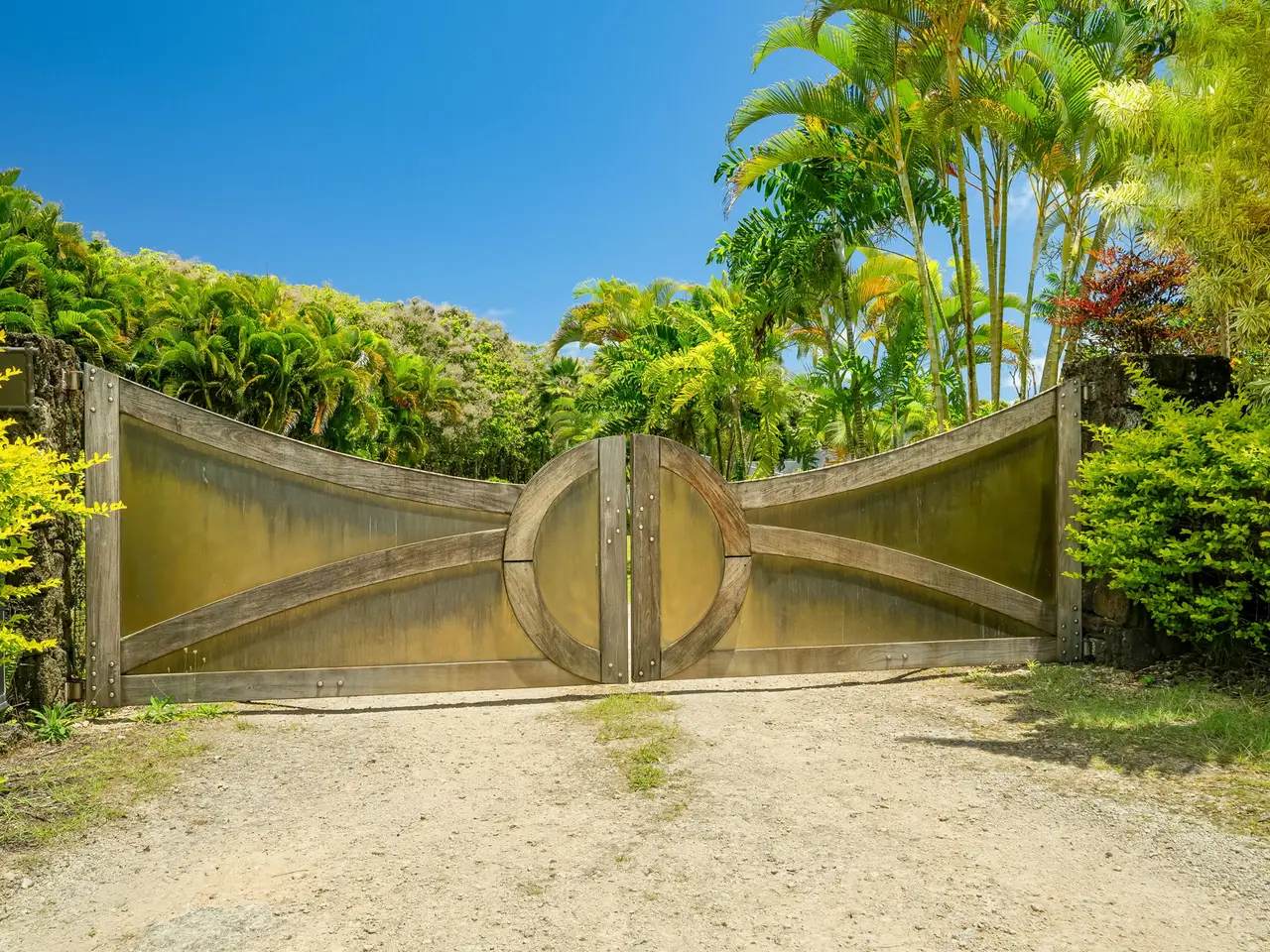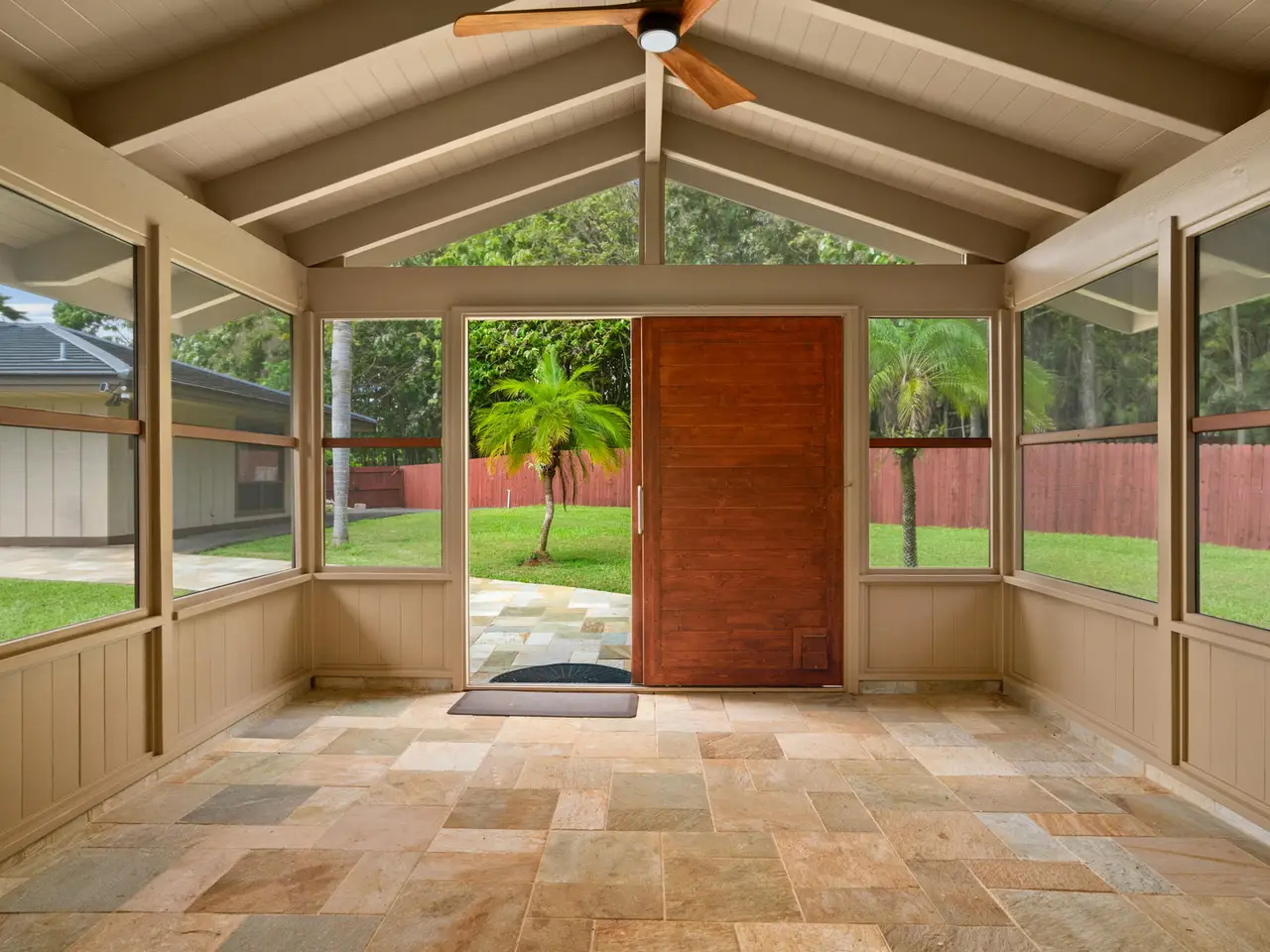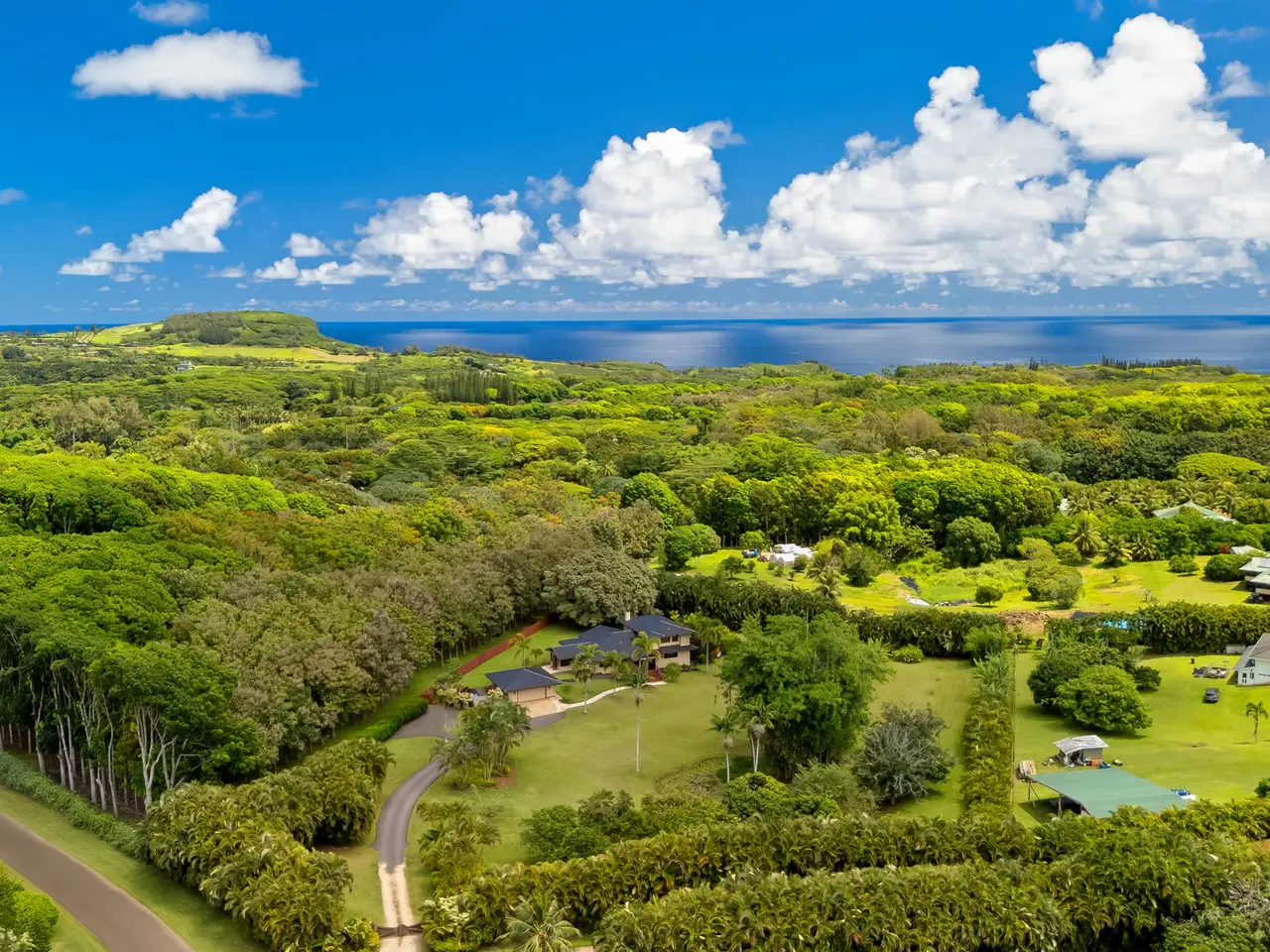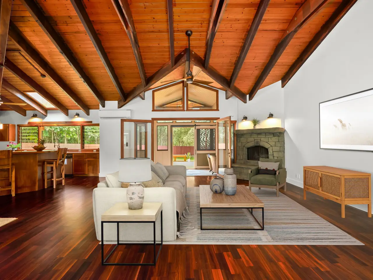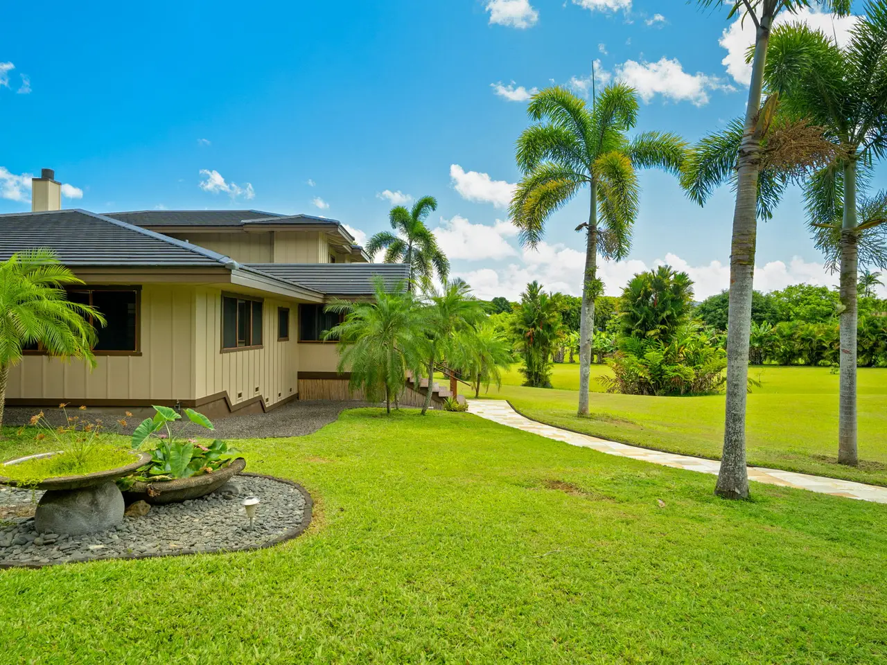 Situated down a gated drive, this estate property offers tranquility, privacy and serene views. The home features 4 bedrooms and 3.5 baths, consisting of 3,354 square feet with an open floor plan. All rooms are large and airy with fresh trade wind breezes throughout. The hardwood floors are imported, as are many of the home’s unique “work of art” features, including hammered copper sinks & bathtub, carved doors and the heavy-beamed 15 foot high ceilings. The cabinets throughout are custom made of teak. The upper level consists of a 910 Sq.Ft. primary suite with a sitting area connected to an adjoining room which can be used as an office, gym or studio. The dressing area and walk-in closet give easy access to the spacious primary bath. Luxuriate in the bath while enjoying the garden views or shower in a unique glass-doored shower and enjoy views of the mountains. The separate 728-square foot, oversized, 2-car garage has a half bath. The estate’s 3+ acres are entirely fenced. The grounds are surrounded on one side by acres of Teak and Mahogany trees and the perimeter is planted with bamboo, mock orange and arecia palms affording total privacy. Views of the mountains, a natural, spring-fed pond and a stream running through the property are just a few of the many amenities that enhance this beautiful setting. Harvest plenty of fresh fruit from the mature, exotic tropical orchard. Other notable features include: • New Split A/C Units • Brand New Tile Roof • Imported Hardwood Flooring • Freshly Painted Interior & Exterior • Screened-in Lanais (x 2) • Large walk-in Closet & Dressing Area • Separate Oversized Garage / Workshop • Gated Entry • Fully Fenced • New Rear Deck for Outdoor Entertaining • Open Floor Plan w/ Extra-Large Rooms • Custom Teak Cabinetry Throughout • Hammered Copper Sinks & Bathtub • Carved Hardwood Doors Come and discover this exceptional North Shore property...