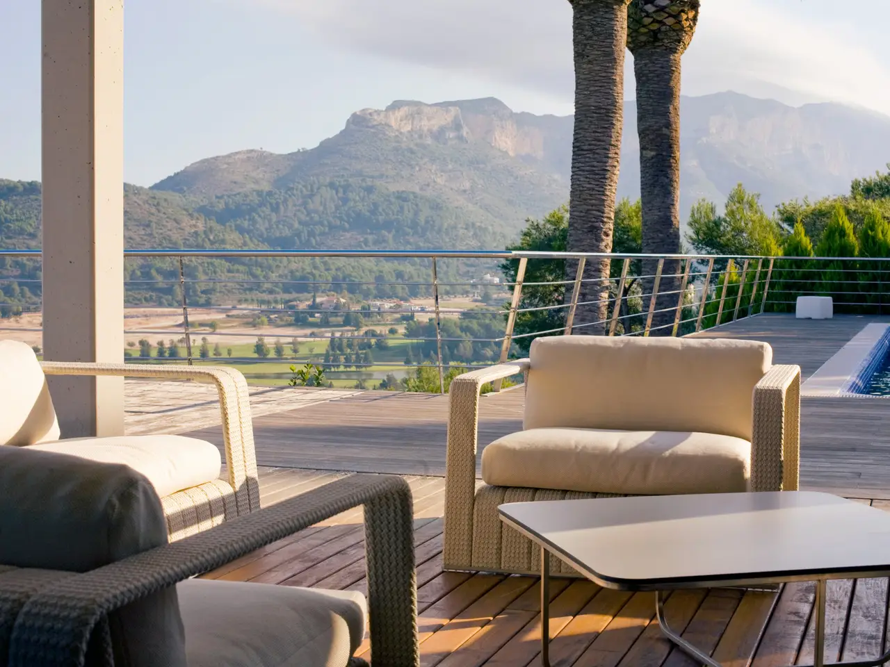 Extraordinary villa located in a very private area in the heart of the luxurious Golf La Sella and Hotel La Sella with impressive panoramic views of the Montgó mountain, the 27-hole golf course and the city of Denia and the sea. It is an exceptional property offering a cutting-edge design where straight lines predominate and large glazed doors and floor-to-ceiling windows create a cosy and bright atmosphere. The villa is set on a plot of 3,250m2 and it has a surface of 1,146m2 distributed over three floors. The ground floor gives access to the house via an impressive automatic and treated wooden door which leads to the hall and the lift that connects all the floors. On the right wing there is the guest area and the staff accommodation consisting of three double bedrooms, three en-suite bathrooms and an equipped kitchen. The first floor is home to the main rooms of the property: the large lounge with large windows offering views of the golf, the mountains and the sea. There is also a dining room, a sitting room with access to a partially covered terrace and the kitchen. All lounges have access to the terrace and the front balcony. The kitchen is equipped with the latest technology and has access to a landscaped terrace on the back. Next to this terrace, you will find a glazed library which connects with a spacious office and a guest toilet. The main bedroom enjoys spaciousness and is distributed into a rest area, two dressing areas, marble bathroom with two independent toilets, shower and whirlpool, plus two lounges annex to the bedroom which can be used as a reading room or tv room and a terrace. On the left wing, you will find a large garage with capacity for five vehicles, large temperature-controlled wine cellar, gym and changing rooms with shower. In addition, there are two storage rooms, laundry room and machine room. The illuminated pool with a self-cleaning system is surrounded by a teak deck. Next to it, there is the barbecue area and a private outdoor shower. The plot enjoys privacy and is completely fenced and equipped with surveillance system and a perimeter alarm. The garden is embellished with a great variety of vegetation such as kermes oak, walnut trees, orange and lemon trees, as well as aromatic plants and chill-out areas. Comfort and security for residents is guaranteed as it is equipped with air conditioning and underfloor heating, alarm system, CCTV video surveillance, automatic entrance doors, electric blinds, aluminium windows with safety glass, marble and wooden flooring, music system and lightening in terraces, access and gardens.
