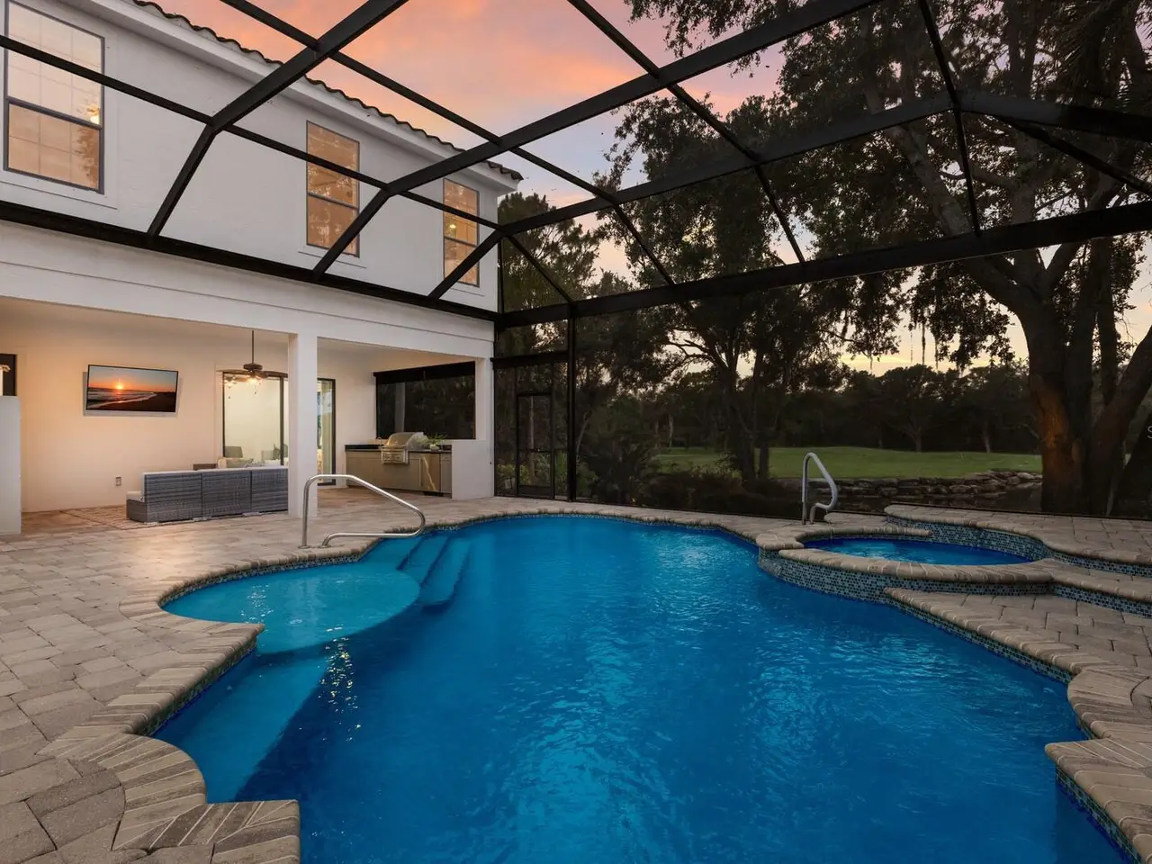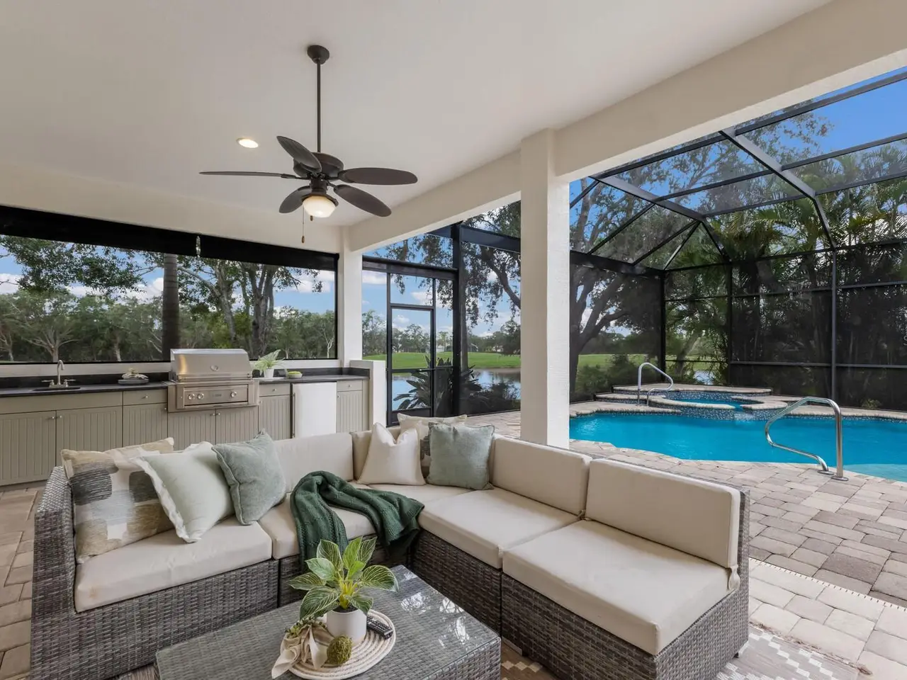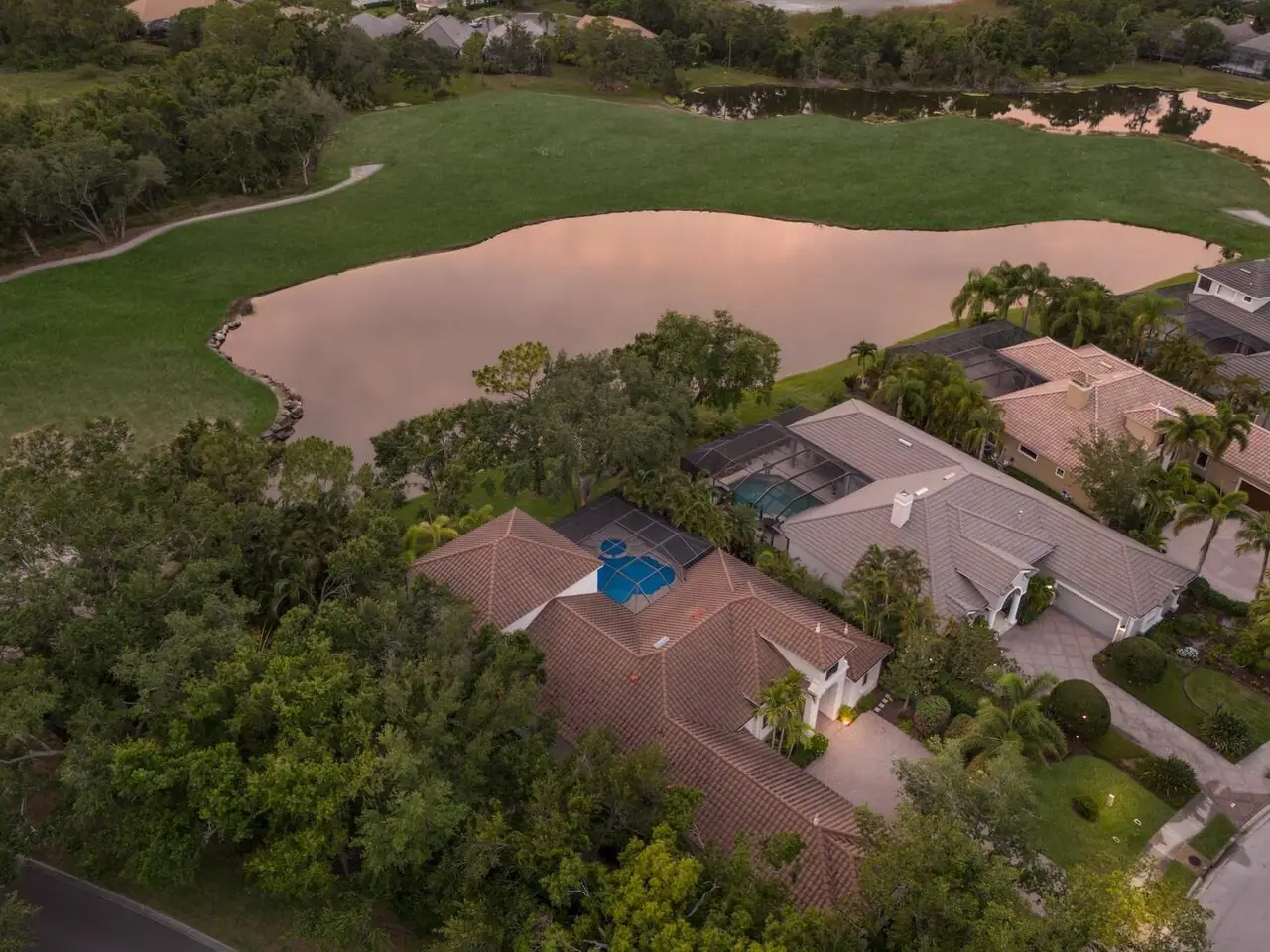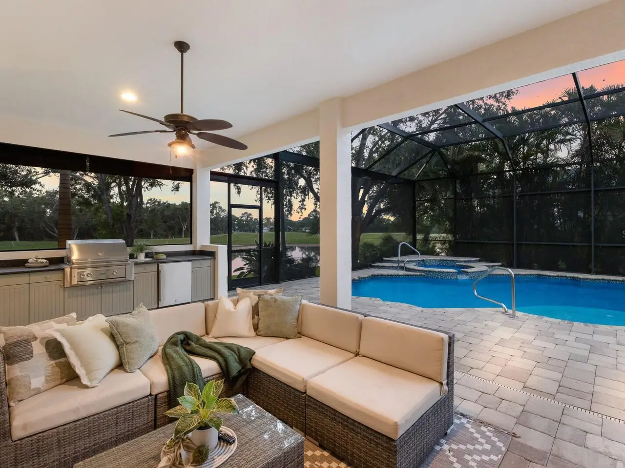 Savor one of the most breathtaking lake, golf, and preserve settings in Lakewood Ranch from this beautifully appointed Westover II model nestled in a serene, private setting on the King's Dunes golf course in The Country Club. The light and bright 3,885 square foot residence custom built by Neal Signature Homes boasts westerly views showcasing perfectly proportioned spaces, exceptional design, newly painted interior and exterior, volume ceilings, engineered wood flooring, and stunning sunsets nightly. The recently installed new panoramic screened lanai cage further accentuates the outdoor living experience, along with the heated pebble tec pool/spa with sun shelf, two separate covered areas, gas fireplace and an outdoor Summer kitchen. The surrounding vistas bring the unmatched optic experience indoors seamlessly via sliding glass doors and a plethora of transom windows, with architectural details and designer touches throughout, including tray ceilings, crown moldings, and trimmings at every turn. An invitingly large great room open to the kitchen where form, function and design reigns cohesively with sprawling granite counters, wood cabinetry, high performance appliances, breakfast bar, a walk-in pantry, and a breakfast nook area adorned with the surrounding views beyond. Off the kitchen is a butler's pantry with a wine fridge connecting to a lovely formal dining area and equally elegant living room infused with natural light. Unwind in the owner's retreat positioned on its own private wing on the main level, offering two walk-in customized closets and a luxuriously appointed spa-like bath with separate vanity stations, stand-alone shower, and a free-standing soaking tub. Family and overnight visitors alike will be right at home with the three additional guest rooms , two on the main level anchored by a full bath, while a third guest room is located upstairs off the home's fourth full bath. On the upper level, there is also an expansive bonus room offering multiple flex living space options boasting some of the most incredible golf views in Lakewood Ranch. Other notable highlights of this all-encompassing 5,351 square foot four bedroom four full bath maintenance free residence includes a perfectly located main level office/den at the rear of the residence with picturesque views just off the pool bath, a generously sized laundry room with sink and cabinetry, hurricane shutters, and an oversized 3-car garage. Within the #1 top-selling master-planned community known for its vibrant lifestyle, dining, shopping, A-rated schools and non-mandatory membership opportunities to become a member of Lakewood Ranch Golf & Country Club, which include four 18-hole championship golf courses, tennis, state-of-the-art Fitness center, clubhouses, junior Olympic-sized pool, pickleball and more.