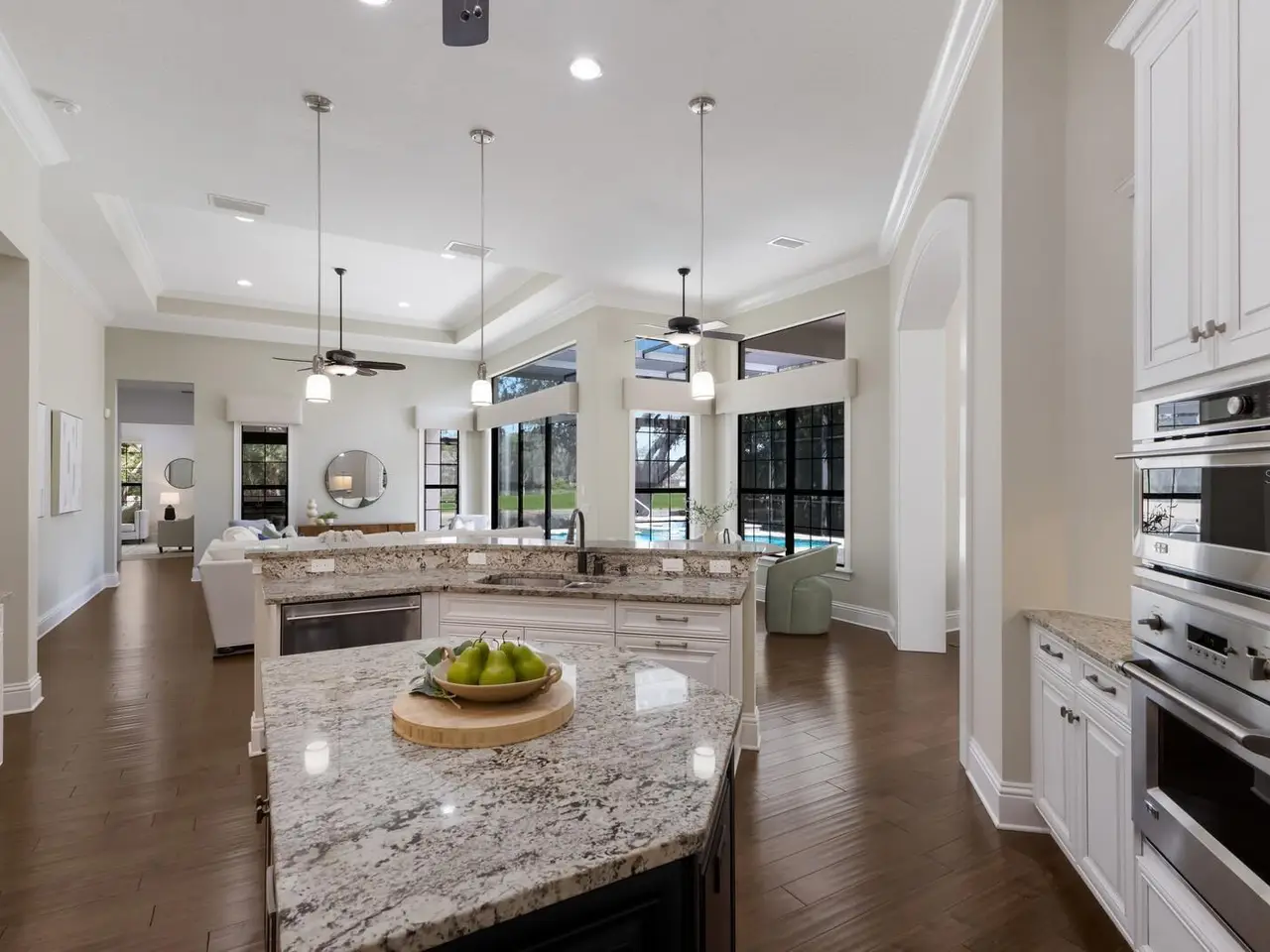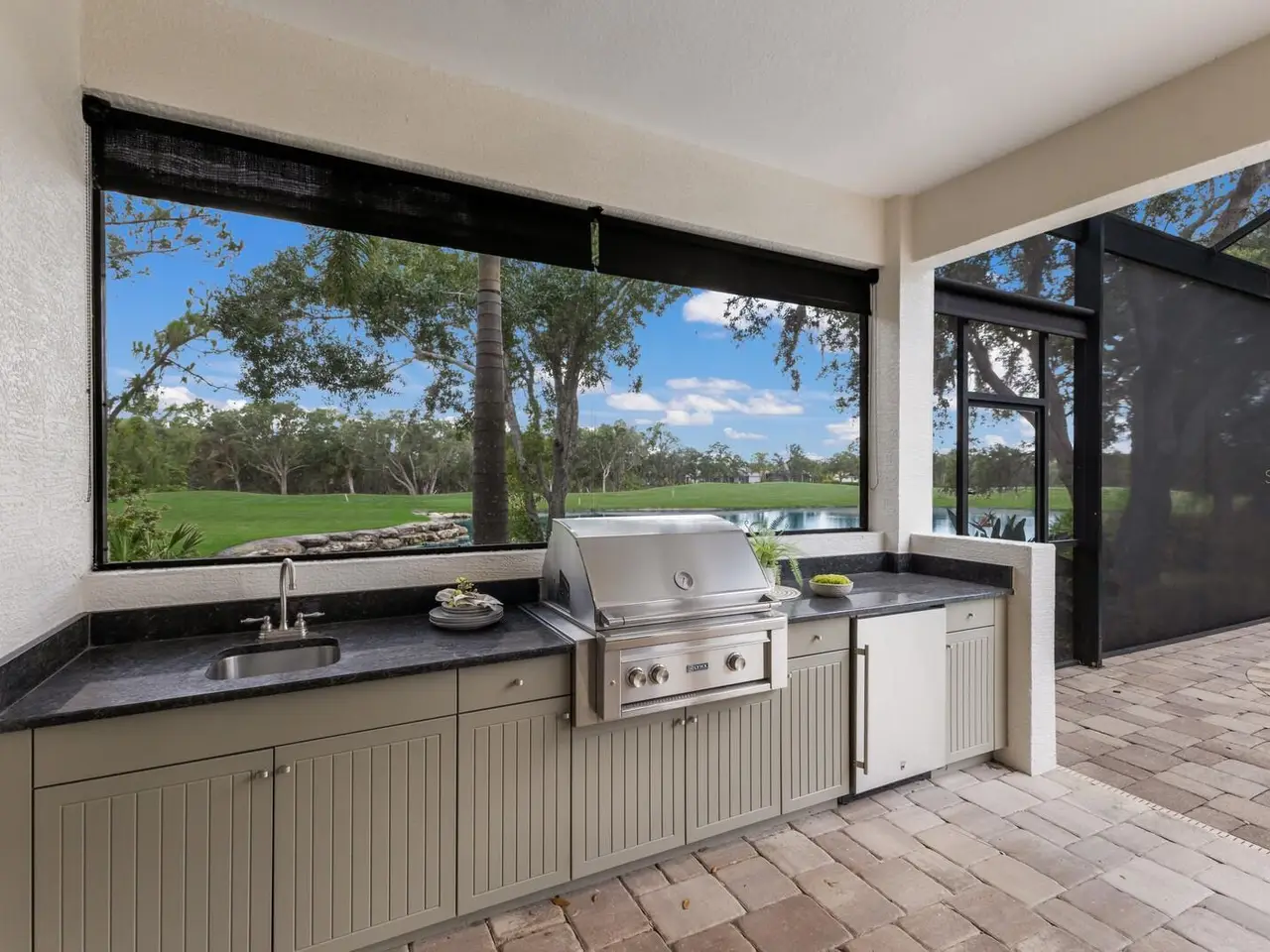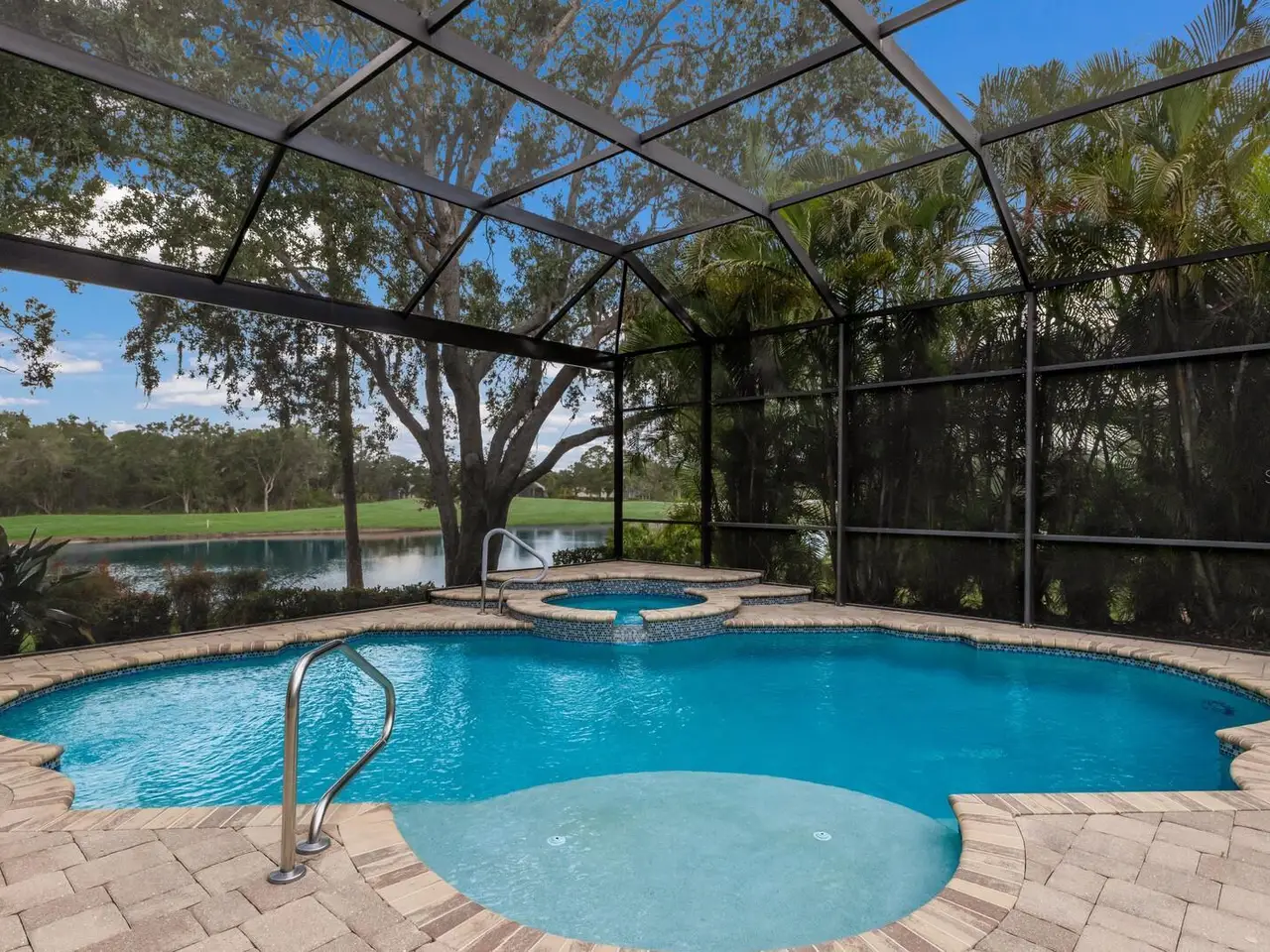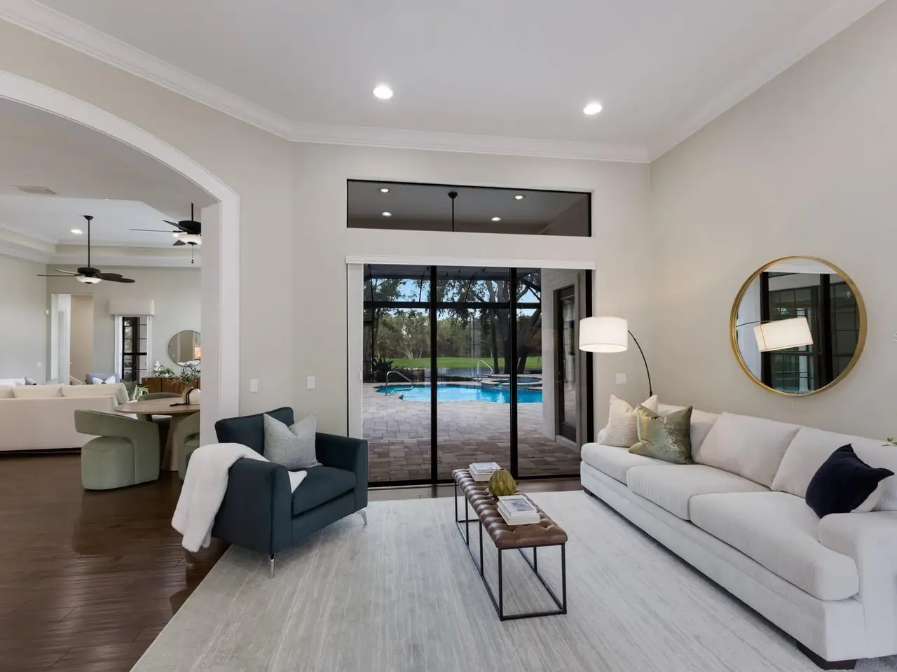 Savor one of the most breathtaking lake, golf, and preserve settings in Lakewood Ranch from this beautifully appointed Westover II model nestled in a serene, private setting on the King's Dunes golf course in The Country Club. The light and bright 3,885 square foot residence custom built by Neal Signature Homes boasts westerly views showcasing perfectly proportioned spaces, exceptional design, newly painted interior and exterior, volume ceilings, engineered wood flooring, and stunning sunsets nightly. The recently installed new panoramic screened lanai cage further accentuates the outdoor living experience, along with the heated pebble tec pool/spa with sun shelf, two separate covered areas, gas fireplace and an outdoor Summer kitchen. The surrounding vistas bring the unmatched optic experience indoors seamlessly via sliding glass doors and a plethora of transom windows, with architectural details and designer touches throughout, including tray ceilings, crown moldings, and trimmings at every turn. An invitingly large great room open to the kitchen where form, function and design reigns cohesively with sprawling granite counters, wood cabinetry, high performance appliances, breakfast bar, a walk-in pantry, and a breakfast nook area adorned with the surrounding views beyond. Off the kitchen is a butler's pantry with a wine fridge connecting to a lovely formal dining area and equally elegant living room infused with natural light. Unwind in the owner's retreat positioned on its own private wing on the main level, offering two walk-in customized closets and a luxuriously appointed spa-like bath with separate vanity stations, stand-alone shower, and a free-standing soaking tub. Family and overnight visitors alike will be right at home with the three additional guest rooms , two on the main level anchored by a full bath, while a third guest room is located upstairs off the home's fourth full bath. On the upper level, there is also an expansive bonus room offering multiple flex living space options boasting some of the most incredible golf views in Lakewood Ranch. Other notable highlights of this all-encompassing 5,351 square foot four bedroom four full bath maintenance free residence includes a perfectly located main level office/den at the rear of the residence with picturesque views just off the pool bath, a generously sized laundry room with sink and cabinetry, hurricane shutters, and an oversized 3-car garage. Within the #1 top-selling master-planned community known for its vibrant lifestyle, dining, shopping, A-rated schools and non-mandatory membership opportunities to become a member of Lakewood Ranch Golf & Country Club, which include four 18-hole championship golf courses, tennis, state-of-the-art Fitness center, clubhouses, junior Olympic-sized pool, pickleball and more.