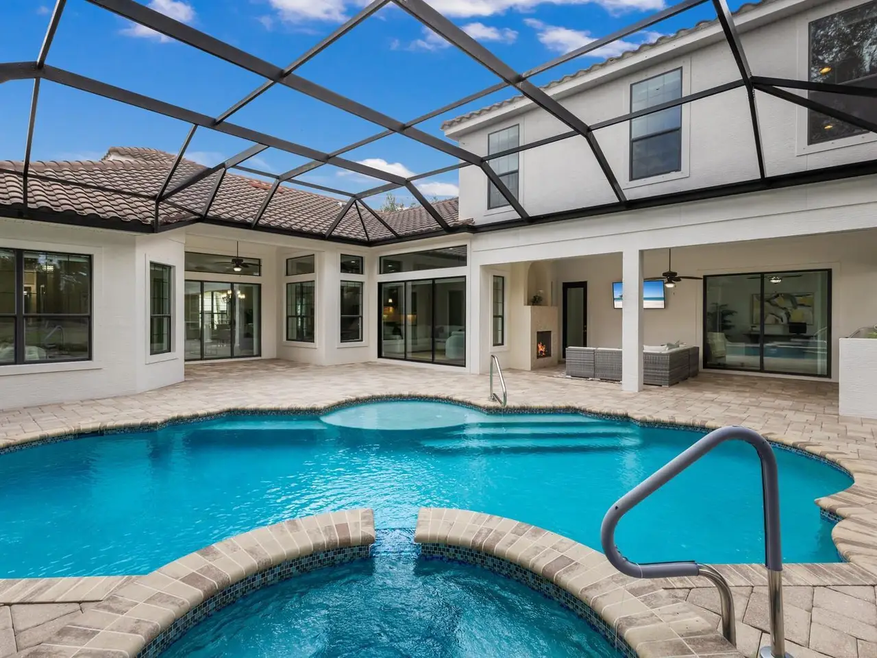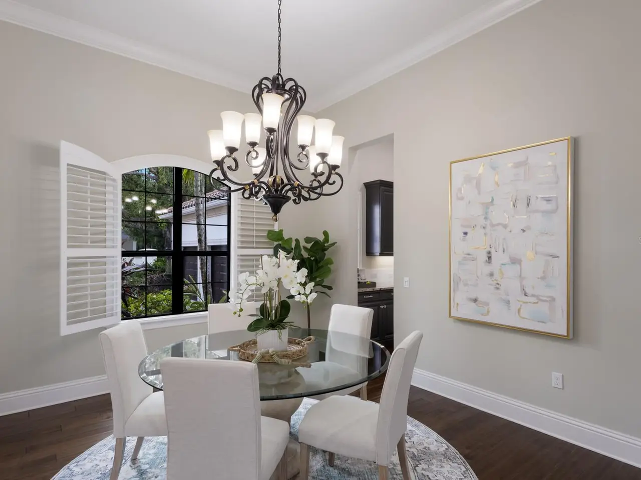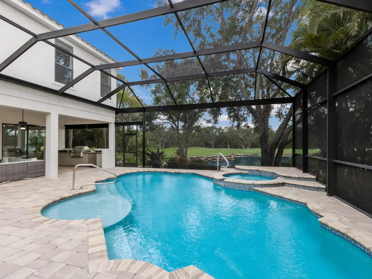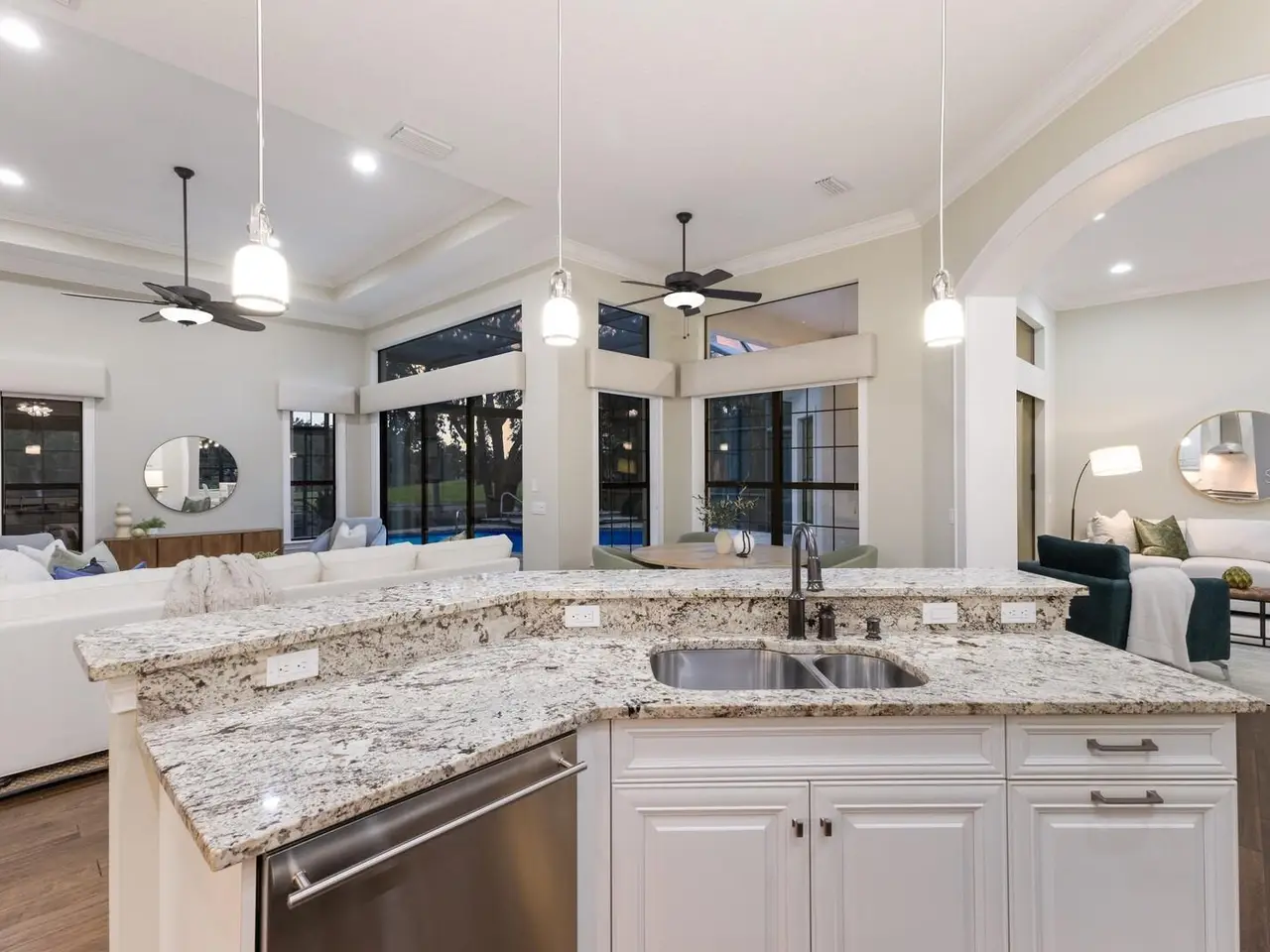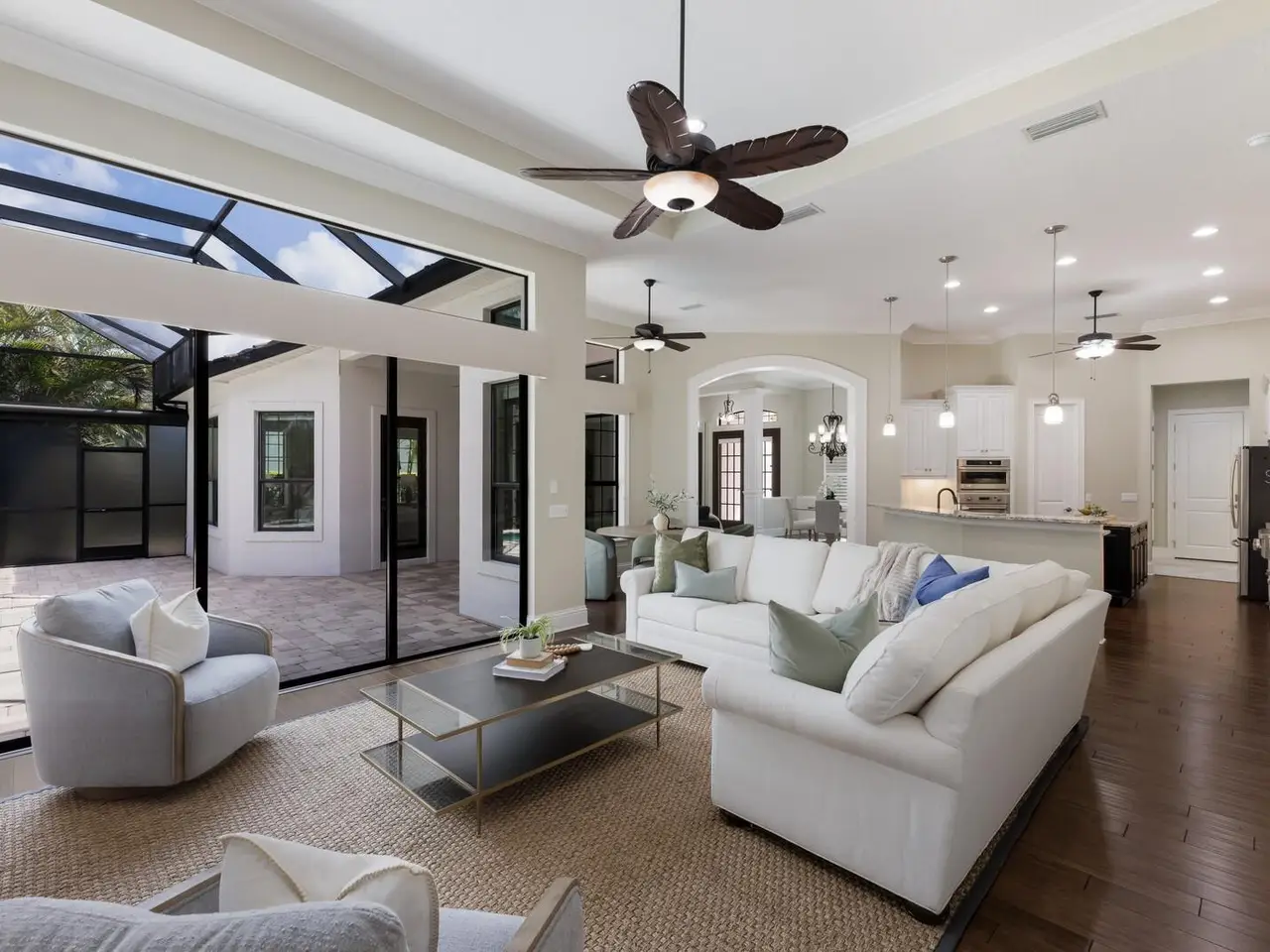 Savor one of the most breathtaking lake, golf, and preserve settings in Lakewood Ranch from this beautifully appointed Westover II model nestled in a serene, private setting on the King's Dunes golf course in The Country Club. The light and bright 3,885 square foot residence custom built by Neal Signature Homes boasts westerly views showcasing perfectly proportioned spaces, exceptional design, newly painted interior and exterior, volume ceilings, engineered wood flooring, and stunning sunsets nightly. The recently installed new panoramic screened lanai cage further accentuates the outdoor living experience, along with the heated pebble tec pool/spa with sun shelf, two separate covered areas, gas fireplace and an outdoor Summer kitchen. The surrounding vistas bring the unmatched optic experience indoors seamlessly via sliding glass doors and a plethora of transom windows, with architectural details and designer touches throughout, including tray ceilings, crown moldings, and trimmings at every turn. An invitingly large great room open to the kitchen where form, function and design reigns cohesively with sprawling granite counters, wood cabinetry, high performance appliances, breakfast bar, a walk-in pantry, and a breakfast nook area adorned with the surrounding views beyond. Off the kitchen is a butler's pantry with a wine fridge connecting to a lovely formal dining area and equally elegant living room infused with natural light. Unwind in the owner's retreat positioned on its own private wing on the main level, offering two walk-in customized closets and a luxuriously appointed spa-like bath with separate vanity stations, stand-alone shower, and a free-standing soaking tub. Family and overnight visitors alike will be right at home with the three additional guest rooms , two on the main level anchored by a full bath, while a third guest room is located upstairs off the home's fourth full bath. On the upper level, there is also an expansive bonus room offering multiple flex living space options boasting some of the most incredible golf views in Lakewood Ranch. Other notable highlights of this all-encompassing 5,351 square foot four bedroom four full bath maintenance free residence includes a perfectly located main level office/den at the rear of the residence with picturesque views just off the pool bath, a generously sized laundry room with sink and cabinetry, hurricane shutters, and an oversized 3-car garage. Within the #1 top-selling master-planned community known for its vibrant lifestyle, dining, shopping, A-rated schools and non-mandatory membership opportunities to become a member of Lakewood Ranch Golf & Country Club, which include four 18-hole championship golf courses, tennis, state-of-the-art Fitness center, clubhouses, junior Olympic-sized pool, pickleball and more.