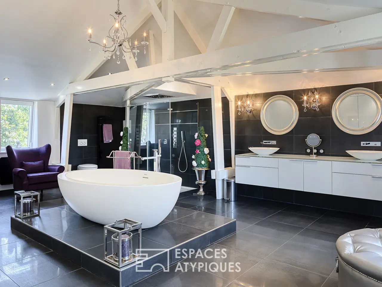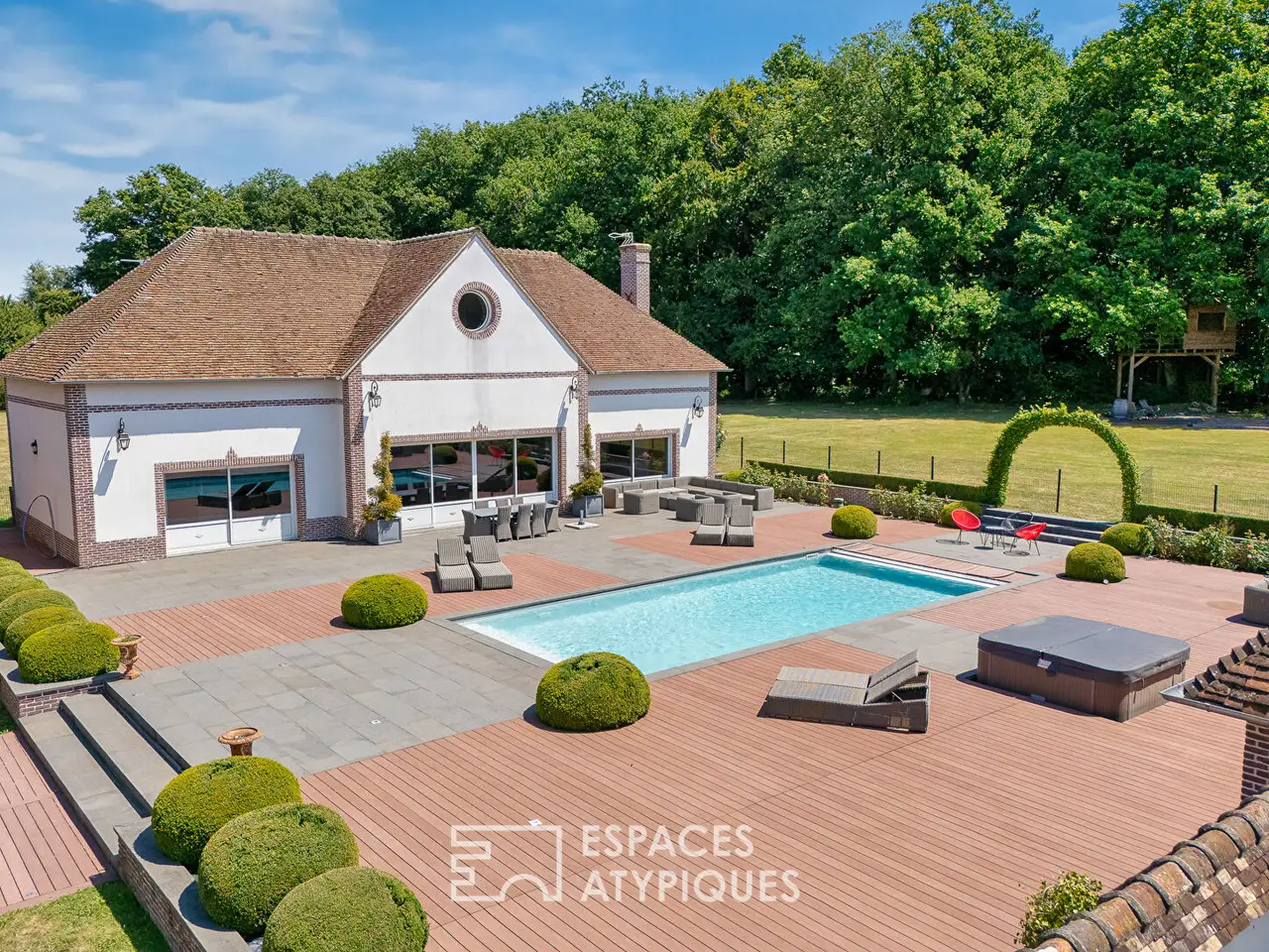Just 15 minutes from Pacy-sur-Eure, this sumptuous 18th-century manor house exudes its understated elegance at the end of a lane, on the edge of a private forest. Completely renovated with fine materials and respecting its original character, it offers 400 m2 of living space, plus a contemporary guest house of over 200 m2.A true haven of peace, this rare estate combines architectural heritage, generous volumes, and high-end amenities. The interior of the main residence is organized around a vast ground floor bathed in light, featuring a refined entrance hall leading to the right, a pleasant dining room with classic lines, and a fully equipped custom-made kitchen whose immense glass roof invites you to dine on the terrace. On the left, a cozy living room with an open fireplace leads to a large landing adorned with bookcases, then to a master suite offering peace and privacy, culminating in a fitted dressing room of over 20m2 located in the basement. The other part of the basement, accessible from the living room, houses a remarkable wine cellar, a testament to the cider-making past. The upper floor consists of a laundry room and three spacious suites, all with large private bathrooms, dressing rooms, and toilets. The master bedroom captivates with its breathtaking 40m2 bathroom and unobstructed views of the park.On the second floor, an additional bedroom, a bathroom with toilet, and a vast 60m2 living room or games room complete the space. Just steps from the main house, an elegant contemporary outbuilding welcomes guests in absolute comfort: on the ground floor, a fully equipped kitchen opens onto a reception area of over 80 m2 facing the heated swimming pool and its graphically designed terrace. The upper floor offers four bedrooms, a shower room, and a large games room or dormitory.The two-hectare park, part of which is suitable for building, reveals a rare harmony between a structured garden and unspoiled nature. An orchard, vegetable garden, fruit trees, rare species, and an 8,000 m2 forest create a plant setting of extraordinary richness. A tree house, a petanque court, and several outbuildings (double garage, carport, woodshed) complete this enchanting setting.A place of character, this exceptional property embodies the subtle union between authenticity and modernity, between heritage elegance and contemporary comfort. A unique property, imbued with poetry, for those seeking a rare living environment in the heart of Normandy's nature, 1 hour from Paris and 1 hour 10 minutes from the Normandy coast.Main HouseENERGY RATING: C / CLIMATE RATING: CEstimated average annual energy costs for standard use, indexed as of January 1, 2021: between €3,530 and €4,680.Guest HouseENERGY RATING: C / CLIMATE RATING: AEstimated average annual energy costs for standard use, indexed as of January 1, 2021: between €1,680 and €2,320.Information on the risks to which this property is exposed is available on the Georisques website: www.georisques.gouv.frREF. 11932EAEAdditional information* 15 rooms* 9 bedrooms* 6 bathrooms* 2 floors in the building* Outdoor space : 27000 SQM* Parking : 8 parking spaces* Property tax : 3 511 €Energy Performance CertificatePrimary energy consumptionc : 129 kWh/m2.yearHigh performance housing*A*B*129kWh/m2.year21*kg CO2/m2.yearC*D*E*F*GExtremely poor housing performance* Of which greenhouse gas emissionsc : 21 kg CO2/m2.yearLow CO2 emissions*A*B*21kg CO2/m2.yearC*D*E*F*G