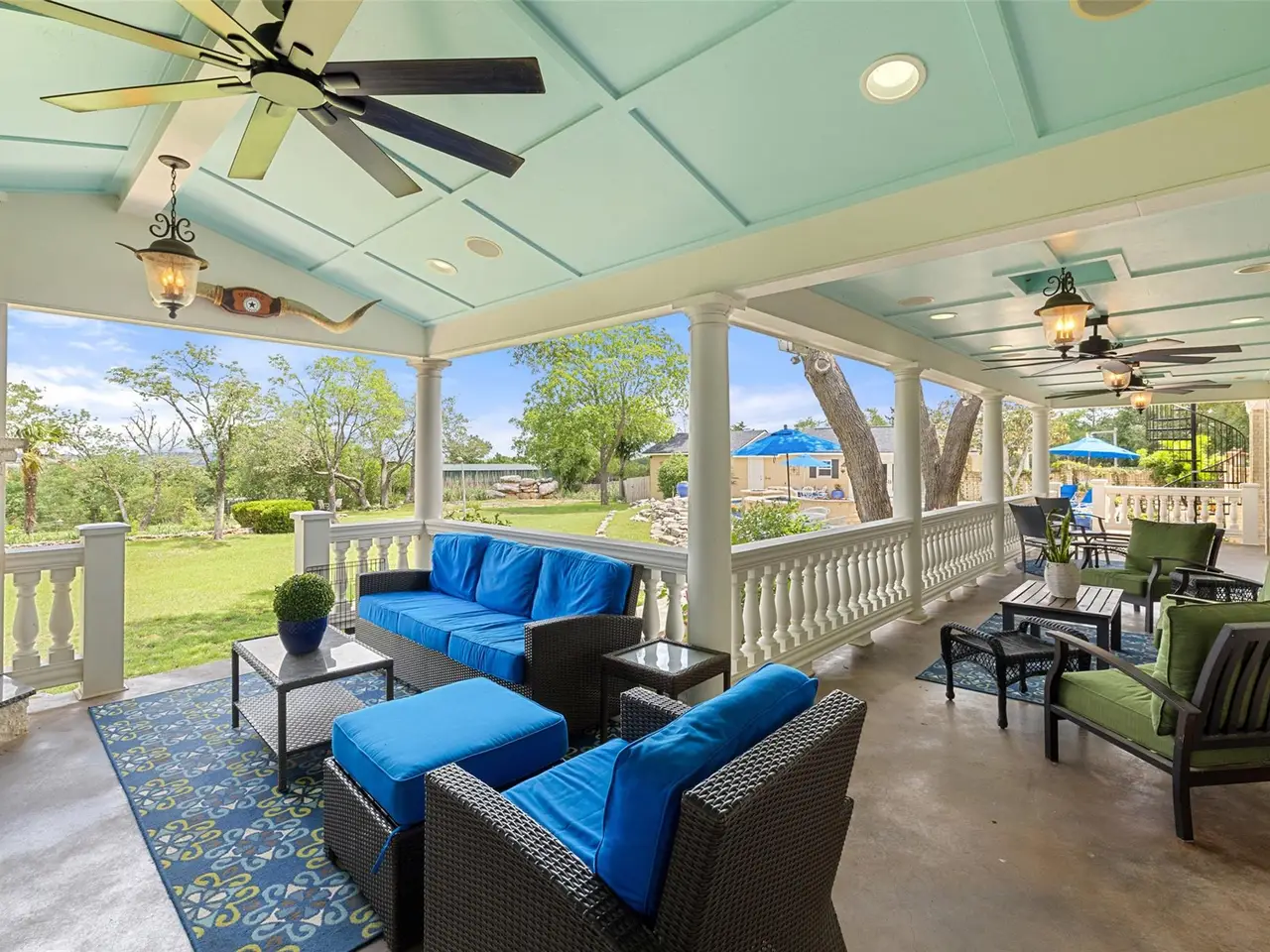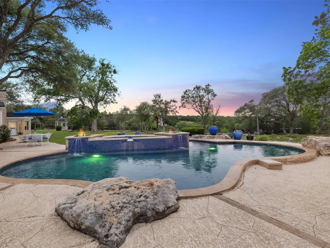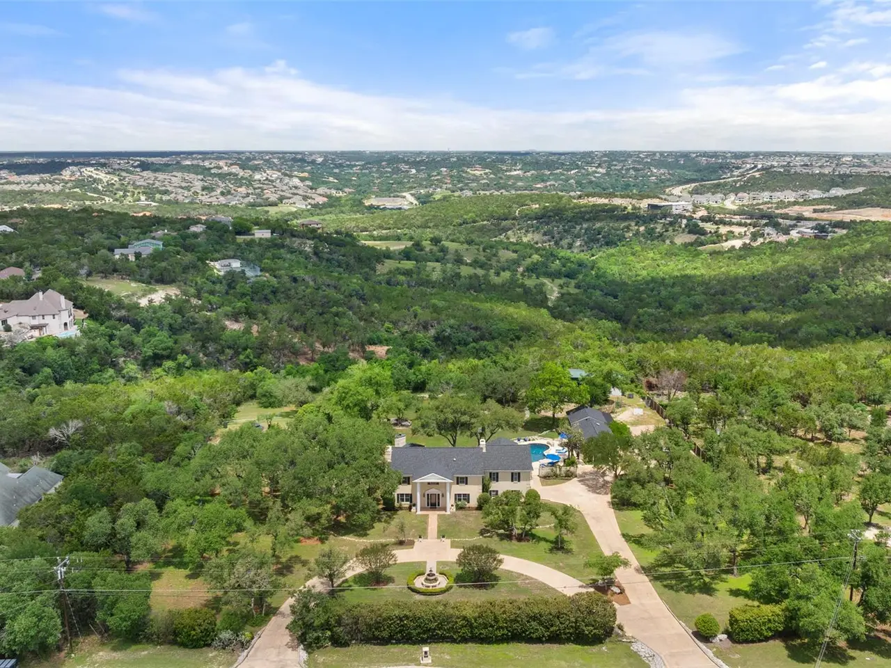 Nestled on a scenic ridge in Leander, this stunning 4-acre Hill Country estate offers sweeping panoramic views and luxurious indoor-outdoor living. Surrounded by mature oaks and native landscaping, the elegant brick and stucco home feels like a private retreat, just minutes from Lake Travis, top-rated schools, and the amenities of Cedar Park and Northwest Austin. Nature lovers will appreciate the nearby Brushy Creek Regional Trail and the Louis Rene Barrera Indiangrass Wildlife Sanctuary. Inside, natural light floods the open-concept layout through expansive windows that frame breathtaking vistas. The gourmet kitchen is a chef's dream with high-end appliances, granite countertops, and custom cabinetry, flowing seamlessly into a spacious living area anchored by a striking brick fireplace. Additional highlights include skylights, surround sound, a formal dining room with its own fireplace, a butler's pantry, and a wine refrigerator. The primary suite is a true sanctuary with a spa-like bathroom, terrace access, and a private spiral staircase. Spacious guest bedrooms offer comfort and privacy, while the outdoor space is built for entertaining: a large covered patio, sparkling pool, outdoor kitchen with built-in grill, fireplace, and integrated sound system. A detached, climate-controlled office offers a quiet workspace, while the two-car garage with epoxy flooring is ideal for a gym, second office, or workshop. The charming guest house includes a full kitchen, bathroom, and its own two-car garage. Rounding out the estate is a full sport court for basketball or pickleball and a versatile barn with stables and enclosed storage. This estate is a rare blend of Hill Country charm and modern luxury--just moments from Austin.