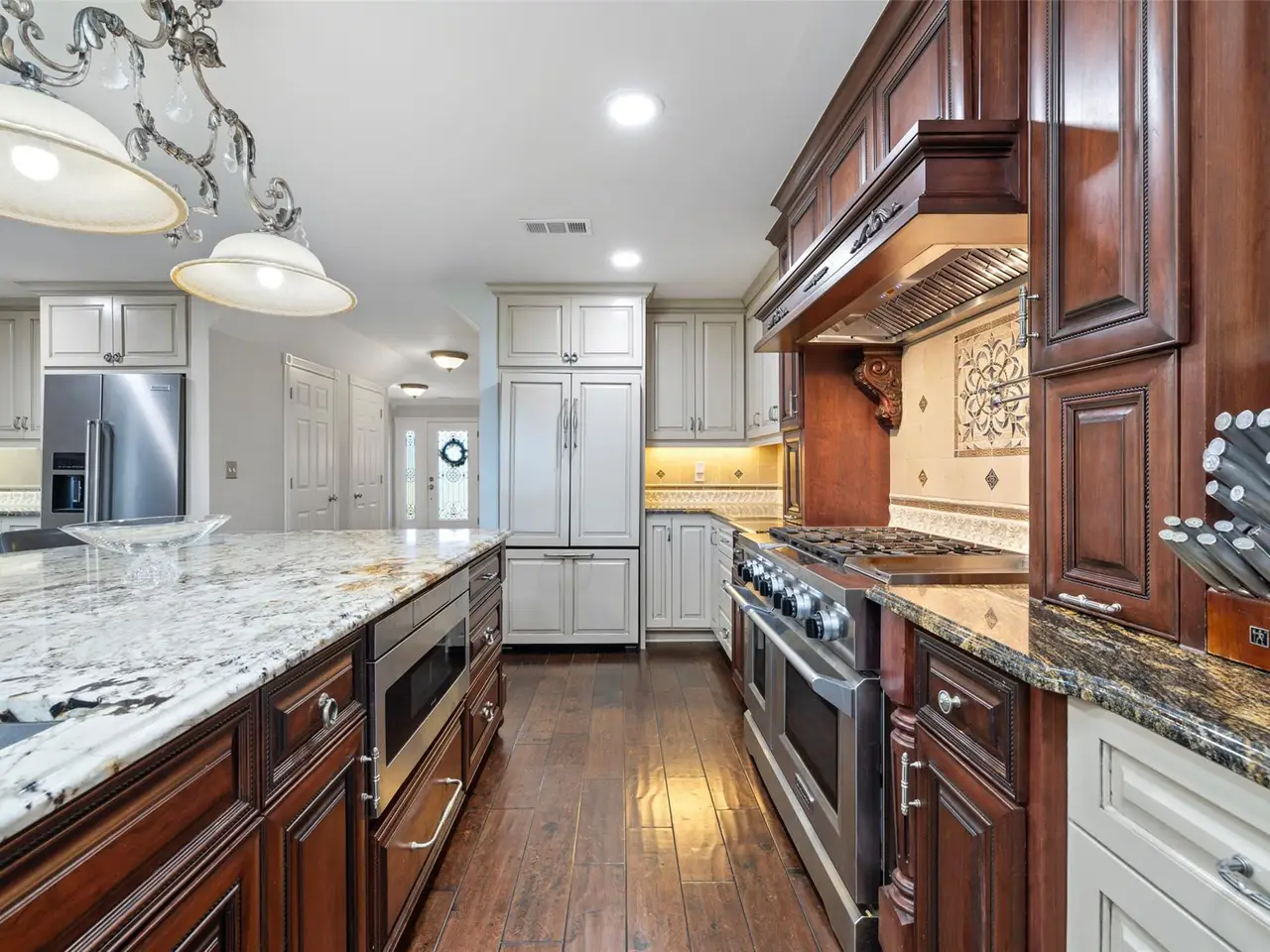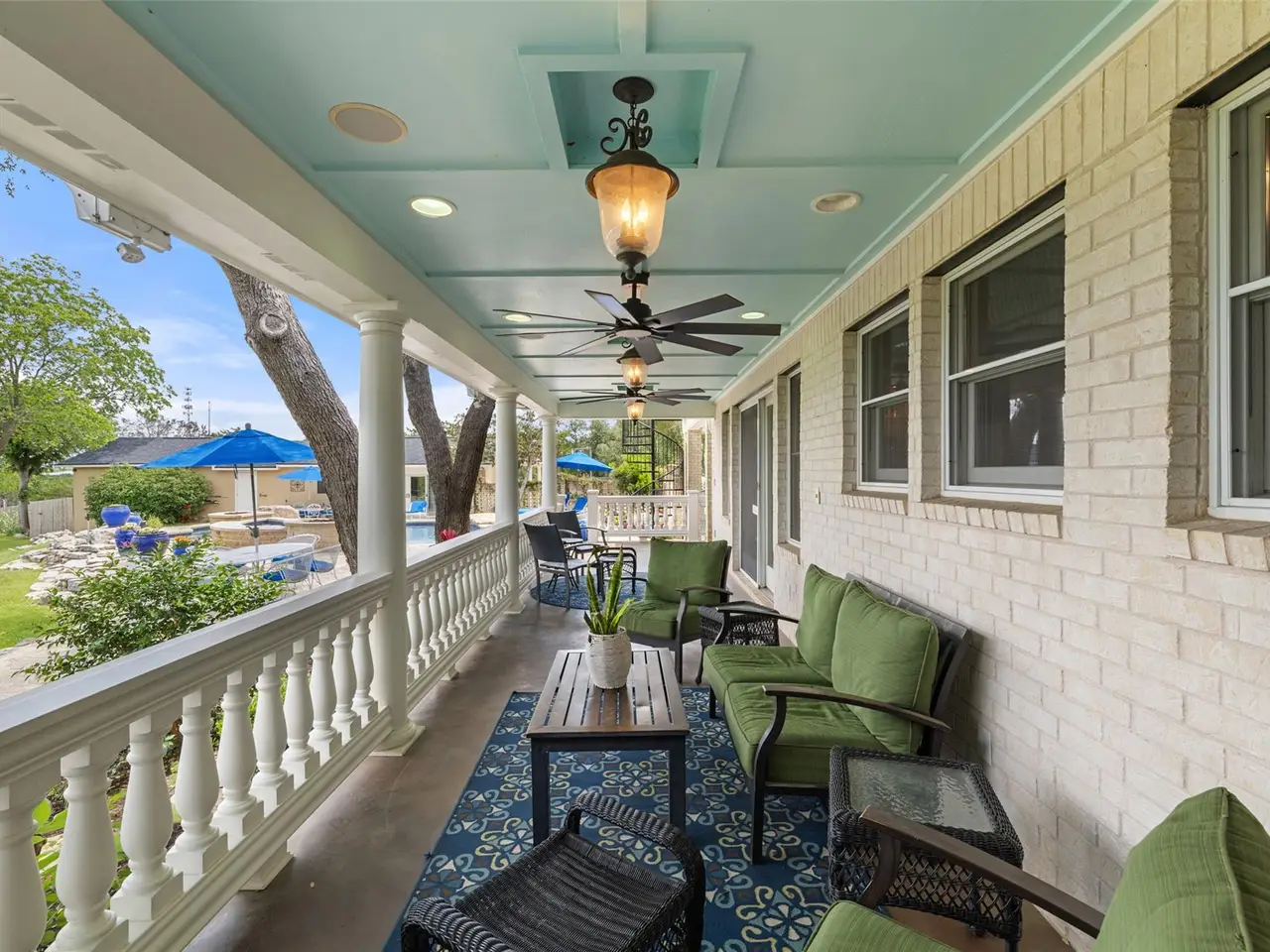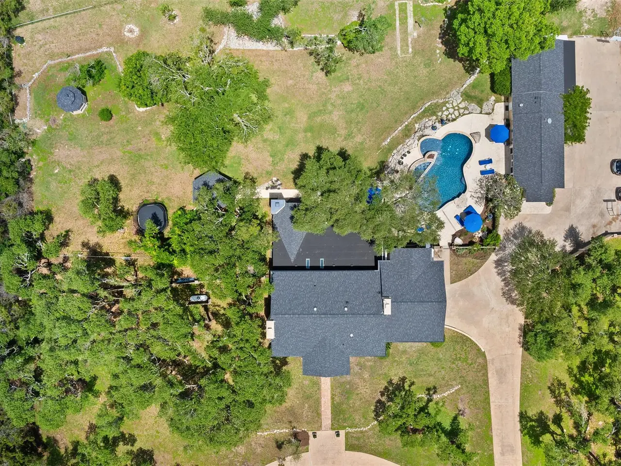 Nestled on a scenic ridge in Leander, this stunning 4-acre Hill Country estate offers sweeping panoramic views and luxurious indoor-outdoor living. Surrounded by mature oaks and native landscaping, the elegant brick and stucco home feels like a private retreat, just minutes from Lake Travis, top-rated schools, and the amenities of Cedar Park and Northwest Austin. Nature lovers will appreciate the nearby Brushy Creek Regional Trail and the Louis Rene Barrera Indiangrass Wildlife Sanctuary. Inside, natural light floods the open-concept layout through expansive windows that frame breathtaking vistas. The gourmet kitchen is a chef's dream with high-end appliances, granite countertops, and custom cabinetry, flowing seamlessly into a spacious living area anchored by a striking brick fireplace. Additional highlights include skylights, surround sound, a formal dining room with its own fireplace, a butler's pantry, and a wine refrigerator. The primary suite is a true sanctuary with a spa-like bathroom, terrace access, and a private spiral staircase. Spacious guest bedrooms offer comfort and privacy, while the outdoor space is built for entertaining: a large covered patio, sparkling pool, outdoor kitchen with built-in grill, fireplace, and integrated sound system. A detached, climate-controlled office offers a quiet workspace, while the two-car garage with epoxy flooring is ideal for a gym, second office, or workshop. The charming guest house includes a full kitchen, bathroom, and its own two-car garage. Rounding out the estate is a full sport court for basketball or pickleball and a versatile barn with stables and enclosed storage. This estate is a rare blend of Hill Country charm and modern luxury--just moments from Austin.