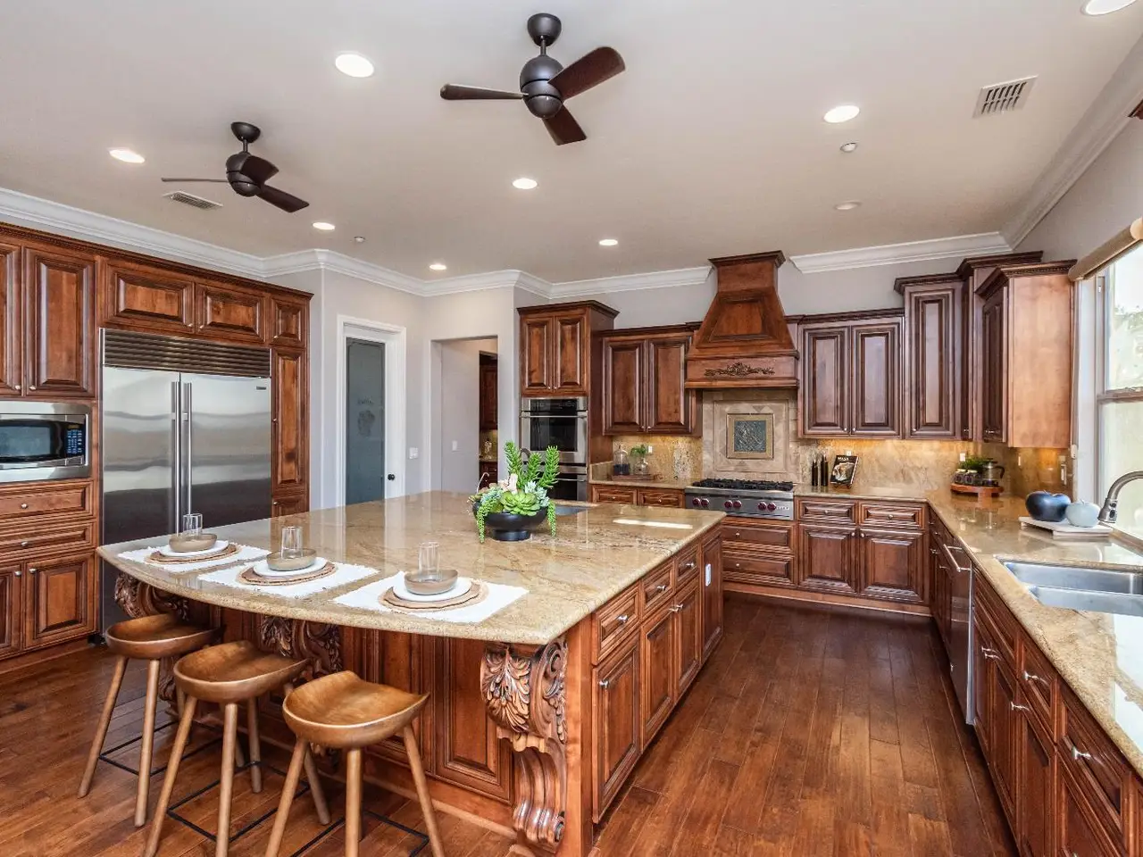 Elegant Semi-Custom Home in the Prestigious Gated Community of Azul. This expansive 5-bed, 6-bath home offers luxury living, complete with a dedicated office & thoughtful design throughout. The gourmet kitchen features top-tier stainless steel appliances, including a Sub-Zero refrigerator/freezer, Wolf range, double oven, butler's pantry, massive island & a dumbwaiter. The open-concept layout blends living & entertaining spaces, while formal dining & separate gathering areas provide versatility. Elegant touches include custom built-ins, crown molding & hand-scraped wood floors. All 4 bedrooms are on the main floor with en suite, for comfort & privacy. The lower level offers a private retreat ideal for guests, grandparents, or kids' sleepovers featuring a living area, bedroom, full bath, & direct access to the pool. Enjoy sunset & city light views from the upstairs patio. Outdoor amenities include a built-in BBQ, sports court, putting green & pool. A 4-car garage with epoxy floors & recently added Tesla solar complete this 1.2-acre gem that backs to open space. Residents enjoy scenic trails throughout the neighborhood; Catte Verdera Golf Course is just across the road. Recreation, restaurants, entertainment & shopping are within minutes.