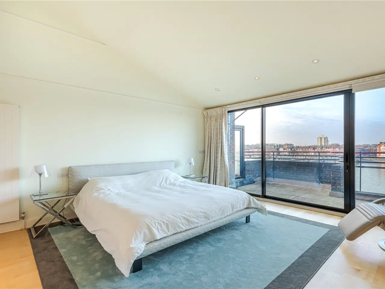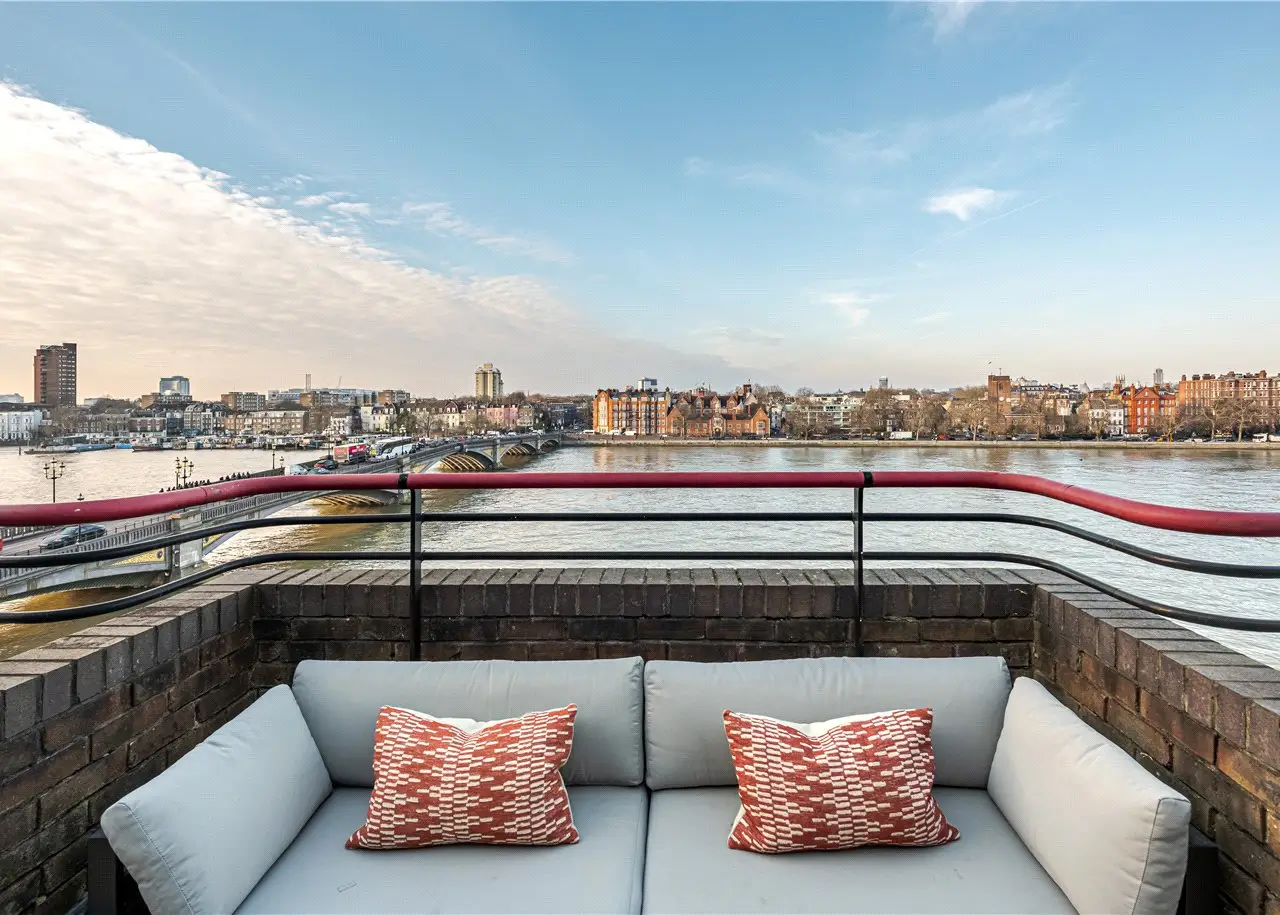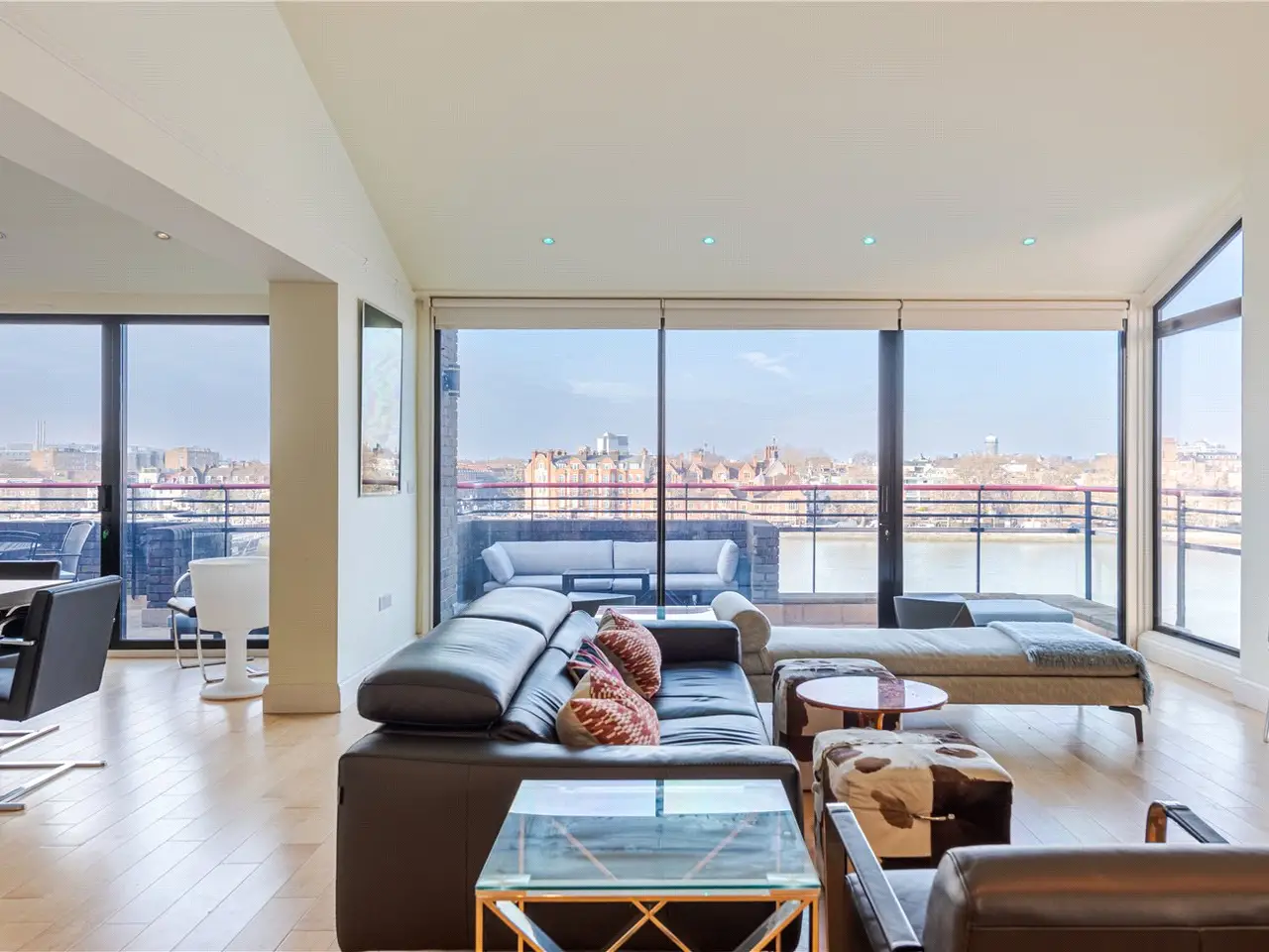 Exceptional 3-Bedroom Duplex with Panoramic River Views and Parking for Three Cars A rare opportunity to acquire an impressively proportioned, river-facing duplex apartment of approximately 2,450 sq ft, offering breathtaking views of both Albert and Battersea Bridges. Occupying the fourth and fifth floors of a boutique riverside development (with lift), this expansive three-bedroom home offers outstanding living and entertaining space with a loft style high ceiling. The main reception level features an open-plan kitchen, dining and living area, flooded with natural light and framed by floor-to-ceiling glass. Three sets of doors open directly onto a generous private terrace with sweeping views across the Thames. The principal suite includes ample built-in storage and a generous en-suite bathroom. Two further large double bedrooms also offer fitted wardrobes and are served by a stylish shower room. Also on the upper level is a study area with access to the balcony that runs the length of the flat and is also accessed via both bedrooms. A separate utility room and WC add convenience, while the property benefits from a day porter and secure parking for up to three vehicles — an exceptional asset in this area. Direct access to the Thames Path places Chelsea, Battersea Park, and both Albert and Battersea Bridges within easy reach. Excellent transport links include buses to Sloane Square, Central London, and Clapham Junction. The boutiques and cafés of Parkgate Road, including Bayley & Sage, are moments away, with King’s Road and Battersea Power Station also easily accessible. Council Tax Band H £1,980 per annum.