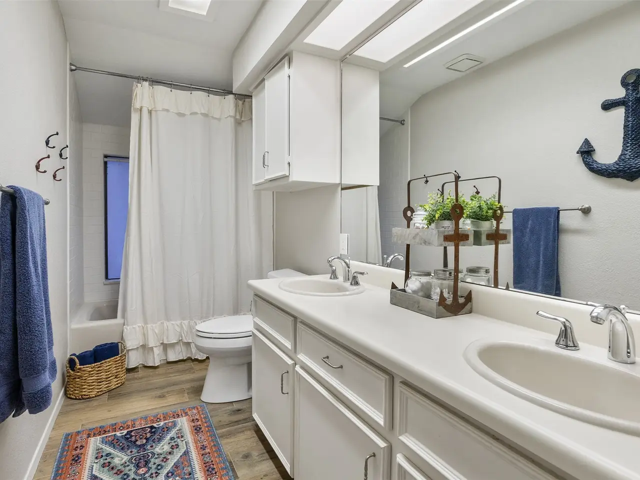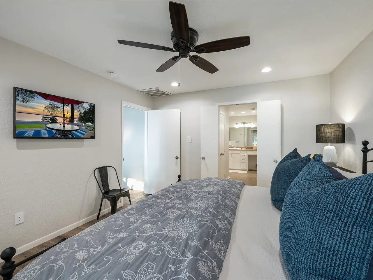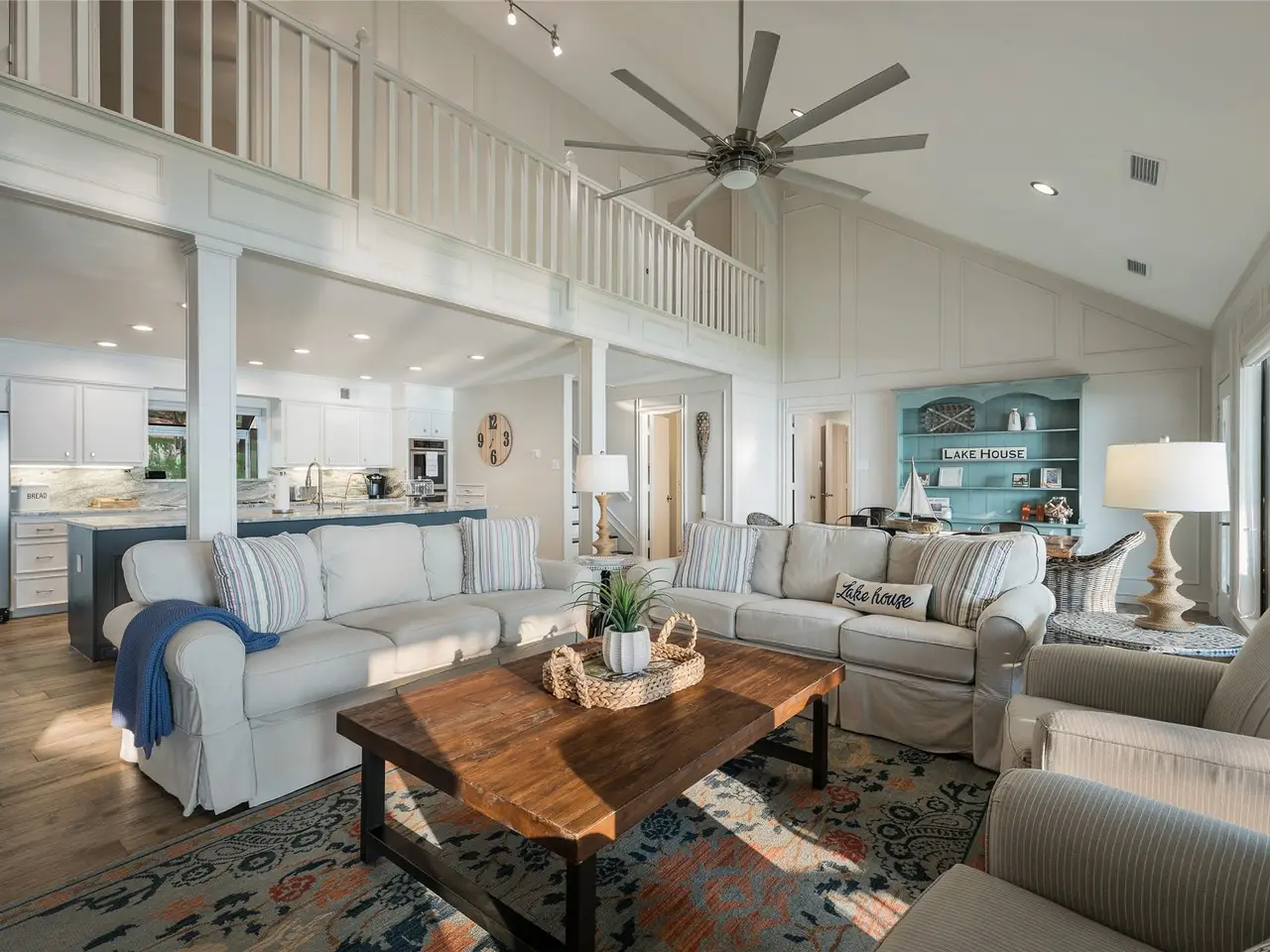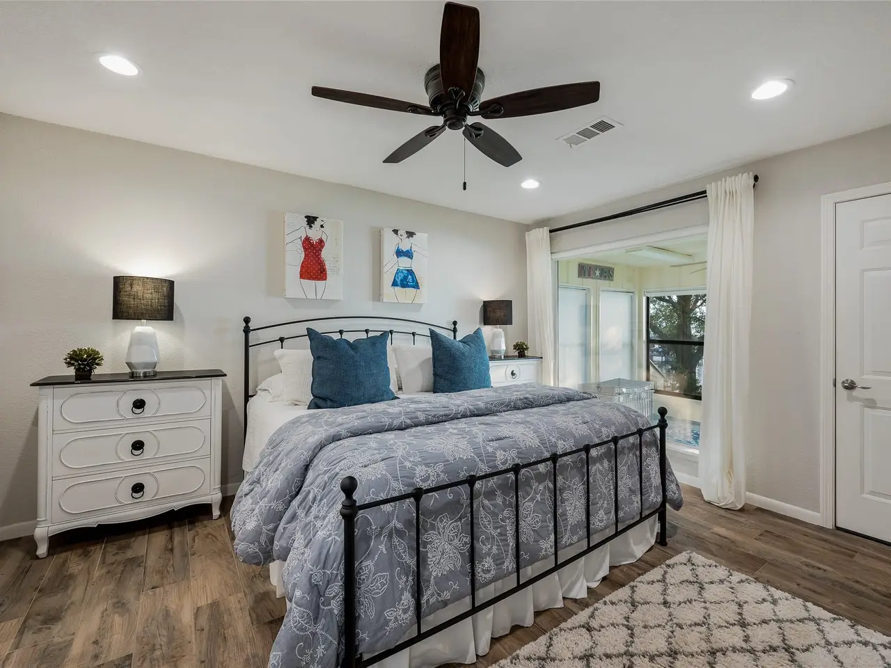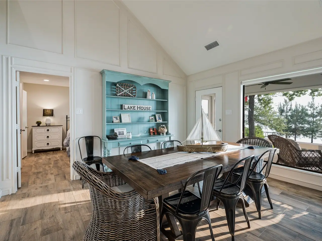Stunning double lot estate with main home and guest house totaling 3,165 sf on one-half acre with wide open water views and some of the deepest water you'll find on Cedar Creek Lake. This tastefully updated home gives modern, coastal vibes and has room to sleep and entertain a crowd. The main home has 4 bedrooms, 3 and 1 half baths, soaring vaulted ceilings, wood-burning fireplace, built-in bar with wine cooler, a sunroom that can double as a guest bedroom, full utility room, and walls of glass to the lake. The guest house, built in 2019, shares a deck with outdoor kitchen and includes a bunkroom and full bathroom, kitchen, and laundry. The large, updated boathouse has two boat slips - one is equipped with heavy duty, double cable, double motor lift system for your wake boat - double Sea-Doo lift, and plenty of storage for all your water toys. Extras include a touchless boat cover, spider misting system, sprinkler system from lake pump, golf cart garage, under deck storage with work bench and professional landscaping with outdoor lighting, and a beautiful firepit area at the water's edge to enjoy amazing sunsets.