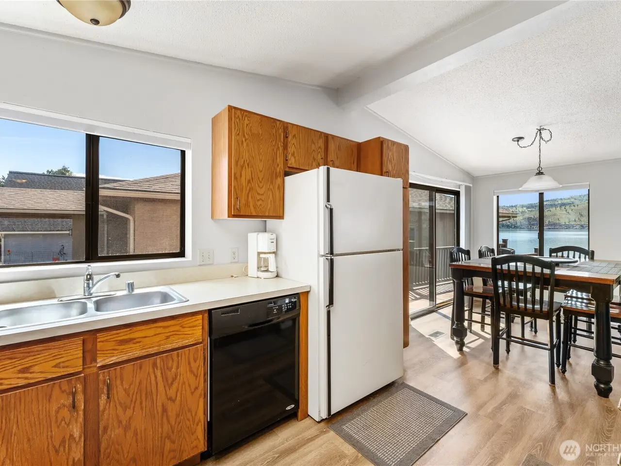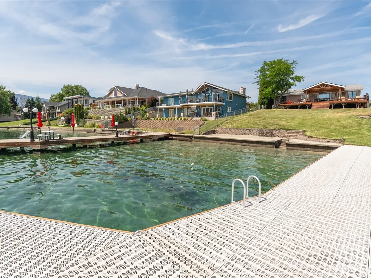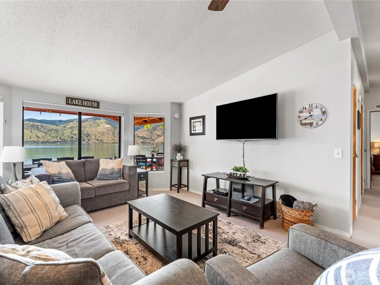 Welcome to 34 Leisure Lane! This rare .9-acre property boasts 56 feet of low bank waterfront with a concrete bulkhead and stairs to a sandy beach. Enjoy a resurfaced shared dock and a stunning, newer lake-facing deck off a charming three bed, two bath, 1,300 square foot home. Two lots (front and back) offer exceptional flexibility and space, including a three-bay shop, four RV hookups, and tons of parking. Mostly flat with a gentle slope - perfect for outdoor living and future development/building. Prime location with easy, level access off a paved road. On sewer, with LCRD domestic water and irrigation. One of the nicest stretches of real estate on Lake Chelan & amongst some incredible new homes and remodels. House plans by Complete Design can be included!