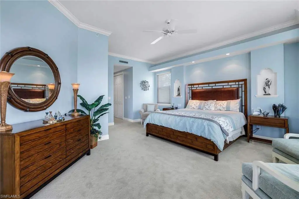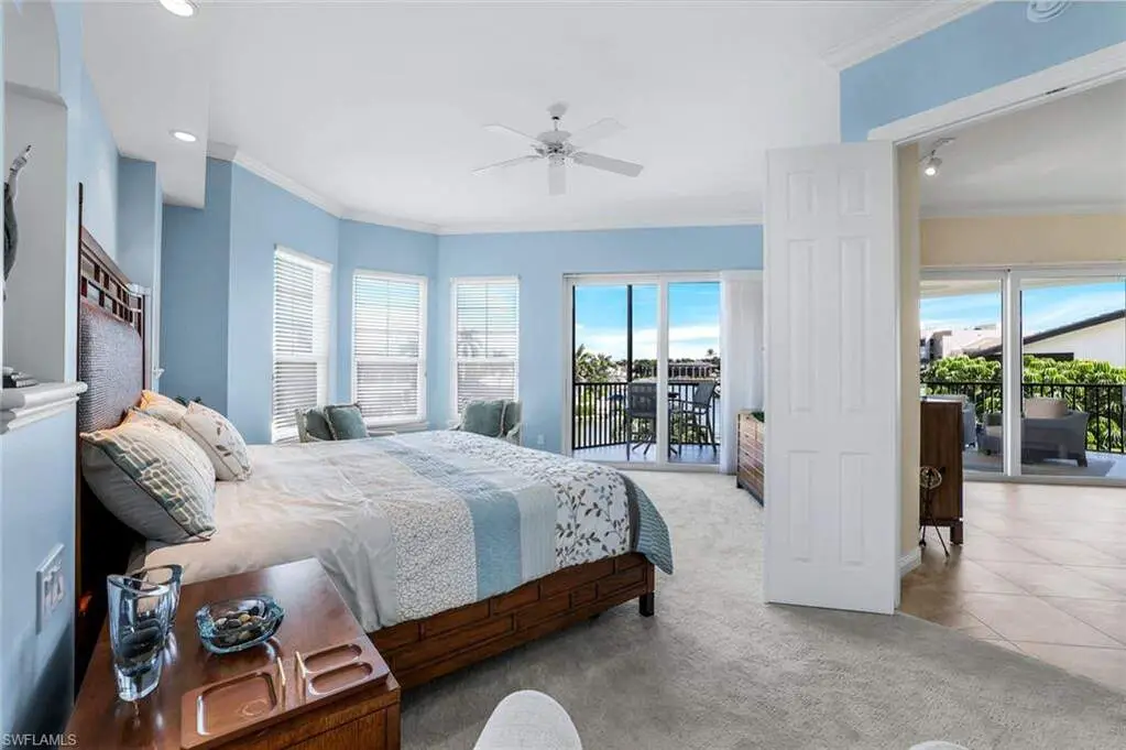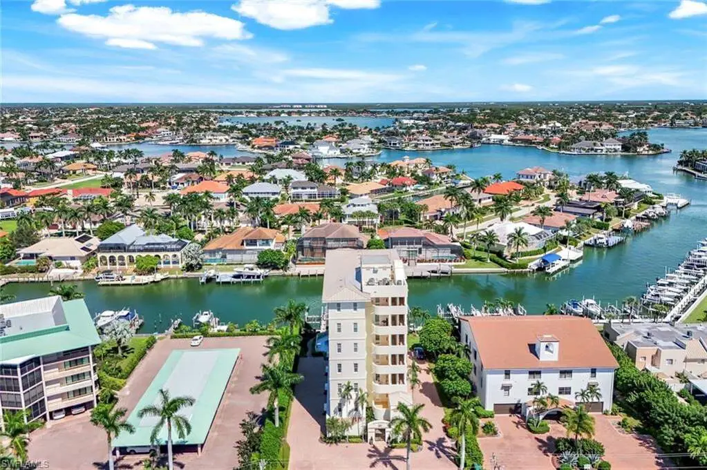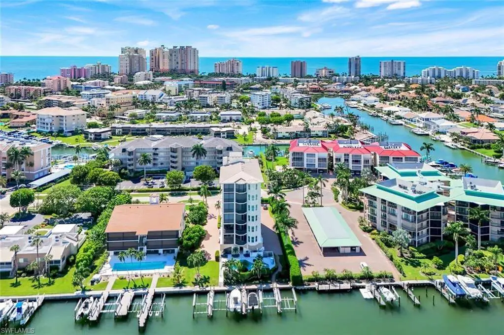 Enjoy stunning long water views from this private, full-floor residence in a boutique, low-density building. This spacious 4-bedroom, 3-bath condominium includes a deeded dock with 12,000 lb lift and offers direct access to the Gulf. Expansive windows and sliders fill the home with natural light, while a front terrace captures sunsets, a 300 sq. ft. lanai provides generous outdoor living, and a large waterside patio enhances the waterfront lifestyle. Updates include a new AC and water heater in 2024, all impact glass throughout exterior, and motorized storm shutters. The renovated kitchen features stainless steel JennAir appliances including an additional drawer refrigerator and freezer with ice maker, quartz counters, wine cooler, wet bar, and custom cabinetry. The spacious primary suite offers bay windows, a sitting area, and a bath with double vanity with brand new quartz counter, tub, and shower. Two guest suites with private baths plus a den with closet provide flexible living. A laundry room with sun balcony and a private air conditioned, oversized 2-car garage with epoxy flooring complete this exceptional property. Condo living with all the luxuries of a private home but less to worry about!