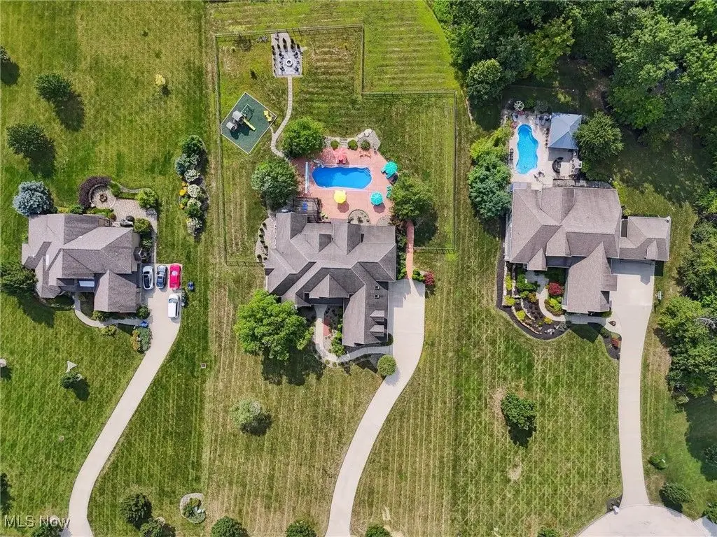 Amazing French Colonial Estate with Resort-Style Amenities built by Legacy Homes nestled on over 2.2 private, manicured acres. Timeless Elegance and Superior Craftsmanship are evident throughout. The main level features a luxurious First Floor master suite complete with vaulted ceilings, a cozy fireplace, glamour bath with dual vanities, tiled shower, jetted tub, 2 spacious walk-in closets, and spa like finishes, along with deck access. The heart of the home is the custom designed chef's kitchen, boasting a center island, stainless steel appliances, eat-in area with access to covered deck that seamlessly flows into the 2-story family room, 2-story great room, and formal dining area. Dual staircases in the front and the back add architectural charm and convenience. First Floor private office with wood paneling, wet bar, and half bath is perfect for work from home or could be a flex room. Upstairs, you'll find three generously sized bedrooms with walk-in closets, one with ensuite full bath and the other 2 sharing a Jack and Jill with separate vanities. In addition to the bedrooms, the upper level has a reading loft that's bathed in natural light that adds warmth and character to the home. The lower level is an entertainer's dreamC/B?B=complete with a full bar, climate-controlled wine room, gym, home theater, and an additional full bath. Step outside to your personal oasis featuring 2 rear decks, an in-ground saltwater pool (2016) with multiple fountain spouts and slide. This outdoor paradise also boasts a fire pit lounge, and playground with protective mulch-ideal for hosting or relaxing in total privacy. Spacious 3-car side-load garage adds to the home's functionality. Every detail has been thoughtfully designed for luxurious living and effortless entertaining. This rare offering blends sophistication, comfort, fun, and privacy in one of the area's most desirable settings. No HOA!