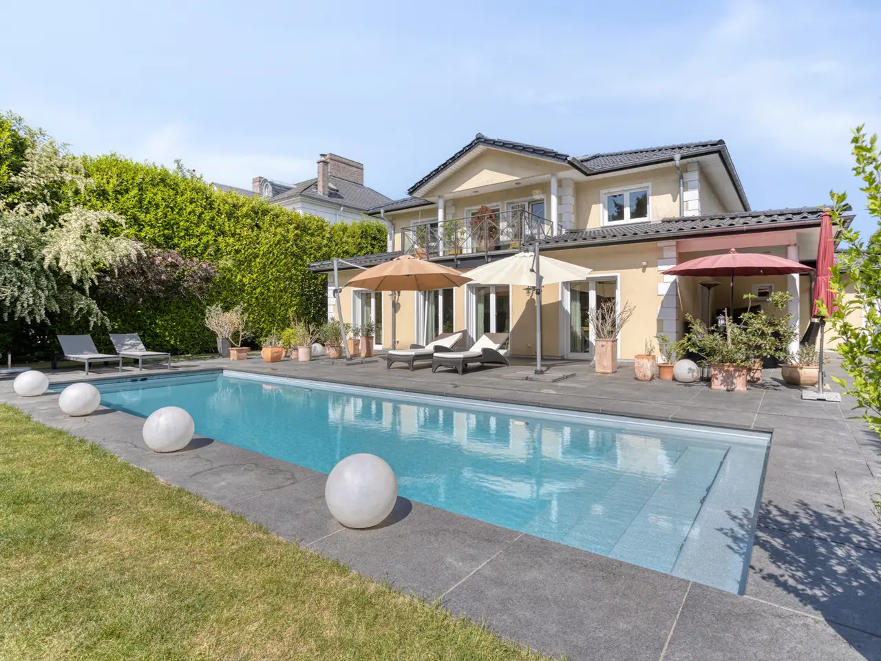 Bring your vacation home, because this villa, built in 2007 on a plot of around 1,175 m², now offers you living at the highest level on approx. 274 m² of living space and a total of 6 rooms, with the heated outdoor pool, the spacious terrace areas and the secluded garden providing a vacation feeling almost all year round. State-of-the-art building technology with fuel cell heating and a photovoltaic system with storage also ensure outstanding energy efficiency. You enter the house via the partially paved front garden, which is enclosed by a fence and wall, through a prestigious reception area into the spacious entrance hall, from where your gaze falls directly onto the high ceilings and the open gallery on the upper floor. From the entrance hall, you enter the kitchen on the left and the guest area with bedroom, small hallway and en-suite shower room on the right. The loft-like living and dining area with around 63 m² of living space is located in front of you. Here, the large marble fireplace creates a cozy atmosphere in winter, while the 5 floor-to-ceiling windows offer a seamless transition to the spacious pool area and garden in summer. This creates interesting axes of light and views, all of which lead through large window fronts into the surrounding garden and pool area. The large terrace by the outdoor pool and a covered outdoor seating area to the side of the house offer plenty of space to enjoy the beautiful days of the year with family and friends. And if you like it sporty, you will find your opponent in the pool's counter-current system. Solar panels in the pool's electric roller cover help to heat the pool in spring. The kitchen is already equipped with a high-quality country-style fitted kitchen and also has a useful storage room and direct access to the double garage. The open-plan staircase leads to the gallery on the upper floor and from there to the four bedrooms on this floor. The air-conditioned master bedroom has a spacious en suite bathroom with shower and bathtub and access to the balcony on this level. All rooms on both the ground and upper floors can be darkened with electric shutters. In the basement, which has a partial cellar, there is a hobby room and the utility room, which also houses the swimming pool equipment. The garden is densely planted and offers plenty of privacy and is barely visible, and is kept wonderfully green with an irrigation system. Next to the pool, an outdoor shower with warm water provides cooling and a small garden shed provides storage space in the outdoor area. The double garage can also be accessed through the garden. This is equipped with an electric door and offers space for further parking spaces in front of it, which are secured from the street by another door. You can also expect high-quality fittings on all levels of the house. Stone and parquet floors, a high-quality fitted kitchen and modern building technology are just a few examples. We cordially invite you to arrange a viewing appointment on site to see the charm and quality of the property for yourself.
