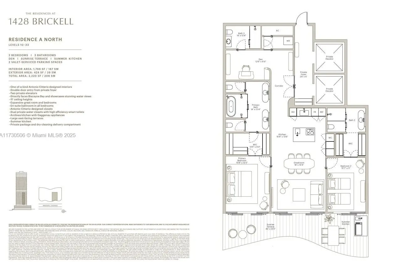 Introducing an elegant two bedroom plus den home at The Residences at 1428 Brickell: An exquisite collection of only 189 residences designed as a private sanctuary within the quintessential Miami skyline. This 1,796 square foot residence features a thoughtfully designed floorplan by ACPV Architects; and includes 11-foot ceilings, an Arclinea kitchen, a deep sunrise terrace w/summer kitchen, a private elevator foyer with 2 elevators, and Citterio-designed signature pieces throughout. Enjoy 80,000 SF of amenities, including a rooftop pool, a two-story owners club, and an entire floor dedicated to health & wellness. The Resort Deck offers a full-floor family-focused space including a pool with shallow wading area, poolside cabanas, an indoor/outdoor children's learning center, cinema screening room & more.