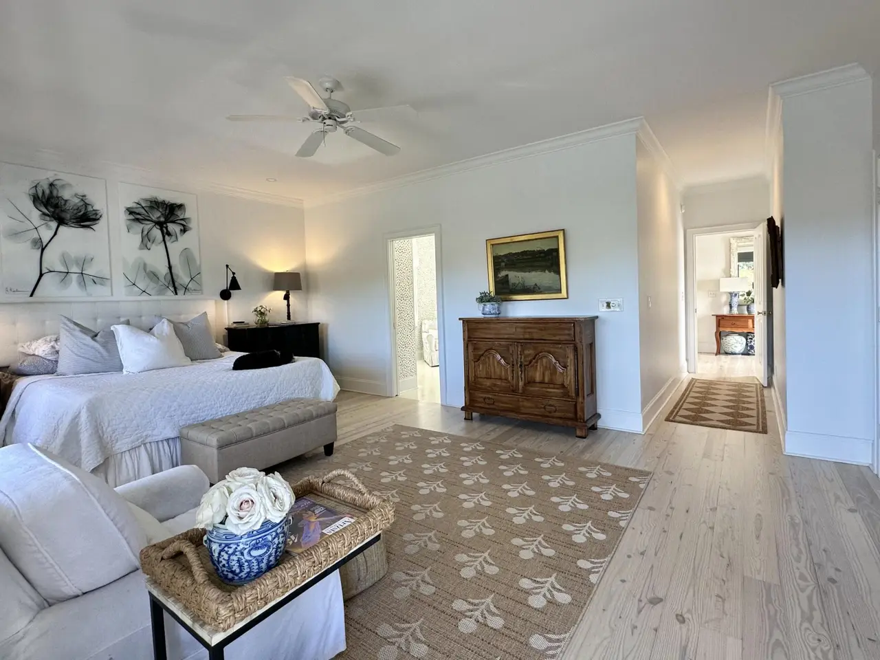 Expansive primary bedroom with lake views