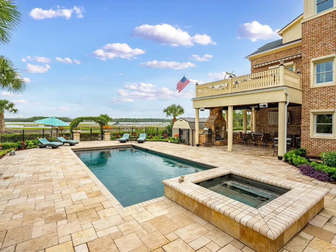 Sparkling pool and spa with sundeck