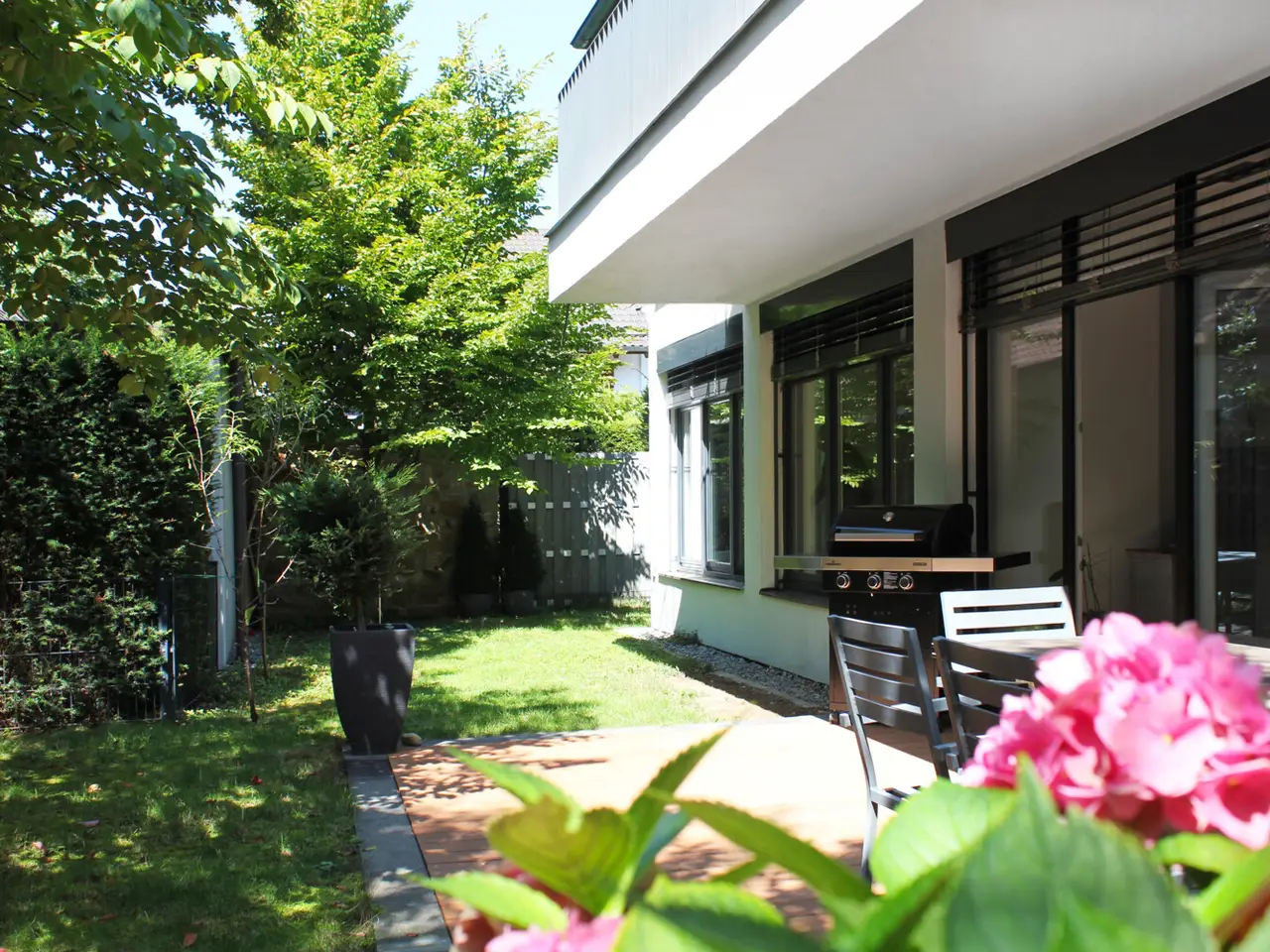 South-west garden with electric blinds