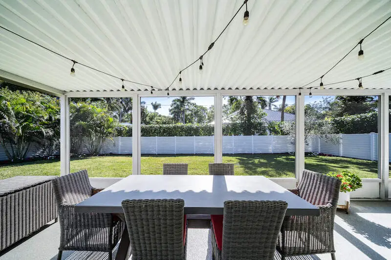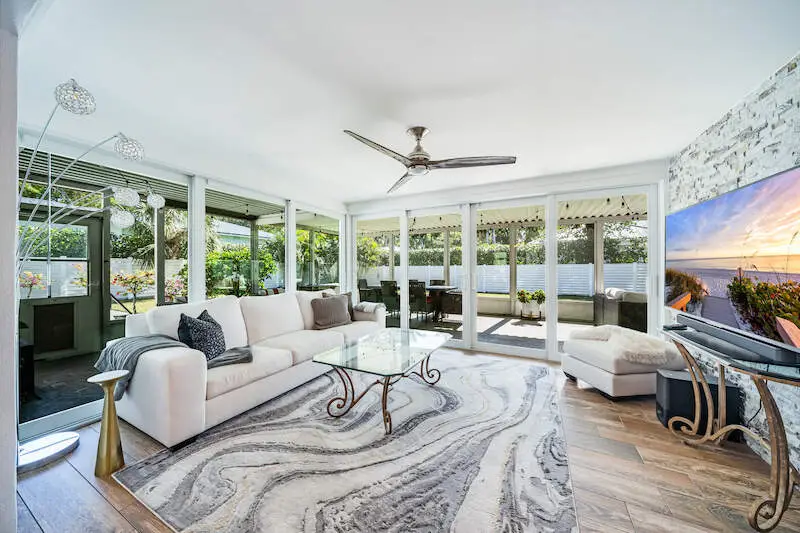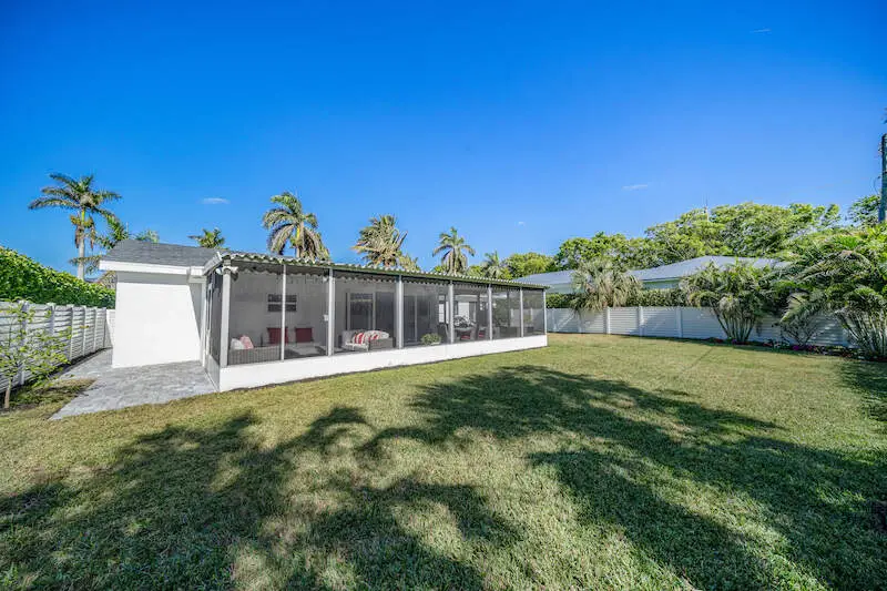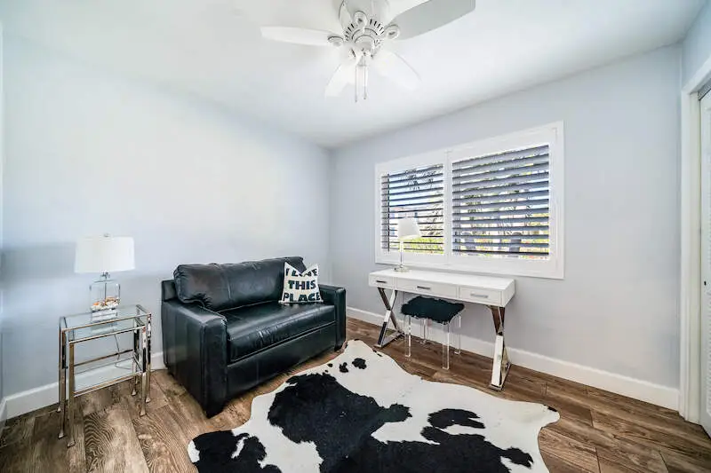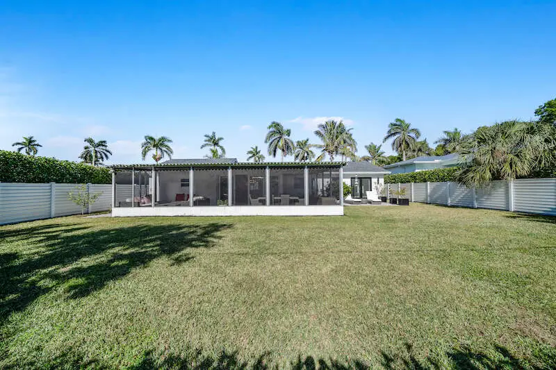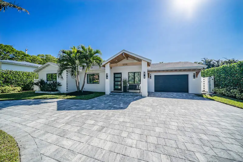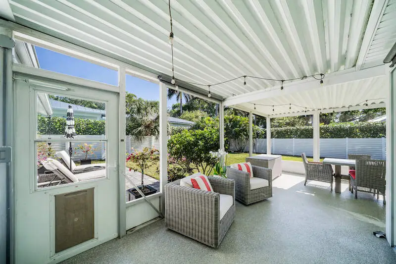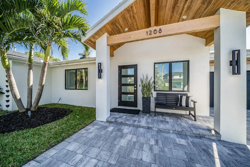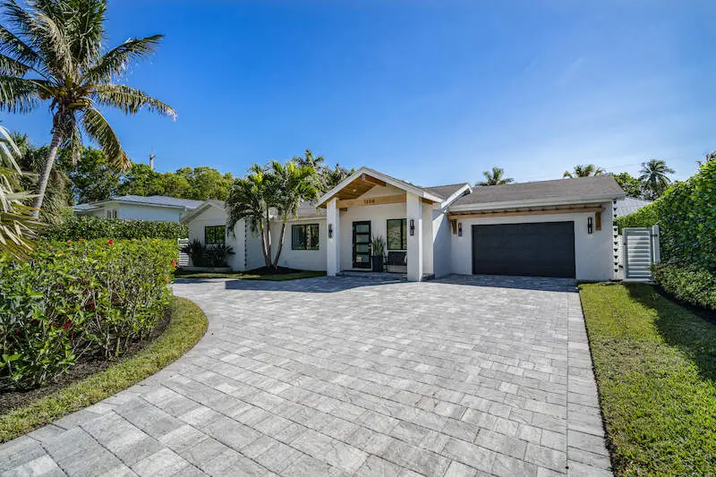 Gorgeous curb appeal!! This absolutely charming 3-bedroom, 2-bath ranch-style home in the desirable Lake Park neighborhood boasts stunning curb appeal with a freshly painted white exterior, bold black trim, main roof is asphalt shingles, metal lanai roof, and tasteful wood detailing accents. The inviting front porch, new light fixtures, and paver driveway with governors circle driveway for extra cars enhance the welcoming aesthetic. The beautifully landscaped yard is framed by newer white PVC privacy fencing and a gated rear yard. Decorative metal rain gutter downspouts add a touch of sophistication, creating a Santa Barbara-inspired exterior that feels crisp and contemporary. Inside, the open-concept layout is modernized with seamless "wood-look" tile plank flooring throughout, the kitchen features lighter creamy cabinetry, a tiled backsplash, breakfast bar, and high-end appliances including a WOLF electric cooktop and oven, BOSCH dishwasher, and French door refrigerator/freezer. The owner's suite offers an en-suite bath and dual closets, while the guest suite opens to a paver patio overlooking the private backyard. The renovated guest bathroom includes white tiled shower walls accented with mosaic bands, a floating double-sink vanity, and extra storage. A glass-enclosed family room with tile plank floors, a stone accent wall, and a ceiling fan provides additional living space, while the screen-enclosed porch with epoxy flooring and string lights is perfect for relaxing or entertaining. The oversized 1.5 garage features built-in storage rack and the enclosed laundry room is equipped with Samsung front-loading washer and dryer. With its lushly landscaped and private backyard, proximity to top-rated schools, trendy restaurants, and Naples' sunny beaches, this home offers a perfect blend of classic charm and modern living in a highly sought-after walking community.