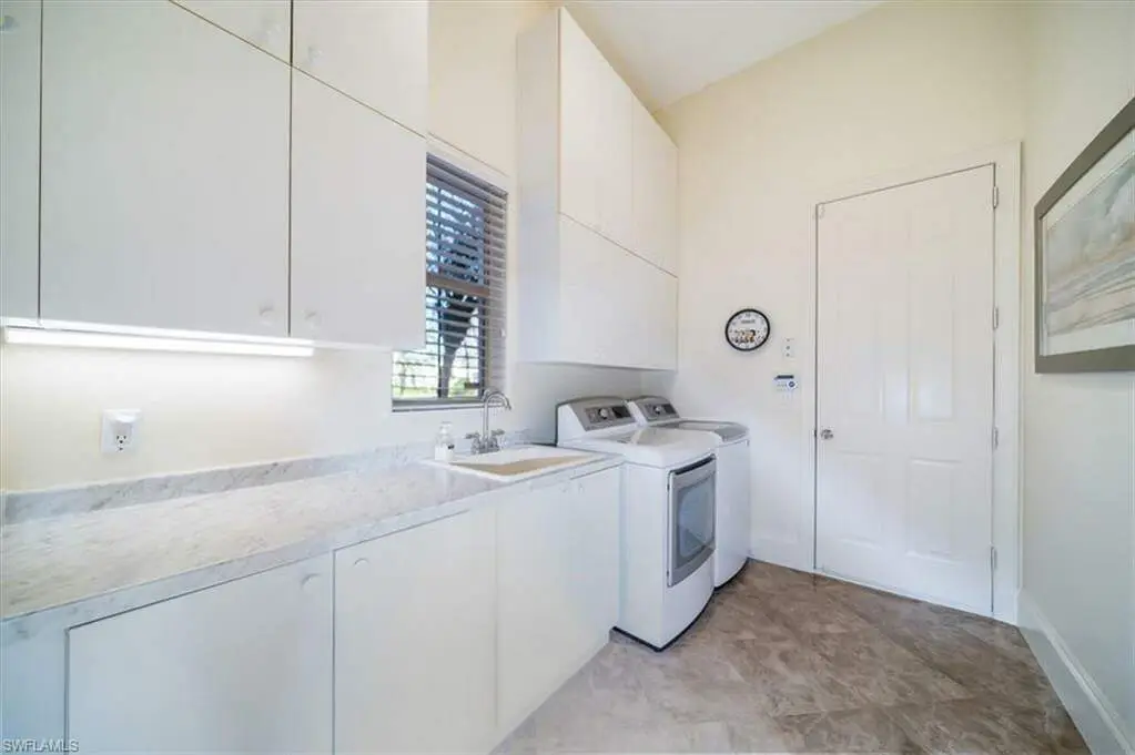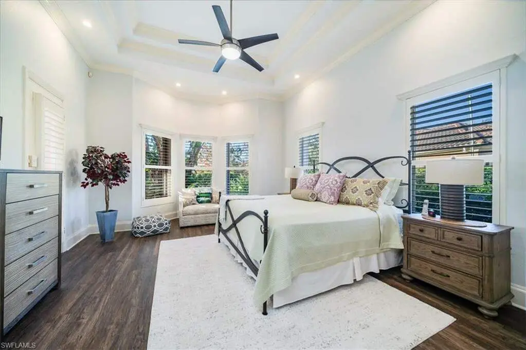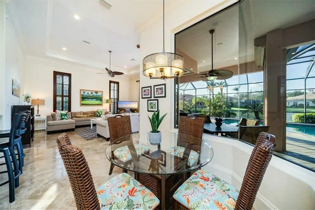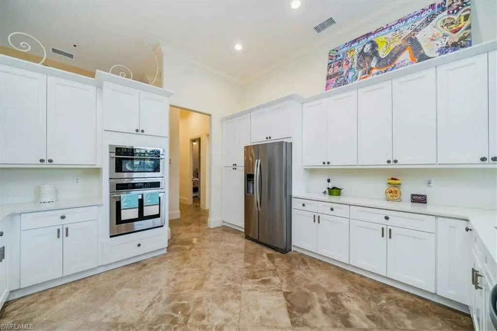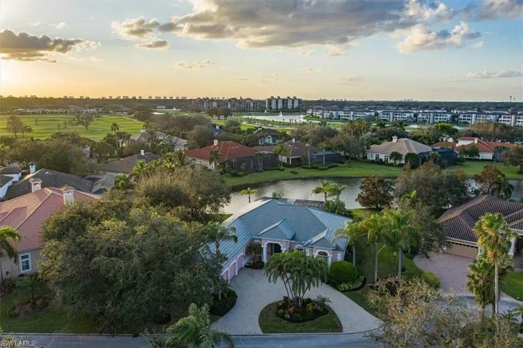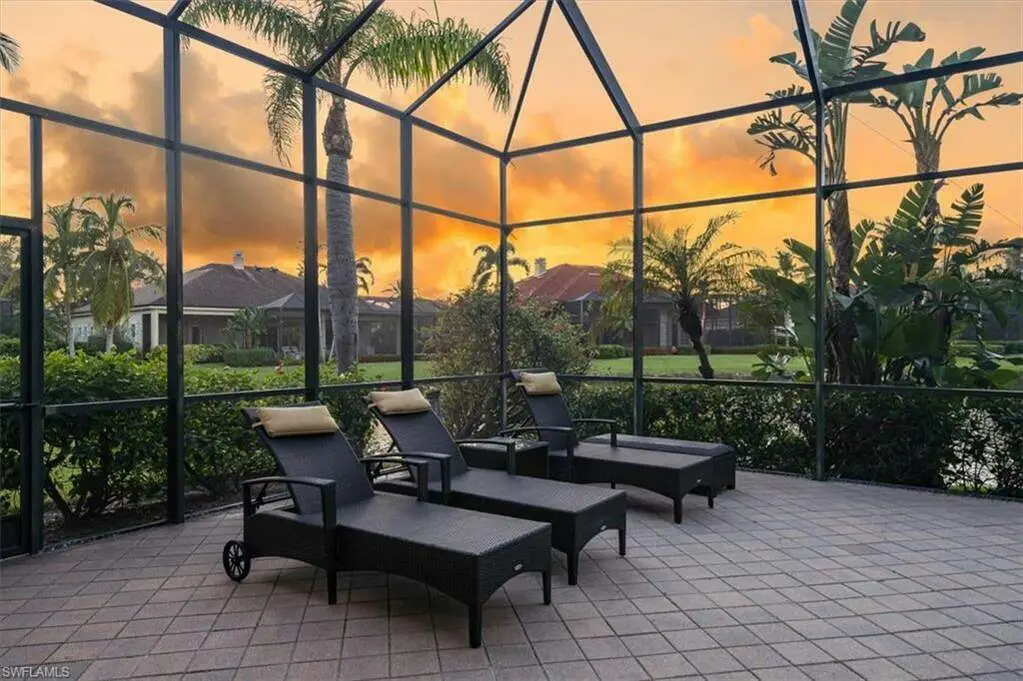 Nestled behind the gates of the prestigious Vineyards Country Club, this custom-built residence is a rare gem that showcases exceptional craftsmanship, thoughtful design, and a host of luxury upgrades that set it apart. December 2023 NEW ROOF!! Nestled behind the gates of the prestigious Vineyards Country Club, this custom-built residence is a rare gem that showcases exceptional craftsmanship, thoughtful design, and a host of luxury upgrades that set it apart. Designed by a discerning builder for personal use, the home offers numerous high-end extras not commonly found, including soaring ceilings that create a grand sense of space and scale, extensive custom millwork, and refined architectural details throughout. From the moment you arrive, the curb appeal is striking-with a stately governor's paver driveway, side-entry 3-car garage, and lush, mature landscaping enhanced by fresh mulch, all situated on a quiet, oversized cul-de-sac lot offering unmatched privacy and picturesque lake views. Inside, the elegant marble-floored foyer opens to a gracious living room with coffered ceilings and seamless flow to the expansive screened lanai, ideal for indoor-outdoor living. The home's layout is both functional and inviting, with formal and casual dining areas, an updated white kitchen with solid-surface countertops, a breakfast bar, and a glass-enclosed breakfast room bathed in natural light. The oversized family room and outdoor summer kitchen make entertaining effortless. Each guest suite is a private retreat, with luxury vinyl "wood look" flooring, custom double closets, and individual bath access that have been remodeled and updated. The owner's wing is a sanctuary, offering two walk-in closets, lanai access, and a spa-inspired bathroom with a walk-through shower and dual vanities. An additional flexible space serves as a fourth bedroom or office, and the third garage bay has been transformed into an air-conditioned bonus room, ideal as a game room, gym, or "mancave." A prime location within one of Naples' most established and amenity-rich communities, this residence is the perfect blend of elegance, comfort, and thoughtful upgrades.