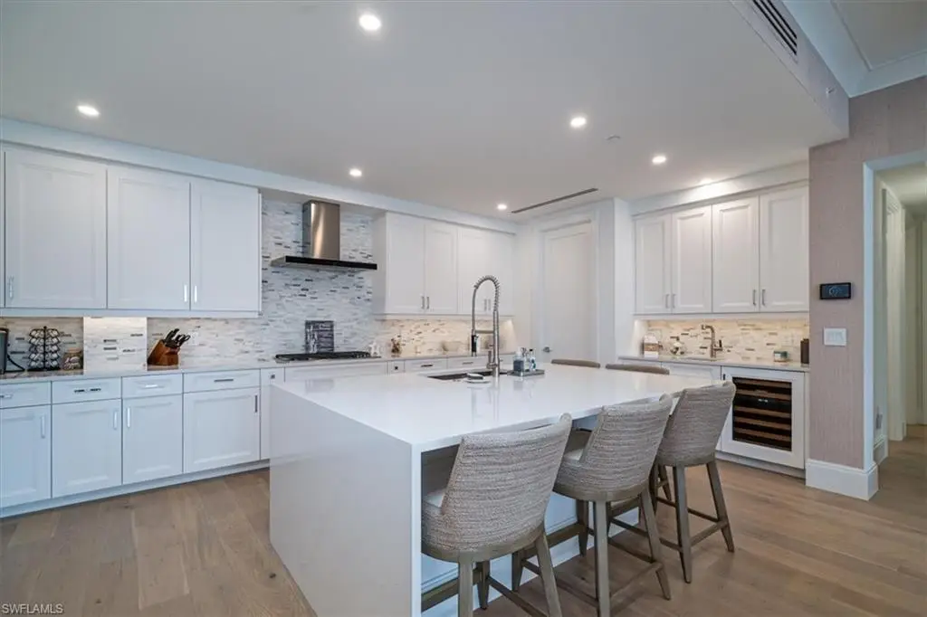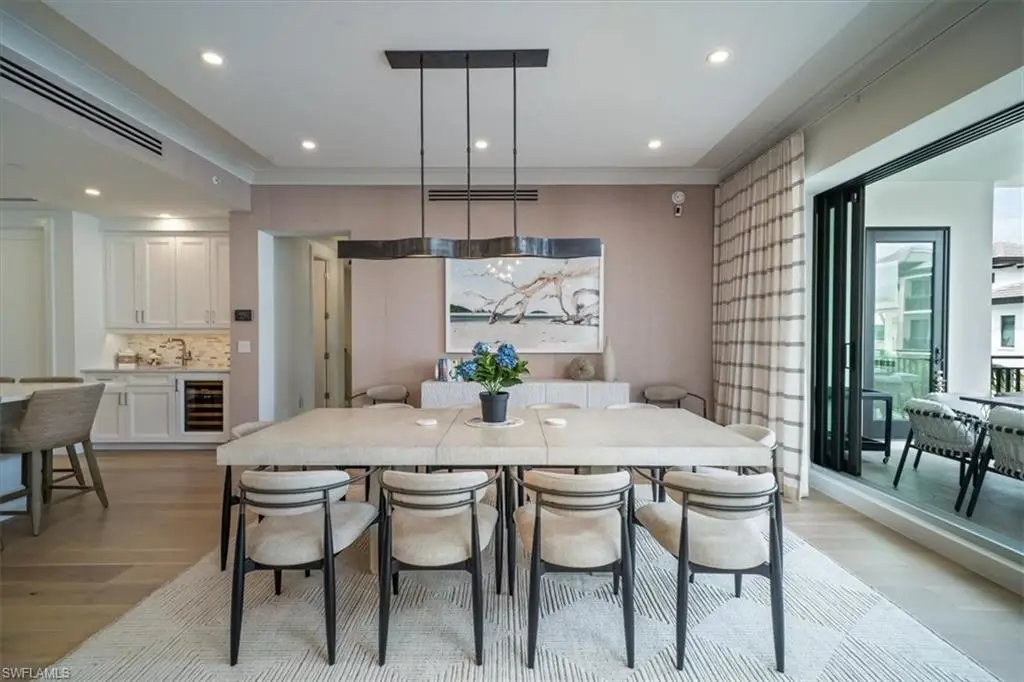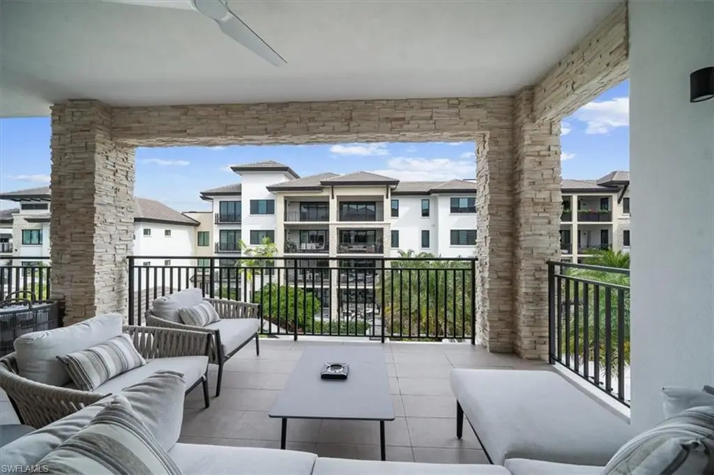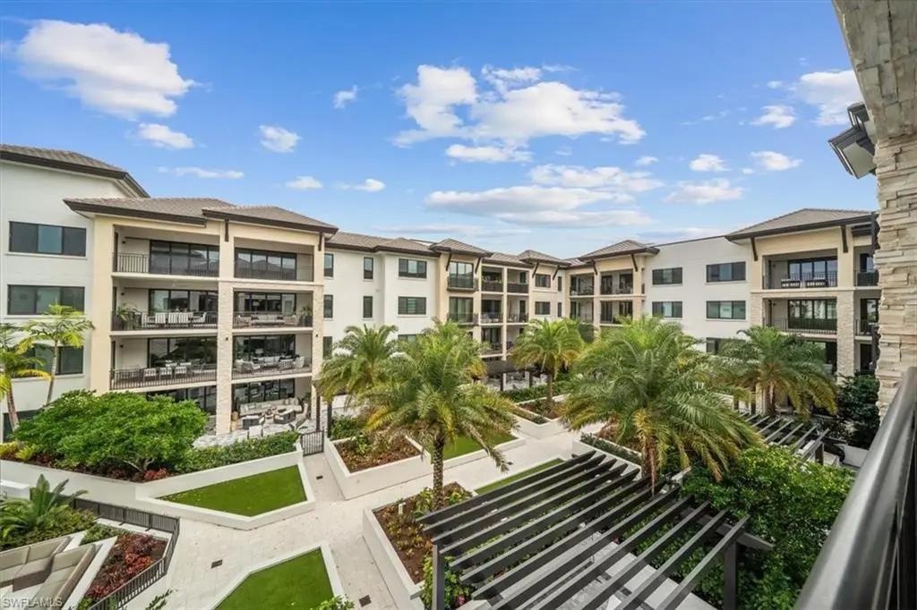 Welcome to residence 404 at Quattro, which showcases the elegant "Bianca" open floor plan, featuring 4 bedrooms, a den, and 4.5 baths. Rarely lived in, this residence is the largest available, offering 3,437 square feet of air-conditioned space, a 438-square-foot balcony, and soaring 10-foot ceilings. The expansive 36-foot balcony faces east, providing stunning views of the meticulously landscaped courtyard and resort-style pool. Furnished with custom high-end pieces and designer lighting curated by a New York interior designer, no detail has been overlooked. The home boasts rich wide-plank hardwood floors, impact-resistant doors and windows, and a chef's dream kitchen complete with a large quartz island, wet bar with wine cooler, and professional-grade Sub-Zero, Miele, and Wolf appliances, including natural gas cooking. Additional features include two deeded parking spaces in the gated garage, EV charging capabilities, and a climate-controlled storage unit. Quattro's amenities are second to none, with a heated pool and spa, fire pit, outdoor pavilion with gas grills, a state-of-the-art fitness center, and a stylish clubroom equipped with a bar, terrace, large-screen TV, and billiards room. Located in the heart of Naples' Design District, Quattro offers unparalleled access to Fifth Avenue South, Third Street South, and the pristine sugar-sand beaches. The vibrant Bayfront area with its restaurants and shops is just across the street, and the upcoming Gulfshore Playhouse is within walking distance. A masterpiece of British West Indies and Coastal Contemporary architecture, designed by the renowned MHK Architecture & Planning, Quattro is the crown jewel of Naples Square.