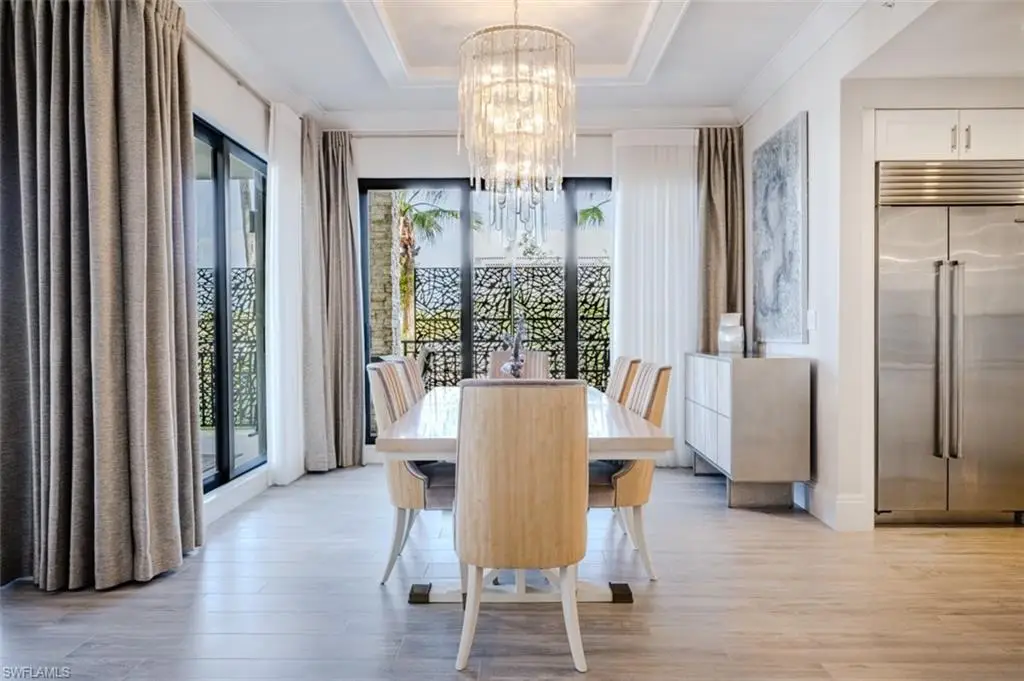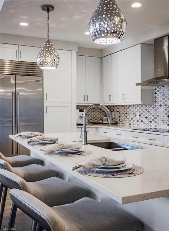 Experience Elevated Living in the Heart of Naples. Step into nearly 2,500 square feet of refined elegance in this stunning former model residence, located in the prestigious Naples Square community. This expansive 3-bedroom + den, 3-bathroom condominium perfectly blends contemporary design with luxurious comfort. Crafted for those with discerning taste, the residence showcases exceptional finishes throughout - motorized Hunter Douglas blinds, custom designer lighting, and a chef's kitchen that's as functional as it is beautiful. Outfitted with premium appliances including Wolf, Sub-Zero, Bosch, and Zephyr, the kitchen features a spacious quartz island, induction cooktop, smart wall oven, and a striking marble backsplash, making it a true culinary showpiece. The open-concept layout effortlessly connects the kitchen, dining, and great room, creating a spacious and inviting atmosphere ideal for entertaining or everyday living. Oversized sliding glass doors lead to a generous terrace with expansive views, creating a seamless transition between indoor and outdoor living. Sophisticated fixtures and modern design elements add warmth and depth throughout the home, while the building itself offers a suite of world-class amenities. Enjoy the resort-style pool and spa, outdoor grilling area, a state-of-the-art fitness center, and an elegant club room with billiards and large-screen TVs. Additional features include one reserved parking space in the secure, lower-level garage, an additional unassigned space, a humidity-controlled storage locker, and covered bike storage. Pet lovers will appreciate the community's welcoming pet policy. Located just steps from the boutiques and fine dining of Olde Naples, the newly built Gulfshore Playhouse, Bayfront, and Baker Park, this residence offers the ultimate in walkable luxury living. Moments from the sugar-sand beaches, this home invites you to embrace the very best of the Naples lifestyle.