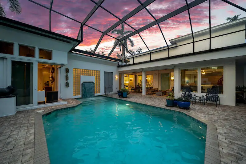 Situated in one of Olde Naples' most sought-after locations, this high-elevation home offers unparalleled peace of mind with NO water damage and lower flood insurance costs thanks to its placement in the X500 flood zone. The property sits on a 14,000+ square foot corner lot with lush landscaping, offering privacy and a perfect blend of luxury, convenience, and coastal elegance. Recently remodeled between 2021- 2023, the home showcases top-tier finishes on par with brand-new construction built in 2022. The front elevation was expanded to include a new metal raised single-seam roof, an open 2-story foyer, glass double doors, and an elevator area. Inside, you will find European French white oak engineered hardwood flooring, soaring ceilings from 12 to 18 feet high, and IMPACT windows throughout. The chef's kitchen is equipped with white shaker cabinetry, an oversized island with black accent cabinetry towards the dining room and luxurious quartz countertops with a waterfall edge, complemented by DACOR 6 burner 2 oven gas cooktop, VIKING microwave/convection oven, and a SUBZERO side-by-side refrigerator. The spacious home includes a music room, large den, open loft space, and an expanded laundry/butler's pantry. The owner's suite occupies its own private wing with a large walk-in closet, extra built-in doored storage & closet system, a bedroom with walls of windows and sliders leading to the private pool and spa. The spa-like bathroom featuring a walk-through shower with multiple shower heads, dual vanities, and a private water closet. Upstairs, the home offers three large guest suites, each with ample closet space, natural light, and balcony access from two of the suites. The exterior features the most thoughtfully mature plantings, trees and flower beds, Bahama shutter accents, LED landscape lighting, and a handcrafted shell-stone driveway and walkway. The covered lanai has new electric rolling "sun and storm" screens, and the pool and spa area are enclosed for added protection. All of this sits just three blocks from the beach, the new Four Seasons, NCH, and all the amenities of Olde Naples. Positioned on a quiet street with no thru traffic, this home is the ideal mix of modern design, top-of-the-line finishes, and the privacy and convenience you have been looking for. WITH NO hurricane damage at all, this home is ready for its next lucky owner.