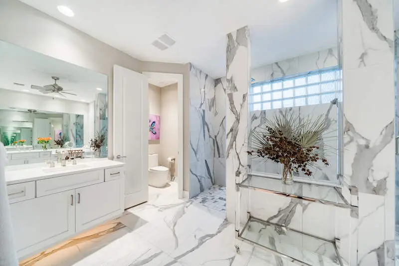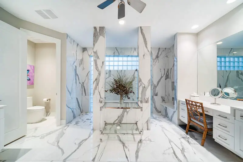 Spa-like bathroom with walk-through shower