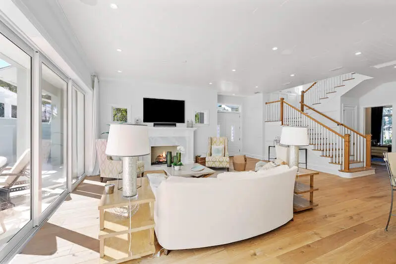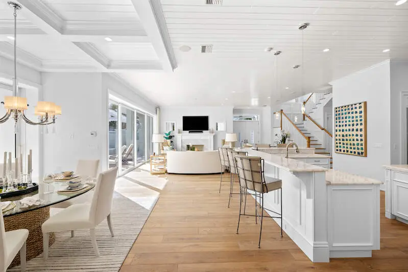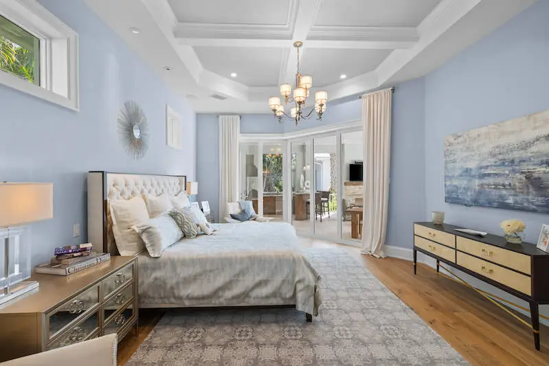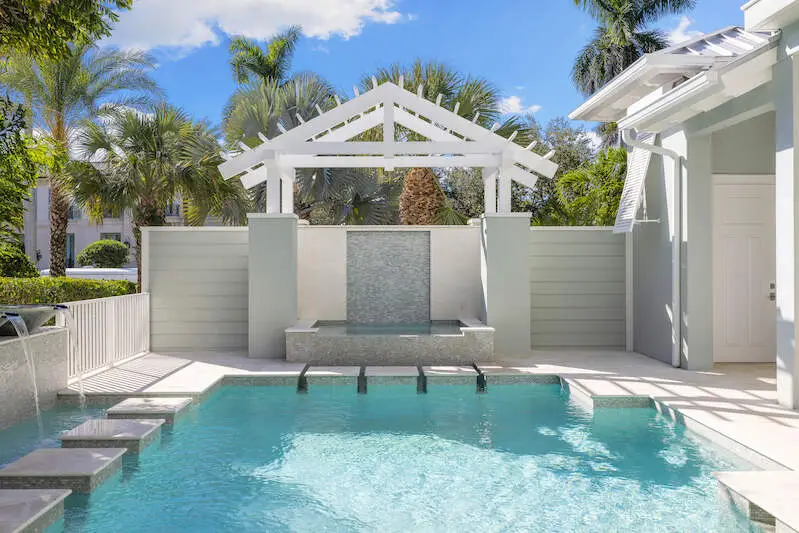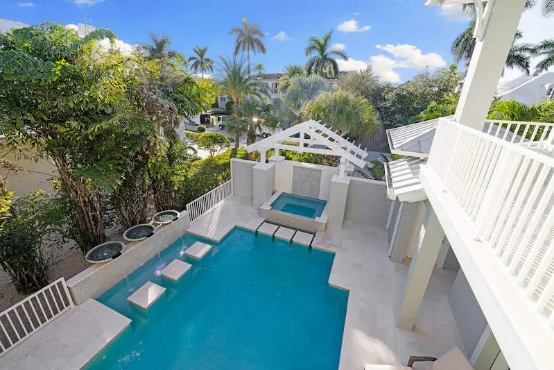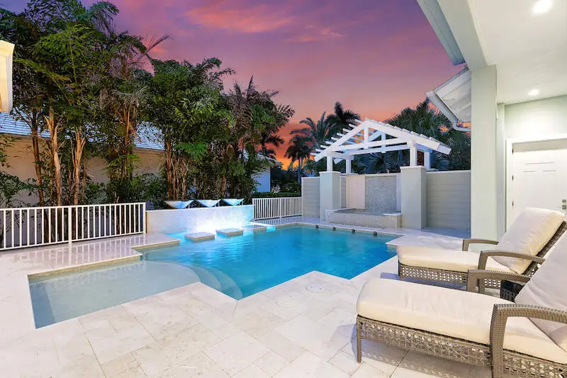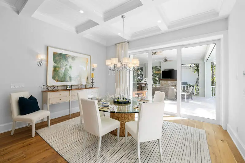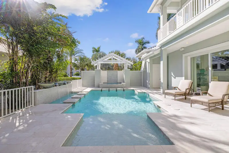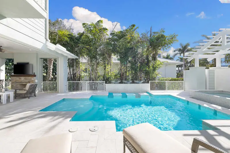 Experience the finest of Coastal Contemporary living in this exquisite residence, nestled on one of the most tranquil and sought-after streets in the Moorings. Impeccably designed, this like-new masterpiece exudes sophistication and elegance, having been meticulously maintained and rarely lived in, including Clive Daniel furniture. Every luxurious detail of this home has been thoughtfully designed. The bright and airy great room, complete with a fireplace and elegant smoked oak flooring, seamlessly connects to a spacious lanai that features a second fireplace, full bath, dining area, and outdoor kitchen with automated screens. Enjoy breathtaking sunsets from the sunny pool deck with Southwest exposure, a pergola-covered private spa, and soothing modern bowl fountains. The award-winning kitchen is a chef's dream, boasting custom cabinetry, polished Quartzite counters, a Viking 6-burner gas range with a second wall oven, a Subzero paneled refrigerator, Bosch dishwasher, and a wine cooler. The primary suite, along with a den/study or potential 5th bedroom, is conveniently located on the ground floor, while the upper level features three spacious ensuite bedrooms and a cozy TV gathering area. The floor plan allows for installation of an elevator for added convenience. The optional Moorings membership private beach club is just minutes away, embodying the luxurious lifestyle that Naples has to offer.