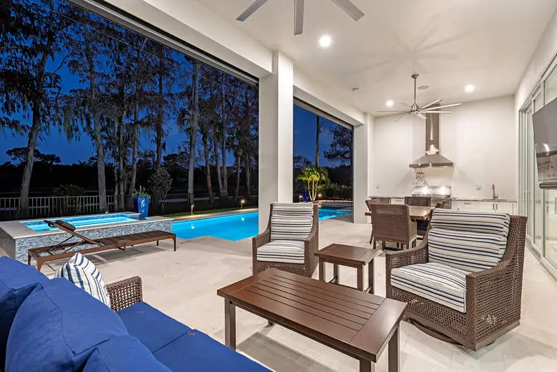 This hidden gem is centered in the heart of Naples within the coveted community of Big Cypress. It's rare to find newer construction just one mile from The Waterside Shops. Impressive ceiling heights and panoramic golf course views welcome you into this recently completed luxury home crafted by Borelli Construction. Inside you'll find the high-end finishes you expect from Borelli including custom closets, extensive trim work, detailed ceilings, as well as beautiful French white oak wood flooring and Anderson impact windows. Exquisite style abounds in this professionally decorated home that has been meticulously designed, painted and enhanced with custom window treatments and tasteful feature walls. The great-room floor plan showcases a living and dining area with beautifully coffered ceilings and luxurious window panels that frame the views onto the expansive lanai. The adjacent and well-designed kitchen is centered around a large island of natural stone. Shaker-style solid wood cabinetry and a separate pantry provide plenty of storage. Premium appliances include SubZero and Wolf, and a dual-zone wine cooler. The master suite features a spacious bedroom with sliding doors to the peaceful outdoor space. Closets are ample and the spa-like bathroom serene. The two guest bedrooms are generously sized with walk in closets and en-suite bathrooms. An additional office space, or bedroom, is located at the front of the home. The lanai is equipped with a full outdoor kitchen and plenty of room for entertaining. The heated salt-water pool and spa with sun-shelf complete the Florida lifestyle. A high-end pool enclosure with picture frame was just installed, framing the unobstructed golf course views. Custom exterior lighting, landscape improvements, a Sonos sound system, improved audio-visual equipment and garage enhancements that include built-in cabinetry, additional refrigerator and specialized flooring round out this stunning home. The community is perfectly situated in the heart of Naples with quick access to all the best in Naples beaches, shopping and dining. Social Awaiting Golf membership is available and allows for access to social activities and limited golf.