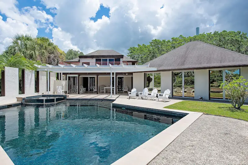 H6474-HIGH AND DRY. Enveloped by mature trees and nestled on the serene Half Moon Lake, this idyllic, nearly 24,000 sq. ft., Port Royal parcel makes it easy to imagine the number of possibilities for a newly constructed residence with tranquil outdoor living. Currently nestled on the parcel is a well-cared for home crafted by renowned architect Kasimir Korybut that allows for comfortable living for those wanting to build while plans are solidified. The main level includes a spacious living areas, two en-suite bedrooms with lake views, a half bath and a custom kitchen. Floor-to-ceiling sliders open to extend your living to the outdoors, where residents are able to enjoy the copious amounts of varied wildlife, as well as enjoy a luxurious saltwater pool / spa, outdoor shower, and kitchen. By means of a spiral staircase, the second level consists of a spacious bedroom toting sliders that open to a private balcony, as well as a lavish bathroom. Auto enthusiasts will delight in having a fully tiled, air-conditioned garage with plenty of space. Port Royal is a world-class community with close proximity to all that Naples has to offer including sugar sand beaches, shopping, & dining.