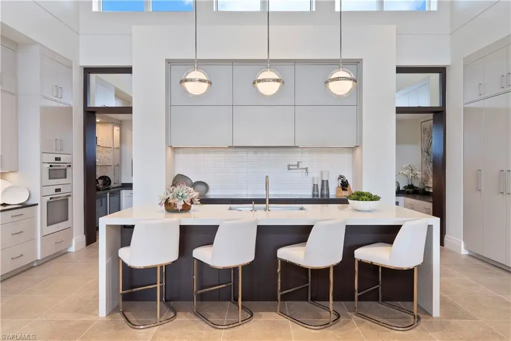 London Bay Homes' Portmore: Prime Park Shore corner lot. Architectural and color harmonies. Romanza-designed, art-enriched interiors. Custom millwork, layered lighting, high beamed ceilings. Open living, clerestory windows, natural light. Four en suites, office, butler's pantry. Southern exposure, indoor-outdoor fusion, infinity pool, hedged deck, fire pit. Fully turn-key furnished, high-end finishes in meticulous, pristine condition. Programmable Lutron lighting, advanced security. Soho-designed kitchen, Miele suite, waterfall counters. Equipped catering pantry, ice maker, comprehensive bar library. Zen modern garden, innovative landscape, Burle Marx tribute. Sculpted garden beds, palm court, unique stone art, Florida palm collection. Dual garages, multi-car parking, lift-ready tall ceilings. Whole house 32Kw generator, AquaKleen whole-house water filtration system, Sonos sound system, Buzz Off Mosquito system, & video cameras integrated as part of security system.