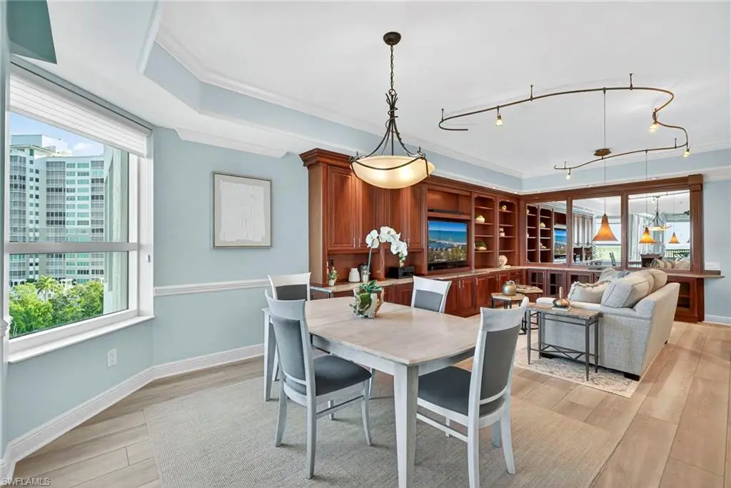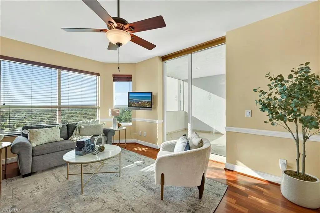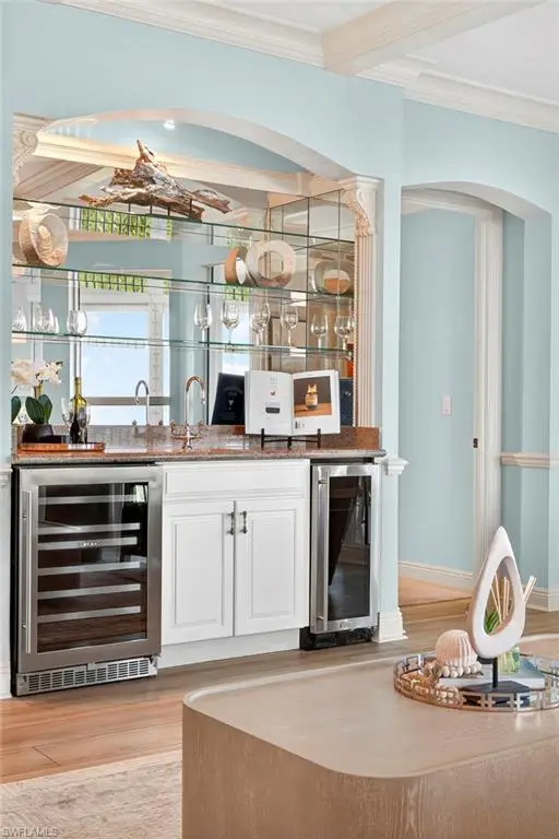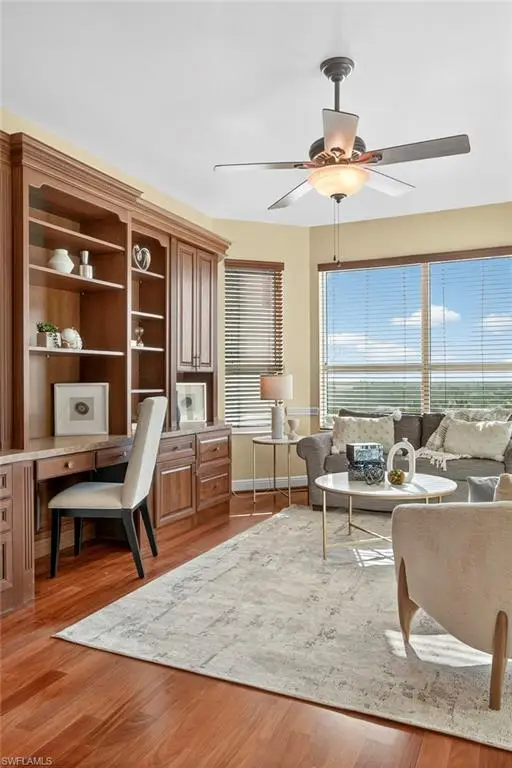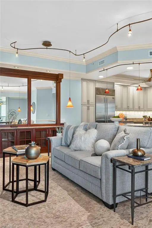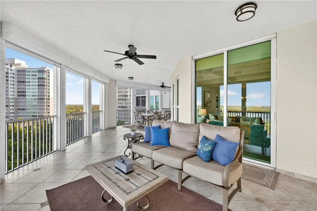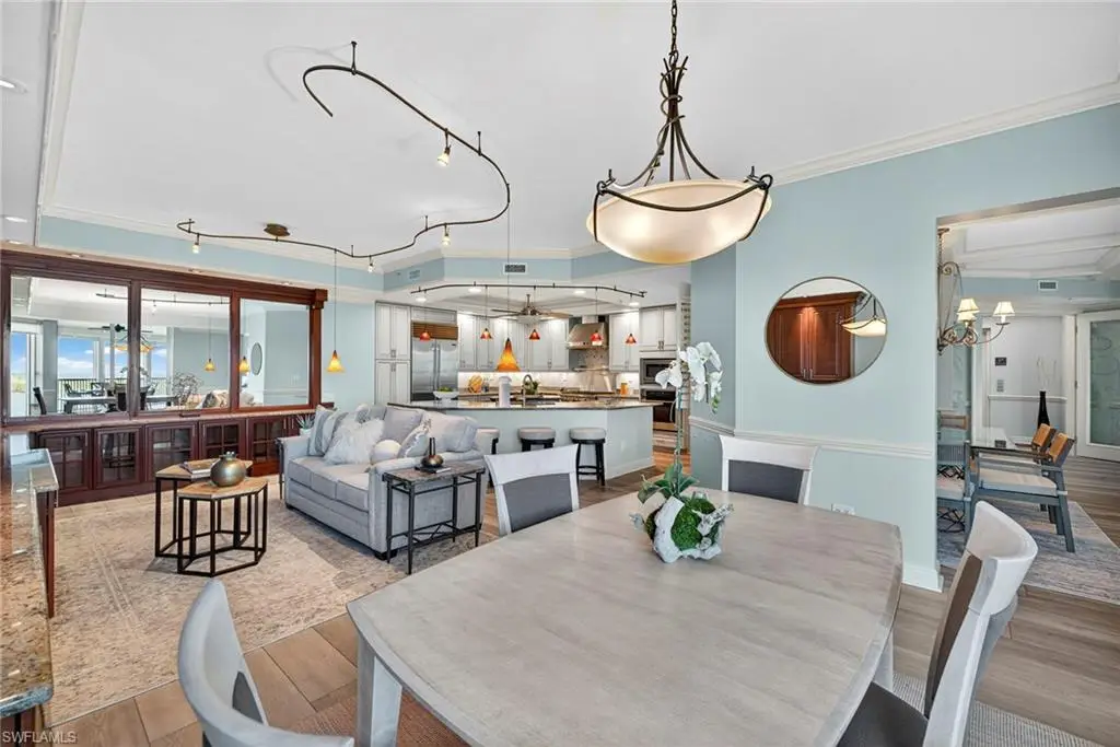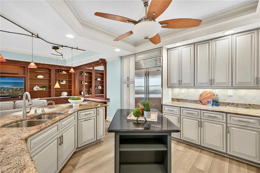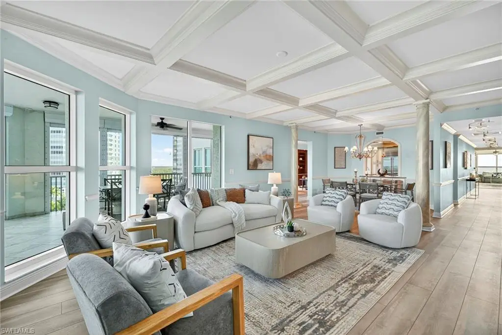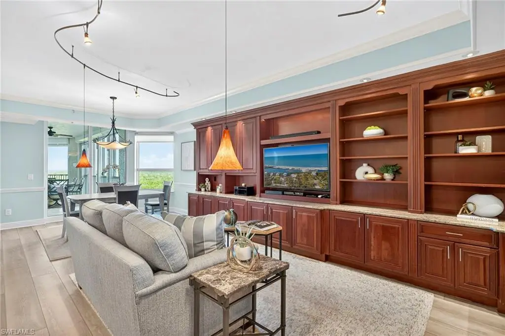 Step off the secured elevator into this highly sought-after center-stack residence and experience panoramic views of Turkey Bay and the Gulf of Mexico from your open-concept living area. This light and bright 3-bedroom, 3.5-bath home showcases oversized windows that maximize the views, sleek modern flooring, and coffered ceilings that add architectural sophistication. The living room features a stylish wet bar and custom built-in cabinetry, creating an ideal setting for entertaining. The chef's kitchen is open to the family room and includes a convenient pass-through to the dining area, where Gulf views provide a stunning backdrop. Elegant crown molding and thoughtful details throughout enhance the home's refined ambiance. The primary suite offers spectacular views of the Bay and Gulf, along with a luxurious bath featuring a double vanity, soaking tub, and separate shower. A second primary suite doubles as an office or den with access to a private lanai, perfect for work or relaxation. The third guest suite also enjoys its own private balcony, offering comfort and privacy for family and guests. The Grande Excelsior delivers resort-style living with a private pool and spa, fully equipped fitness room, outdoor gas grill, extra storage, and two under-building parking spaces. Residents also enjoy The Club at The Dunes, which features a waterfall pool with zero-entry access, a popular Tiki bar, casual and fine dining, a state-of-the-art fitness center with on-site trainers, and tennis and pickleball courts with full-time pros. The Dunes hosts social events throughout the year, fostering a vibrant sense of community. This residence includes the highly coveted Floridian Club membership (available with a $50,000 + tax transfer fee), granting private beach access on Vanderbilt Beach with pool, restaurant, indoor/outdoor seating, beachside services, and a private shuttle from your lobby to the sand. Ideally located near high-end shopping, fine dining, and RSW International Airport, The Dunes offers a rare pet-friendly lifestyle with the perfect blend of luxury, leisure, and convenience. Discover resort-style living at its finest; schedule your private showing today. ________________________________________