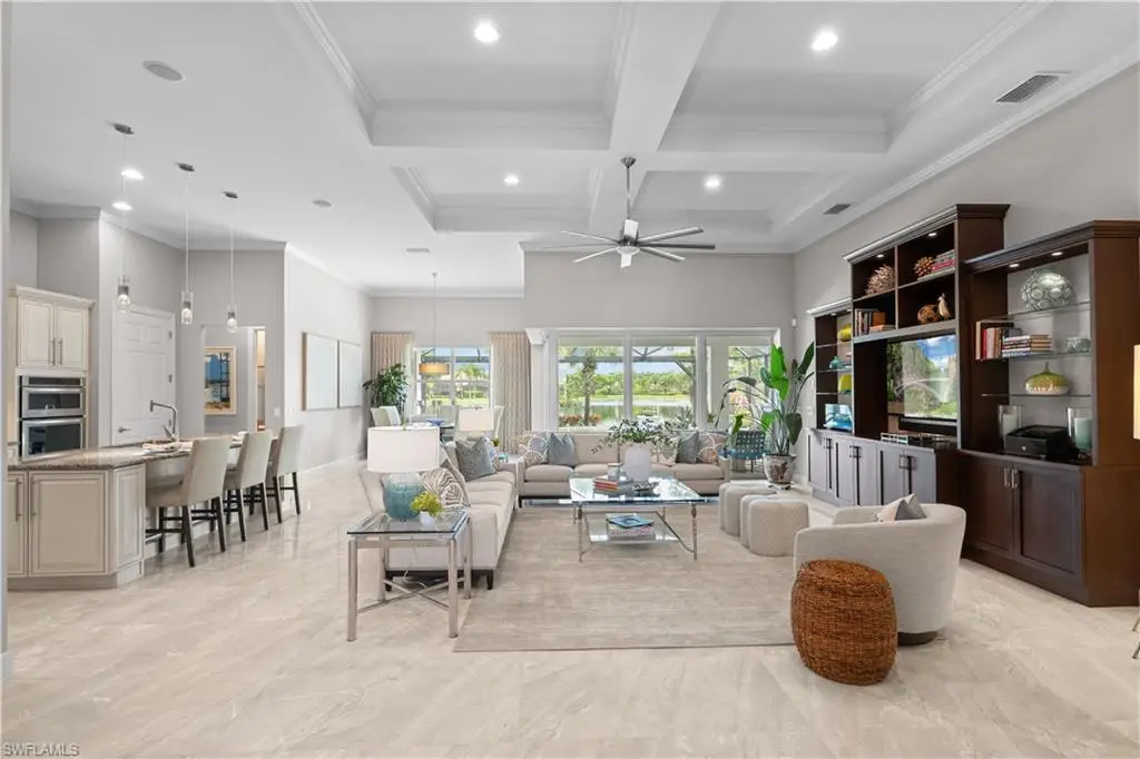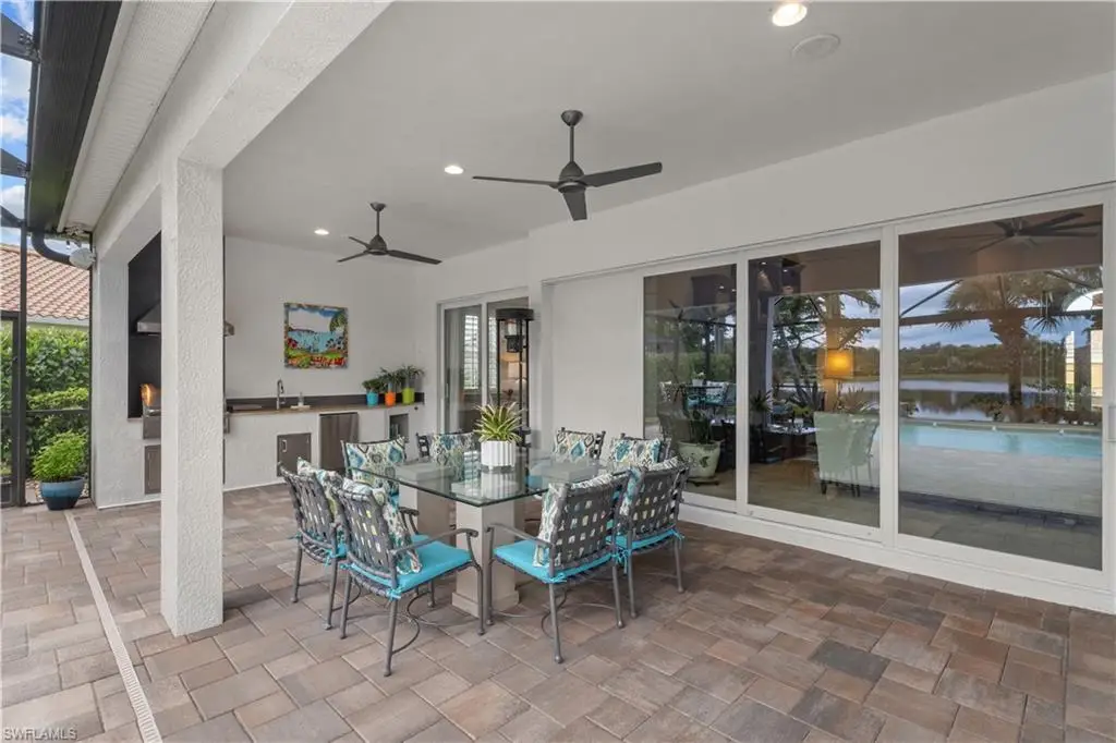 Welcome to this stunning, light-filled and ever so popular "Windsor" floorplan home, featuring 4 bedrooms plus den, 3 full baths, and a spacious 3-car garage. Nestled on an oversized, pie shaped lot with an extra long driveway, this home offers a wide-open Great Room layout that’s perfect for entertaining and everyday living. As you step inside, you’ll be greeted by a bright and airy atmosphere, highlighted by zero-corner pocketing sliding glass doors to the lanai that seamlessly connect the indoor and outdoor living spaces. The sliding doors lead to the expansive lanai, where you'll find an outdoor kitchen and an oversized electric and solar heated salt water pool with picture window screen cage overlooking the lake – your personal oasis. The chef’s kitchen is a dream, complete with raised panel cabinetry, KitchenAid appliances including wall oven, convection microwave, and beverage cooler. The large eat-in kitchen area offers the perfect spot to gather and enjoy meals with family and friends. Retreat to the luxurious primary suite, which boasts a tray ceiling, a spacious bath featuring a soaking tub & walk in shower, and two spacious walk-in closets with built-in cabinetry. For those wine enthusiasts, the custom climate controlled walk in wine room will be the envy of your family and friends. Storm ready with HURRICANE IMPACT WINDOWS/DOORS! Enjoy boating, golf, tennis, pickleball, bocce, a tiki bar, restaurant, poolside food and drink service, a fitness center, and social activities. The recently renovated $18M Lake Lodge & Beach Club offers over 500 acres of navigable lakes, boat slips available for lease, and a private 18-hole golf course (full golf memberships available/optional). In addition, The Quarry Golf Club offers a variety of membership opportunities. Designed in 2007 by the world-renowned architectural team of Dr. Michael Hurdzan and Dana Fry, this Par 72 championship course delivers a truly exceptional golf experience framed by breathtaking views. Water comes into play on every hole, creating both beauty and challenge, while the thoughtful design ensures an engaging round for golfers of all skill levels. With five sets of tees and a distinctive layout from hole to hole, this course offers endless variety—inviting you to enjoy the challenge again and again.Don’t miss the chance to experience a lifestyle like no other in The Quarry – schedule your private showing today!