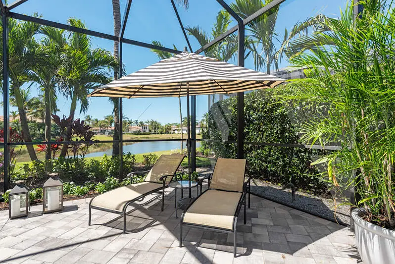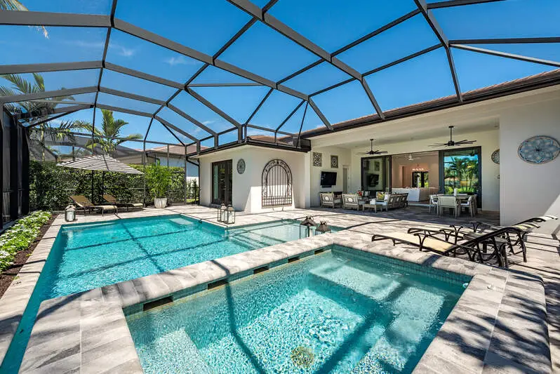 This spectacular resale, that is 5 years young, is a MUST SEE!!! Welcome to 16775 Cabreo Drive in Mediterra. This gorgeous London Bay built "Devonshire Model" with separate guest casita/guest house is one of a kind. Perfectly situated on this western exposure lot with a 3 car attached garage this home has gorgeous curb appeal. Come through the covered front porch, with double door entry, to this amazing open concept floor plan with soaring ceilings and walls of windows allowing all the Florida sunshine to stream in! Wood-look tiled plank flooring throughout the main living areas of the home, custom detailing, and crown molding are just some of the high end finishes you are sure to be looking for! The designer kitchen is perfect with white shaker cabinets on the perimeter and darker cabinets on the oversized island. The tiled backsplash, quartz countertops, high end stainless appliance package, recessed and pendant lighting, and plenty of counter space make this kitchen a Chef's dream. The dining area, adjacent to the kitchen and great room plus outdoor dining and seating make this home a fabulous place to entertain with plenty of seating for everyone. The oversized great room, with TV wall, custom millwork and accents, tray ceiling and large oversized sliders, opens to the lanai. A spacious owner's retreat provides the perfect place to rest peacefully. Two walk-in closets, a large walk-in shower, soaker tub and oversized dual vanities complete the en-suite space. The den is tucked away from the great room to allow for quiet privacy when needed. There are 2 additional guest suites in the main house both with double closets and en-suite baths. The split bedroom floor plan allows for privacy for you and your guests. A separate one bedroom/studio Casita /guest house with en-suite bath and private access can be used for guests or office space - you decide! Outside, under the covered lanai enjoy the western sunset views, a fully equipped outdoor kitchen with refrigerator, sink and built-in grill. A glistening pool and spa await you for relaxing in the Florida sunshine. Fully screened lanai cage and expanded decking provide the perfect spot to watch the sun set and relax after a day of sun-filled activities. Lake views from the lanai and great room and landscaped area at the front of the home, with no other homes across the street, provide the upmost of privacy. A whole home generator, Natural gas community, flat tiled roof, storm protection give you the best in storm protection. Mediterra's world-class amenities include: a Private Beach Club, Tennis, Pickleball, Wellness Center, and two Tom Fazio-designed golf courses! This home offers the perfect blend of luxury, style, and functionality. Mediterra is centrally located minutes from down town Naples and Bonita Springs with fine dining and shopping galore. RSW Airport is a 25 minute drive! Is this the home for you? We invite you to come see for yourself!!