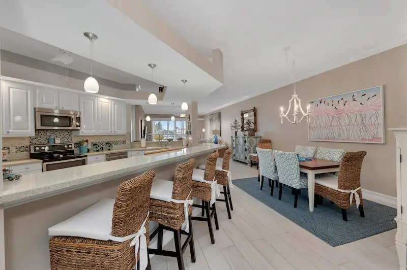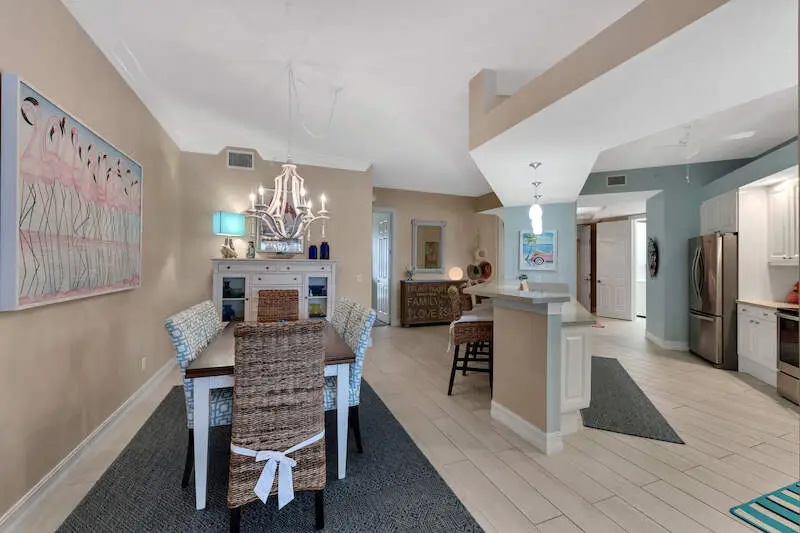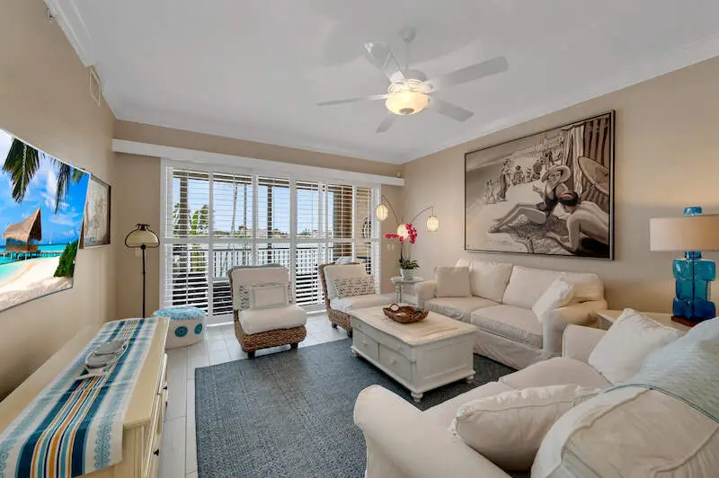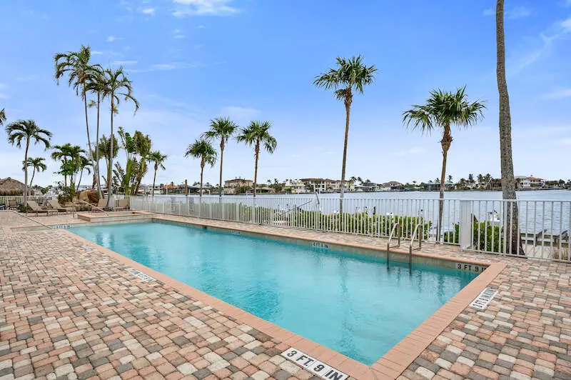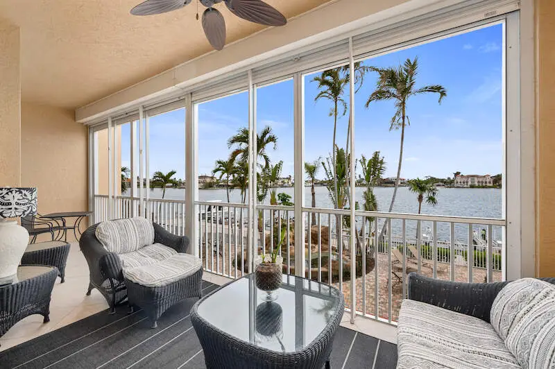 Welcome to this spectacular, beachy waterfront property in the heart of North Naples. This stylish first floor (second level) residence offers a coastal vibe and boasts stunning bay and gulf views from huge east and west facing lanais, perfect for catching both sunrise and sunset! The wide bay view overlooks three intersecting canals. The upgraded master faces the bay with huge separation from the two guest en-suite bedrooms that face the gulf. The den is hidden discreetly down the hallway from the primary bedroom. The interior features upgraded appliances, new flooring, renovated primary bath and beautiful kitchen counter tops. Also decorator shutters and electric storm shutters for added peace of mind. Amenities include a pool, two tiki huts, under building parking and extra storage for beach chairs making it a true waterfront paradise. Located across from the beach (public beach access across the street,) walking distance to La Playa and close to both the Ritz Carlton and Mercato, this home combines luxury and convenience for the Ultimate Naples Lifestyle!