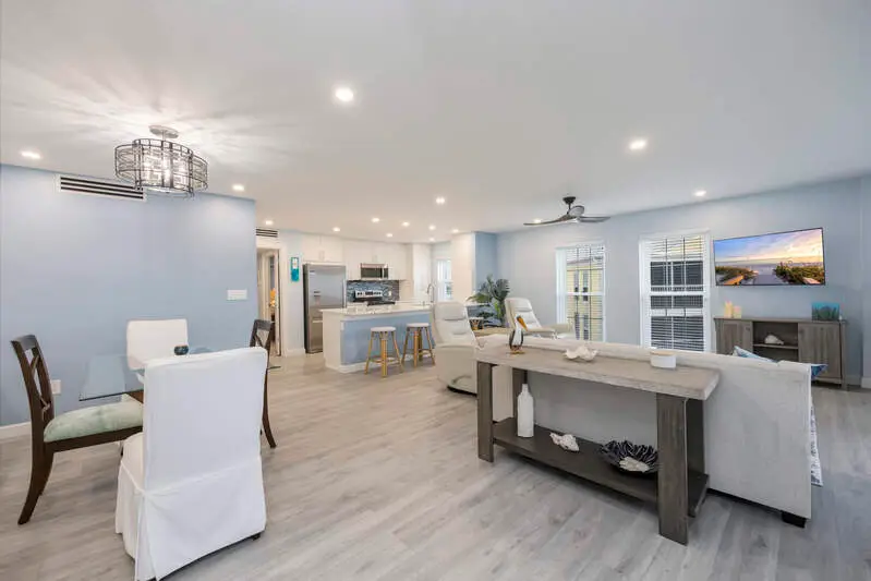 Sweeping Gulf Views in The Moorings! Perched on the top floor of St. Croix Club, this two-bedroom residence captures sunrise-to-sunset views with the soothing sounds of the Gulf just outside your windows. Inside, you'll find a beautifully re-designed open kitchen with quartz countertops, stainless steel appliances, breakfast bar & under-cabinet lighting. An expanded living area with a dry bar makes entertaining easy. The primary bedroom suite offers a cozy office alcove complete with a city view. An in-unit laundry, abundant storage & luxury vinyl flooring throughout are also part of this offering. With only two residences per floor, natural light pours in from three sides. St. Croix Club has completed exciting new amenities, including: a reimagined beachfront pool with extended deck, pergolas & social area, a new fitness center & redesigned social room. Additional conveniences include secured entry, under-building parking, and private storage. All of this is located just moments from the boutique shopping and fine dining of Venetian Village.