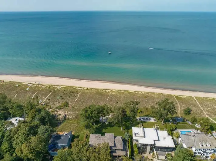 Perched along the shores of Lake Michigan within the exclusive Riviera Association, this 5-bed, 5.5 bath home epitomizes the elegance & timelessness of Lakefront contemporary architecture. Designed in 2013 by the renowned architects Perkins, Pryde & Kennedy & completed in 2015, this 5,000+ sq ft home masterfully represents a modified Prairie Style design full of modern luxury & stunning natural surroundings. Exquisite hardwood floors infuse warmth into every room. Expansive glass walls offer panoramic views of Lake Michigan, seamlessly connecting the indoor & outdoor spaces. The open and light-filled design allows residents to fully immerse themselves in the tranquil landscape. Featuring five spacious bedrooms and five and a half beautifully appointed baths. Each ensuite bedroom is thoughtfully designed to provide comfort & a sense of serenity. The living areas are characterized by their openness, flooded with natural light, and offering breathtaking vistas of the lake. Enjoy the all-level elevator for convenience; private lakefront office; lush green lawn with plenty of room for a pool; spacious decks; Elan Smart Home system; beach cabana for relaxing by the shore & easy access to the private association beach via a low bluff. For the discerning buyer who desires more than just a home, this work of art captures the essence of Lakefront Contemporary design while offering modern luxury.