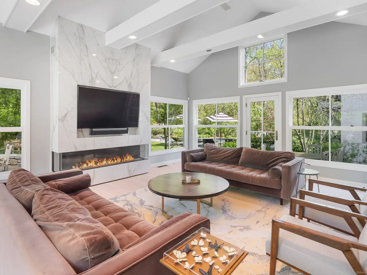 California meets New Canaan in this William Wurster inspired transitional-style masterpiece set on 2.54 private acres on New Canaan's desirable west side that's so convenient to town. This extensively renovated home has over 100 custom windows and 16 doors bringing the outside in from every room. Amazing sun-drenched living space with wonderful views from EVERYWHERE. French doors lead to expansive bluestone terraces, a beautiful gas fire pit for entertaining, meticulously manicured flower gardens, pool, spa and river. Five bedrooms, four-car garages, au pair suite and an exceptionally designed layout make this home a sensational haven with the warmth of a colonial but so fresh!