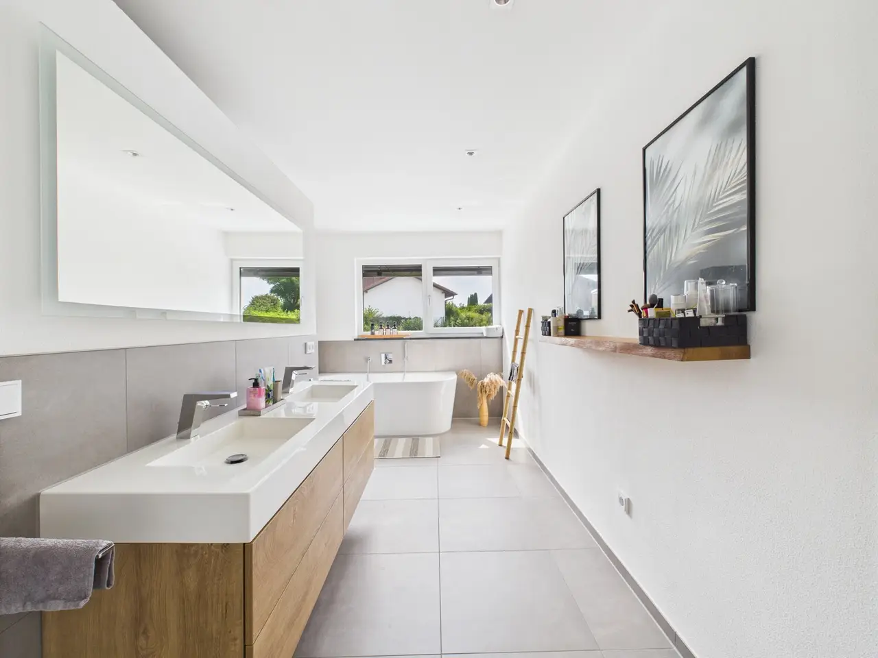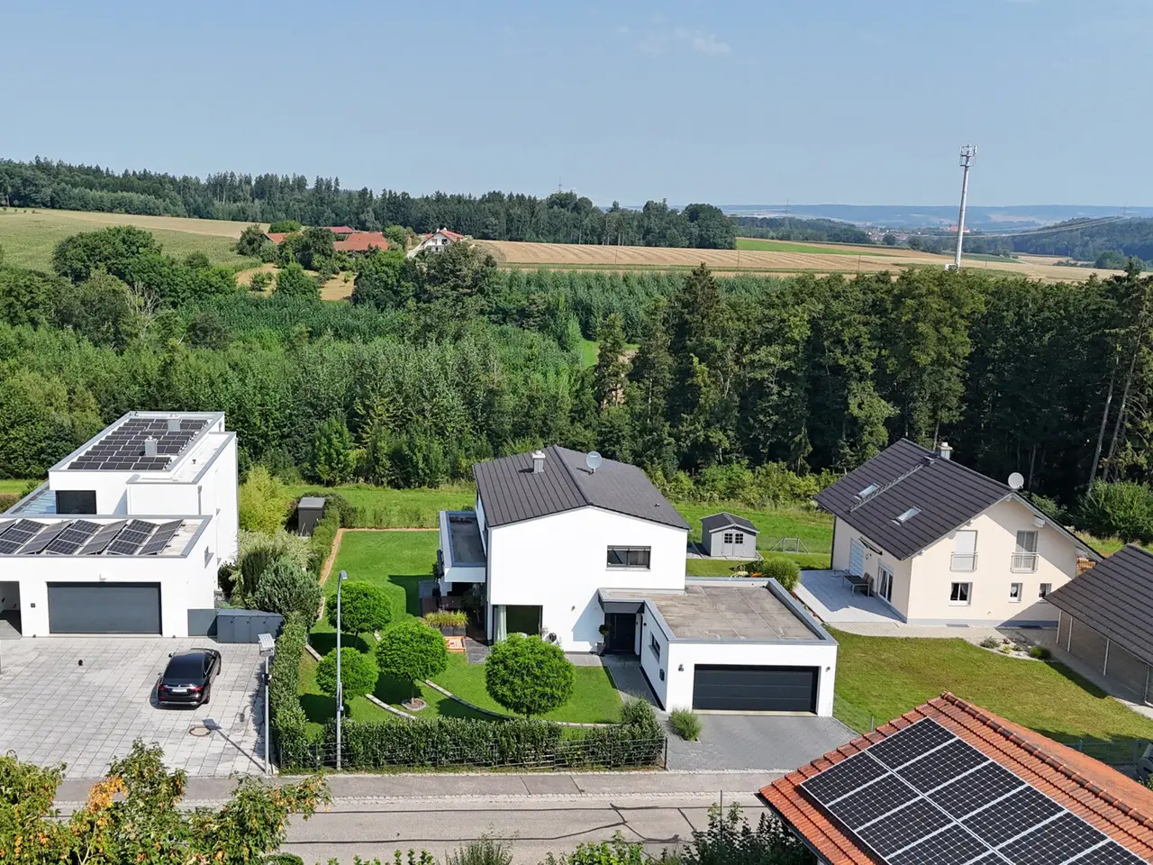 Modern living on the edge of the village - architecture meets nature On the idyllic edge of the village of Oberviehbach, this detached house built in 2020 is a real gem for sophisticated living. Nestled in a quiet, exposed neighborhood and surrounded by greenery, it combines modern living comfort with a quality of life close to nature. The living space of around 215 m² extends over three floors and offers space for the whole family. With 6 rooms, including 4 bedrooms, a guest WC and a stylish bathroom, the house meets the highest living standards. Large, floor-to-ceiling windows let in plenty of natural light and open up views of the spacious garden with over 1,028 m² of land. The fittings are impressive with their clear, high-quality architecture: an elegant fitted kitchen, a fireplace for cozy hours, modern bathrooms and triple glazing ensure upscale living. The house has a partial basement and offers plenty of storage space. It is heated sustainably using geothermal energy supplemented by wood - the energy certificate confirms the excellent efficiency class A+ with a final energy requirement of just 23.6 kWh/(m²a). The outdoor areas invite you to relax: Two sunny terraces and a stylishly landscaped garden with seating lounge make the outdoor area a real highlight. There are 2 garages and 2 outdoor parking spaces available for vehicles. This house combines modern architecture with a feel-good atmosphere and at the same time offers privacy, closeness to nature and a valuable neighborhood. An ideal home for families or couples who are looking for stylish living in a quiet location - and yet appreciate the proximity to Landshut and the main transport routes.