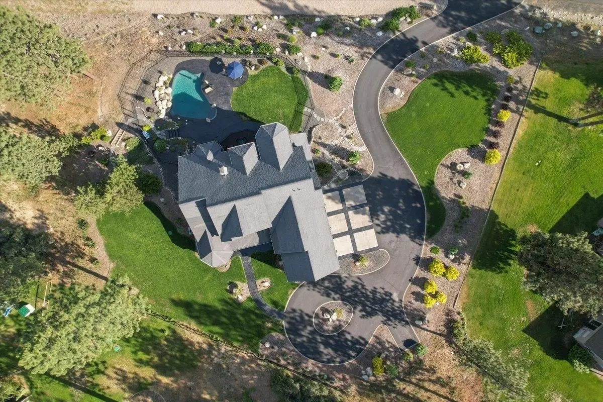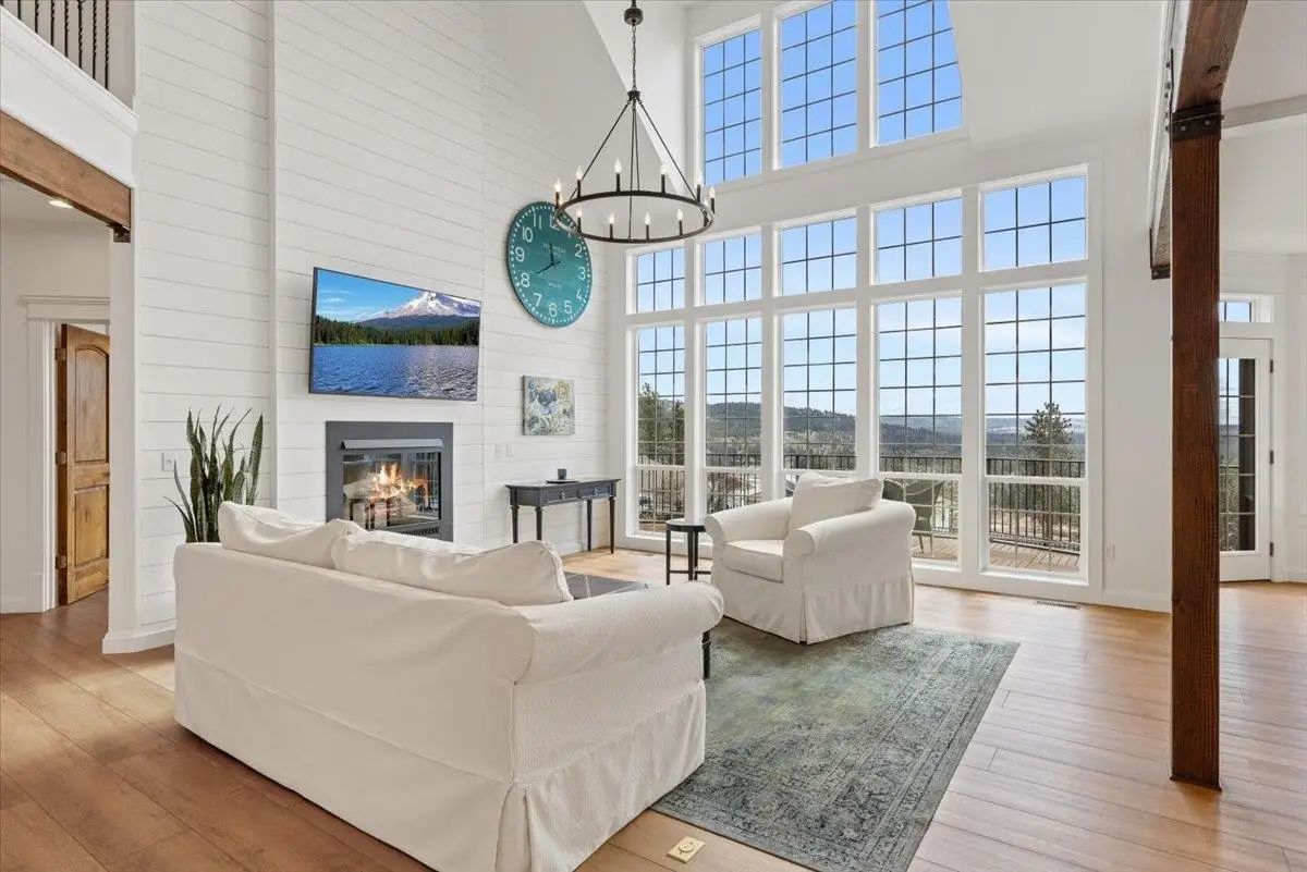 Custom built two-story with daylight walkout basement modern farmhouse style home on 1+ acre lot with an incredible lake view! There is so much to love in this home that has an open floor plan, floor to ceiling windows and newer LVP plank flooring. Solid alder wood doors. Spacious kitchen with granite counters, built-in gas range, new dishwasher and a huge island. Main floor primary suite with a walk-in closet and full bath. Formal dining room plus an office/library. Second floor features 3 bedrooms and 2 bathrooms along with a bonus play room over the garage. Lower level family room has a wet bar, workout room, plus a home theater room along with a 5th bedroom and bathroom. Wait there's more! A salt-water pool with a waterfall feature. 3-car oversized garage and plenty of driveway parking. Newer HVAC system (01/2025). HardiePlank siding & shake accent. All in a gated neighborhood with amazing views of Lake Spokane that's conveniently located to shopping, dining & an easy commute to Spokane.