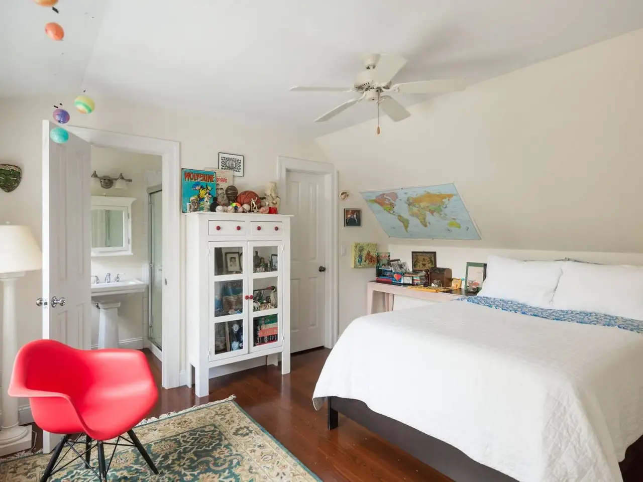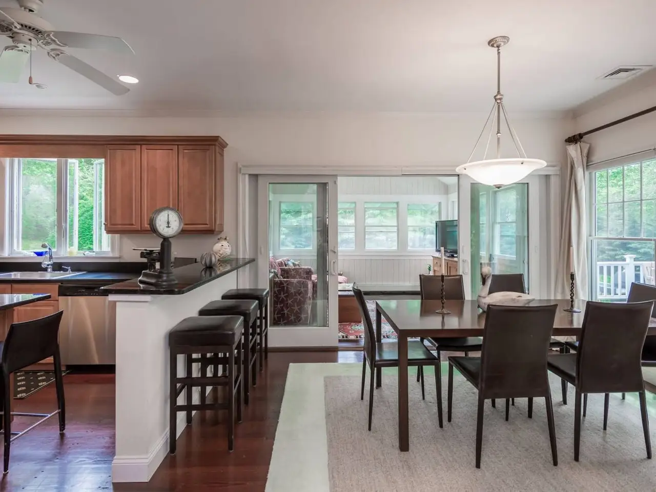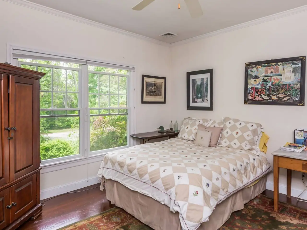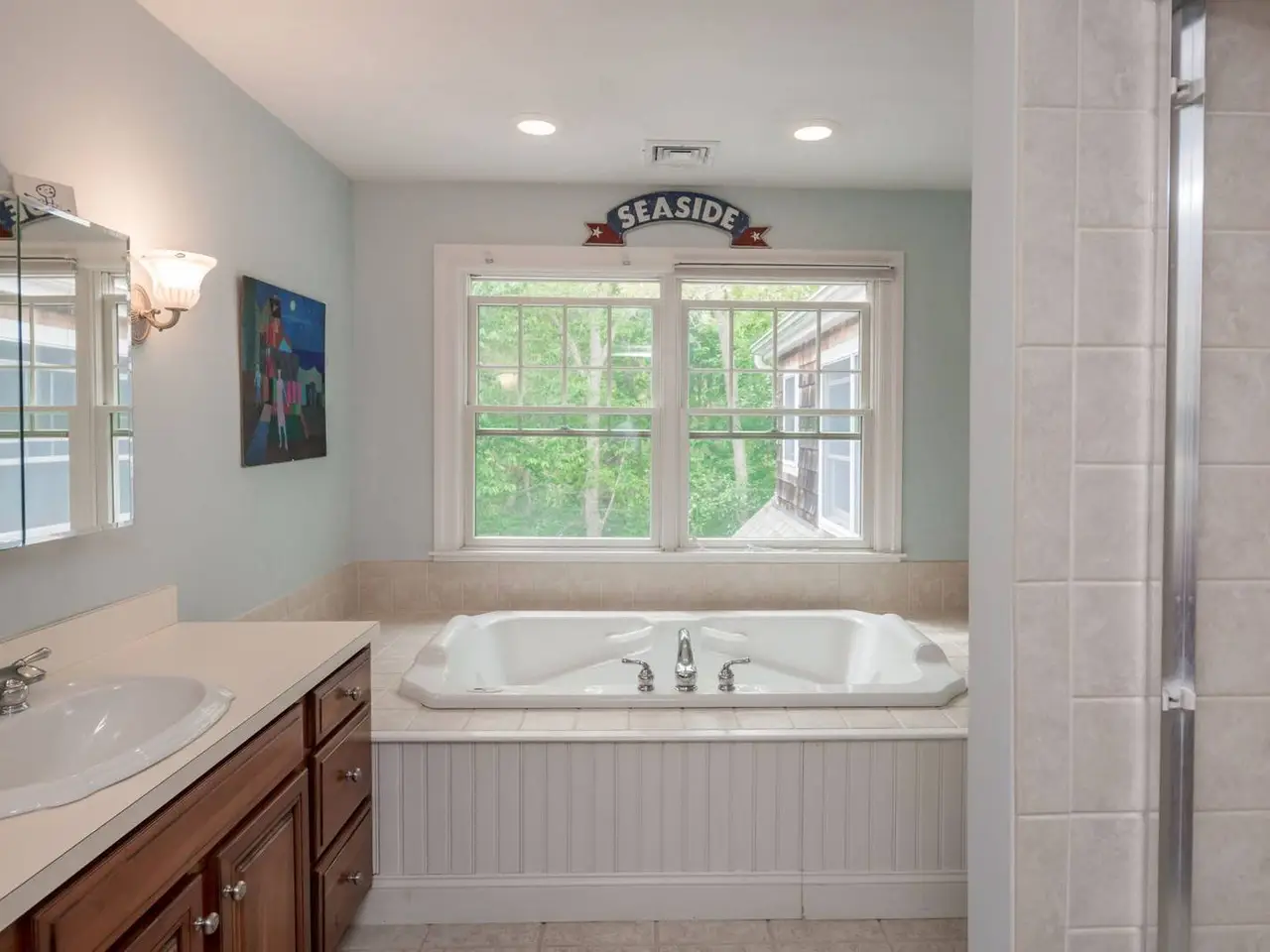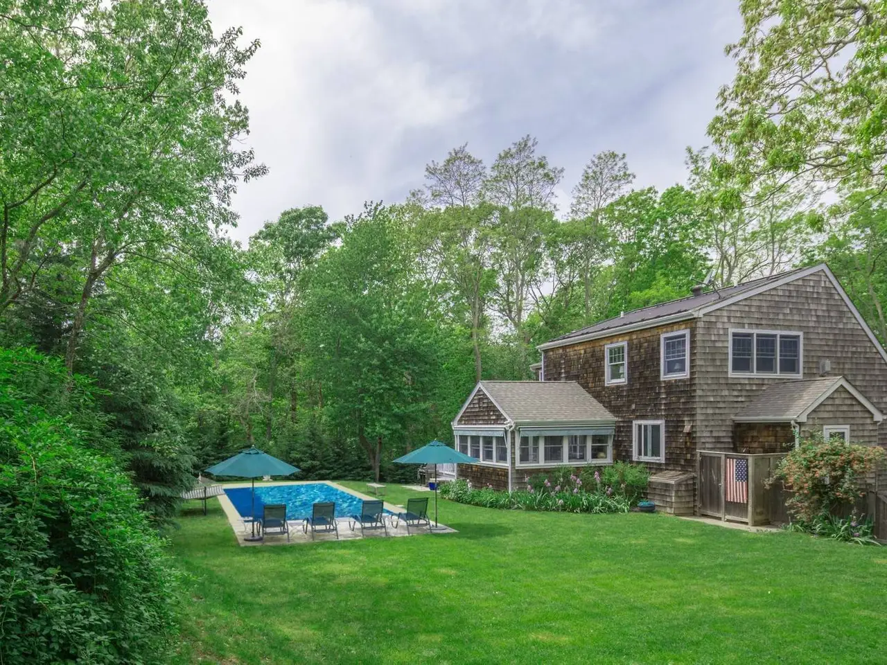 The perfect rental in a waterfront community in Sag Harbor/North Haven, just up the block from a wide span of east-facing bay beach for swimming, kayaking, fishing, and gorgeous sunrises. This well-appointed, light-filled traditional with privacy all around combines open common areas for entertaining with three en-suite bedrooms (including first and second level primary rooms); a bonus room with open views acts as a fourth bedroom, with convertible queen sofa and exterior entrance. Basement gym area with elliptical trainer, workout station, stationary bike; plus ping-pong table, and bring your own kayaks. Large deck overlooks rejuvenating saline, energy efficient solar heated pool. Two miles from Sag Harbor Village and Long Beach, North Haven Village offers community tennis, basketball court, and brand new playground a block away at Village Hall.