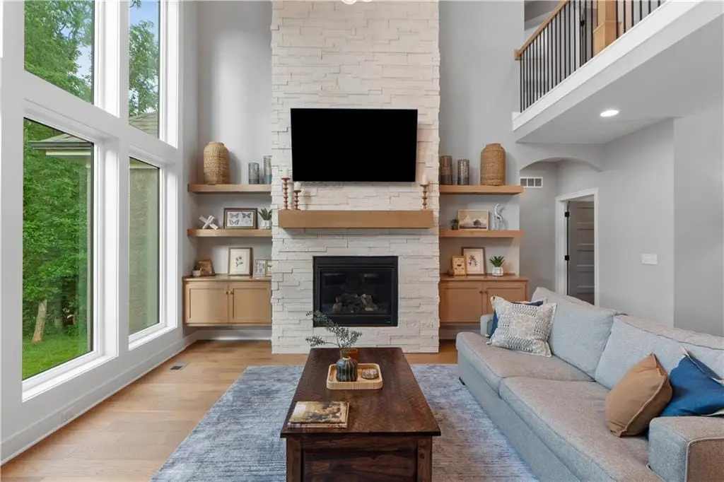 Immersed in natural elegance on over half an acre treed lot, this 5-bedroom, 4 car garage, 2-YEAR-NEW custom home is meticulously designed for luxury and comfort. Enter through mahogany double doors beneath a cedar-ceiling stoop, greeted by a stunning curved floating staircase and 6-inch natural stained plank hardwood floors flowing seamlessly across the open main level illuminated by a stunning chandelier and floor to ceiling stacked stone fireplace. The chef's kitchen is a centerpiece: 10' waterfall island in Calcatta white & black quartz, floor-to-ceiling cabinets, floating shelves, custom-stained range hood. JennAir appliances-including gas cooktop, dual convection ovens, industry-grade refrigerator and freezer units, all on dedicated circuits. Unique glassed in Wine Cellar and huge walk-in pantry complete the kitchen. The dining space is perfect for large gatherings with it's ample space. Oversized sliding doors open all the way to bring the outside in and make the covered composite deck with ceiling fan additional living space to relax or entertain! Main-floor Primary Suite is a lavish retreat with treed views, plush carpet, spa-inspired bath with Calcatta Macchia Vecchia Quartz double vanities, statement pendants, sleek fixtures, and soaking tub. A dream walk-in closet includes a vanity & plug-ins. Lg Laundry room right outside the Primary. Upstairs, three more bedrooms w/walk-in closets and 2 bathrooms maintain the high-end finishes. The daylight lower level is ready to be finished & pre-plumbed for a bathroom. A mudroom leads to the extra-deep, L-shaped 4-car garage-with insulated wooden doors provide abundant space for large vehicles or gear. Outside, privacy abounds thanks to the treed yard and oversized lot, accented in front by a large retaining wall and lush landscaping. Bold black-framed windows (midnight on white) add architectural drama to the curb appeal. Walk to Cedar Niles Park/trail. Minutes from Lake Olathe! Convenient highway access to K7 & K10