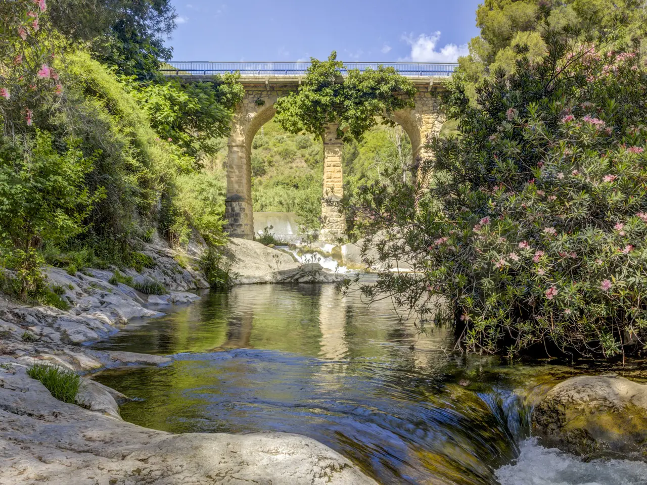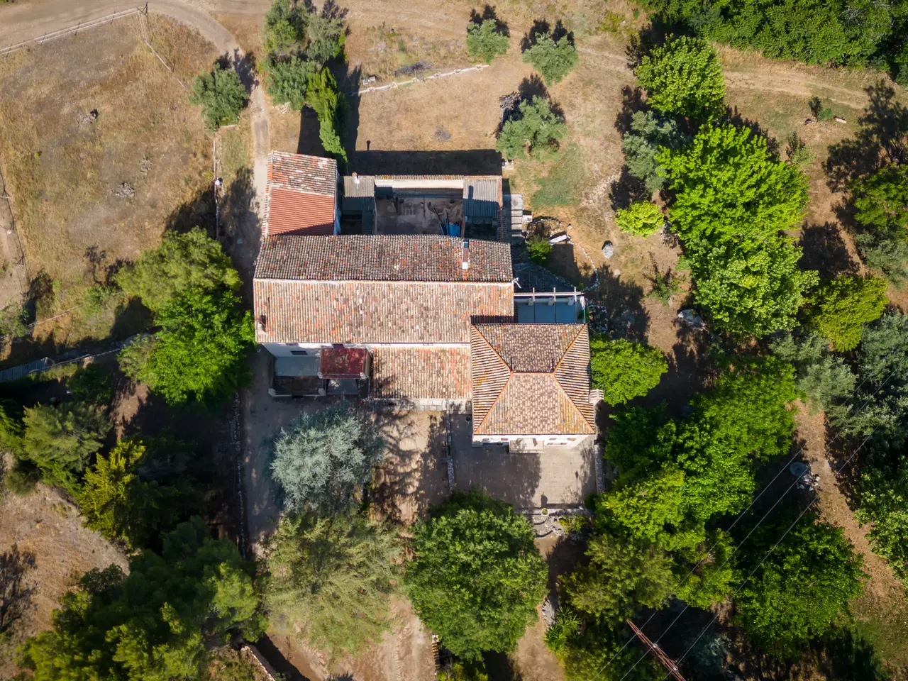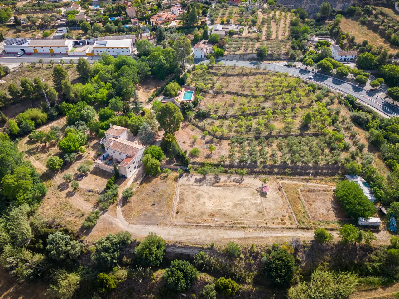 Situated next to a unique natural spot in the Valencian Community, the Pou Clar, in the town of Ontinyent, this rustic property has a constructed area of 1.069 square metres and a plot of 58.640 square metres. It is worth mentioning that the land is cultivated with almond and olive trees, the latter being used for the extraction of olive oil for its own use. The estate has terraced fields which slope down to the Clariano riverbank. A large irrigation ditch that serves the vegetable garden runs through the plot. The property has several areas: the first and main one corresponds to the location of the house and its immediate surroundings. This area consists of the house communicated with the cultivated fields, the swimming pool area which is filled directly by the waters of the Pou Clar and a wooded area destined for private recreational activities. The second area, the highest and most central one, corresponds to the dry farming area. It has centenary olive trees distributed on five levels, as well as an area dedicated to horse breeding with stables. The third area, the lowest, houses a space for growing vegetable crops. Finally, the fourth and smaller area is a wild space with vegetation typical of the area and a semi-permanent watercourse. The estate forms part of the Catalogue of protected buildings in the rural environment of the town of Ontinyent. As for the building itself, it dates back to the 19th century, although it was later renovated in the 1970s. It is an old dry farming house that has been converted into a single-family home. It has a rectangular main body, two bays and three levels. The living room and the fireplace area are located in the first bay of the ground floor, while the second one houses the kitchen, the services and the stairs. The upper levels accommodate the bedrooms. There are several annexes consisting of living rooms, bedrooms and toilets, as well as storerooms and old corrals, the latter located at the back of the building. There is also a well for collecting rainwater and an old olive-oil mill. Some of the elements used on the main façade and porch are metal and wood, tiles, wooden beams and multi-pitched Arabic tiles.