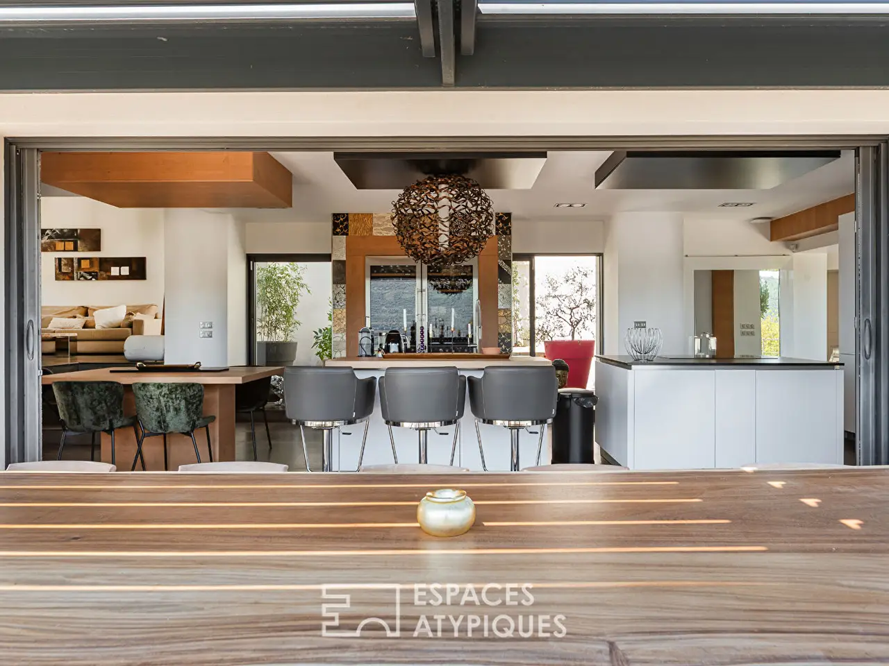 Located in a peaceful and highly sought-after environment in the commune of Oraison, this contemporary property built in 2014 seduces with its generous volumes, its exceptional unobstructed view and its high-end services.Built on a landscaped plot of 2,333 sqm, it offers 413 sqm of living space, extended by 300 sqm of terraces open to the surrounding nature and an elegant 10 x 5 meter swimming pool.The whole benefits from a rare panorama, without vis-a-vis, which accentuates the feeling of space and serenity.The main villa is organized around a vast living room of 110 sqm bathed in light, bringing together living room, dining room and open kitchen with direct access to the terrace covered by a bioclimatic pergola.A master suite, two bedrooms with shower room, a storeroom and numerous storage spaces complete this level.Two independent living spaces complete this configuration:- A single-story apartment with living room, kitchen, two bedrooms, bathroom and private terrace.- A studio equipped to receive comfortably.Each of these spaces has been designed to function autonomously, while remaining connectable according to needs, offering great flexibility of use: large family, reception, professional activity or rental.Comfort is omnipresent: underfloor heating, motorized roller shutters, automatic gate, alarm system, surveillance cameras, double garage, and carefully selected materials.A rare property in a prime location, designed for those looking for a place combining modern comfort, architectural elegance and quality of life in Provence.`ENERGY Class: C / CLIMATE Class: BInformation on the risks to which this property is exposed is available on the Georisques website: www.georisques.gouv.frFor any information contact Marion ROBERT 06 38 84 39 44 EI RSAC 892307539 MANOSQUEREF. 1089ADHPAdditional information* 10 rooms* 6 bedrooms* Outdoor space : 2333 SQM* Property tax : 6 185 €Energy Performance CertificateEPC : 122 kWhEP/m2.year* A 450Agency feesThe fees include VAT and are payable by the vendorMediatorMediation Franchise-Consommateurswww.mediation-franchise.com29 Boulevard de Courcelles 75008 ParisInformation on the risks to which this property is exposed is available on the Geohazards website : www.georisques.gouv.fr