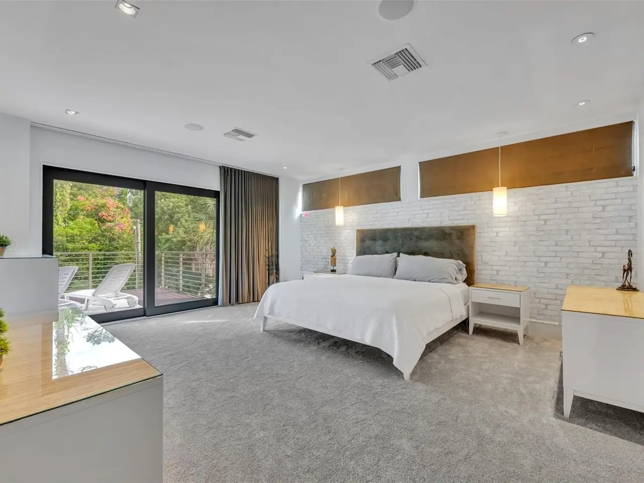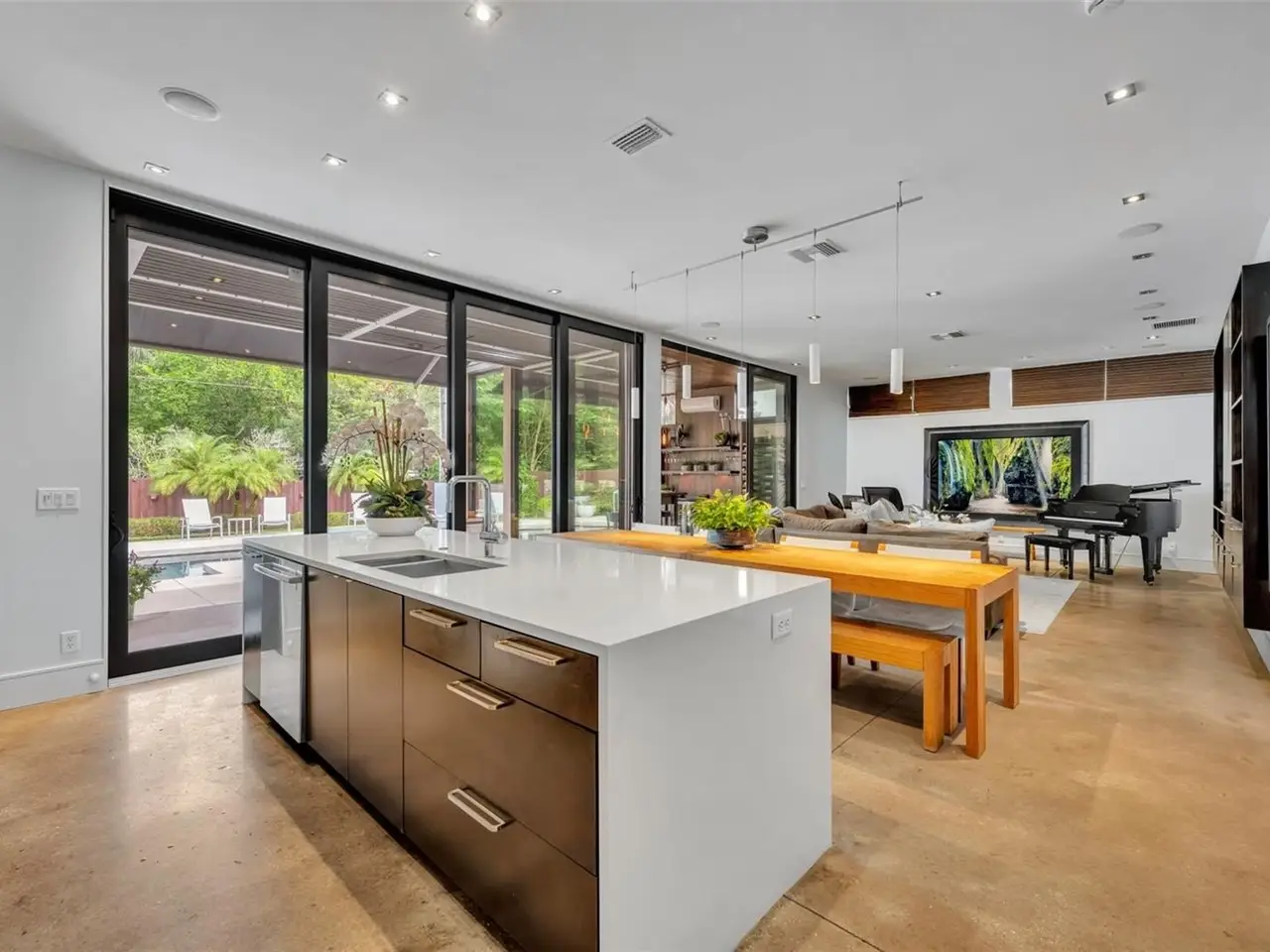 This contemporary four-bedroom, three-and-a-half-bath home with a detached 384 SF casita in desirable Beverly Shores/Rose Isle showcases designer-inspired finishes and a resort-style pool retreat. Custom-built with a modern aesthetic and open floor plan, it features a gourmet kitchen with an island, breakfast bar, stainless steel appliances including a Viking refrigerator and separate freezer, espresso cabinetry, and Caesarstone countertops. The open dining area flows seamlessly into the spacious great room, highlighted by polished concrete floors, a custom-built media center, a wine room, bedroom with en-suite bath, and aan office with wrap around desk. Twelve-foot retractable sliding glass doors fill the main living area with natural light and open to spectacular views of the heated saltwater pool and spa. Upstairs, the primary suite offers a serene retreat with a custom-designed walk-in closet, Caesarstone dual vanities, soaking tub, separate shower, and a private balcony overlooking the pool and Mead Gardens. Two additional bedrooms share a Jack-and-Jill bath, while another flexible space serves perfectly as a media room, gym, or nursery. A secondary washer and dryer upstairs add convenience. The outdoor living area is an entertainer’s dream, complete with a summer kitchen, bar area, gas grill, and retractable awning. Guests will love the detached guest house with its private entrance and pool views. The garage provides flexibility, accommodating either two or four cars. Ideally located near both Orlando and Winter Park, and just steps from scenic Mead Gardens, this home offers luxury living at its finest—a perfect blend of modern design, functionality, and resort-style comfort.