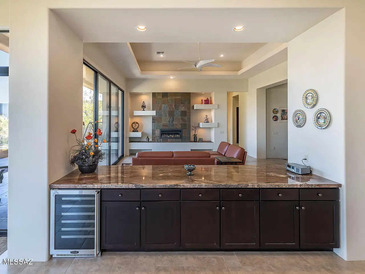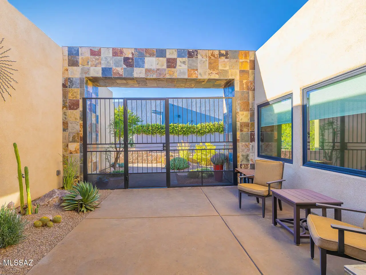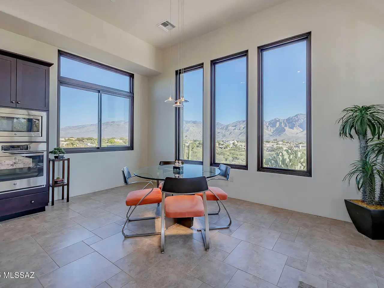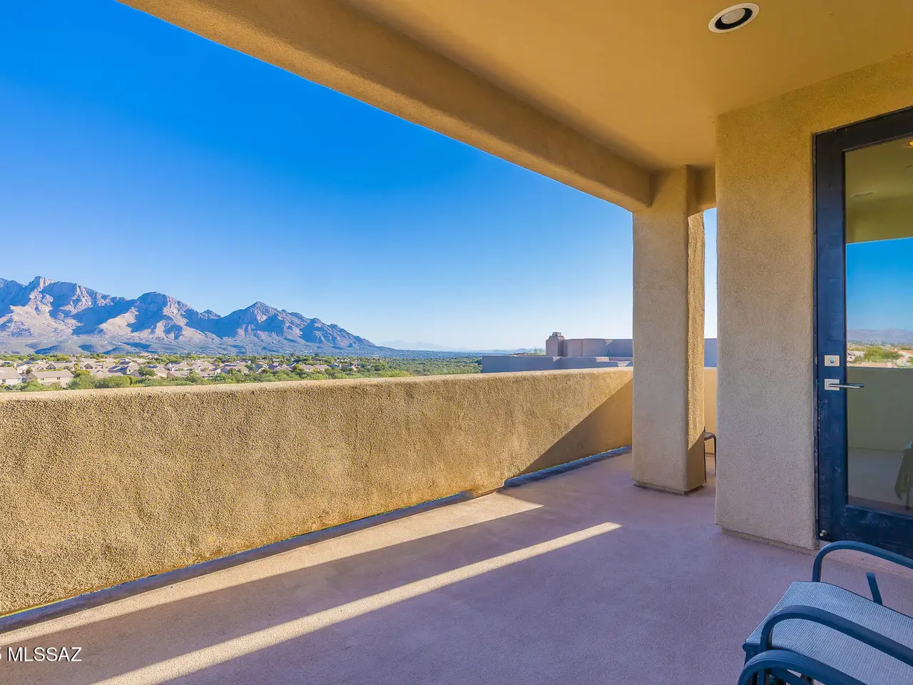 LUXURIOUS CUSTOM ESTATE nestled within the gated, picturesque community of Vistoso Pointe affords architectural detail, flexible living spaces plus uncompromising desert, mountain & city light views. Elevated, Premium East-facing lot with no one directly behind affords ultimate privacy. Featured are 4 bedrooms, 2.5 baths plus 3,531 sq ft of elegant living space including a spacious, upper level office/5th bedroom. Striking courtyard entry displays an expansive wrought iron gate with slate tile surround to welcome your guests. Inviting foyer flows effortlessly to formal dining room and large gathering room displaying a soaring, recessed ceiling, slate tiled fireplace flanked by art shelves, plus walls of windows accentuating the magnificent views. Gourmet kitchen hosts large center island, in-wall ovens and gas cooktop, open dining area with views plus outer island with wine cooler. Neutral stone floors highlight main living areas with granite countertops in kitchen, laundry & baths. Expansive Owner's Suite with rear patio access hosts a luxury spa bath with dual vanities, soaking tub, plus walk-in rain head shower and custom closet. Third bedroom is ideal as a Den/Media room while expansive upper-level Office accesses private balcony touting forever views. Extended laundry with sink adjoins powder room and 3-car garage with rustic iron doors and storage cabinets. Additional amenities include rich-hued cabinetry and doors, carpeted bedrooms, backlit art alcoves, fire sprinklers plus rolling sunshades off dining room. Retreat to a rear covered patio with outer cobblestone pavers, built-in grill station, firepit with curved bench seating, plus professional landscaping and spectacular views. Perfect for the most discerning buyer!