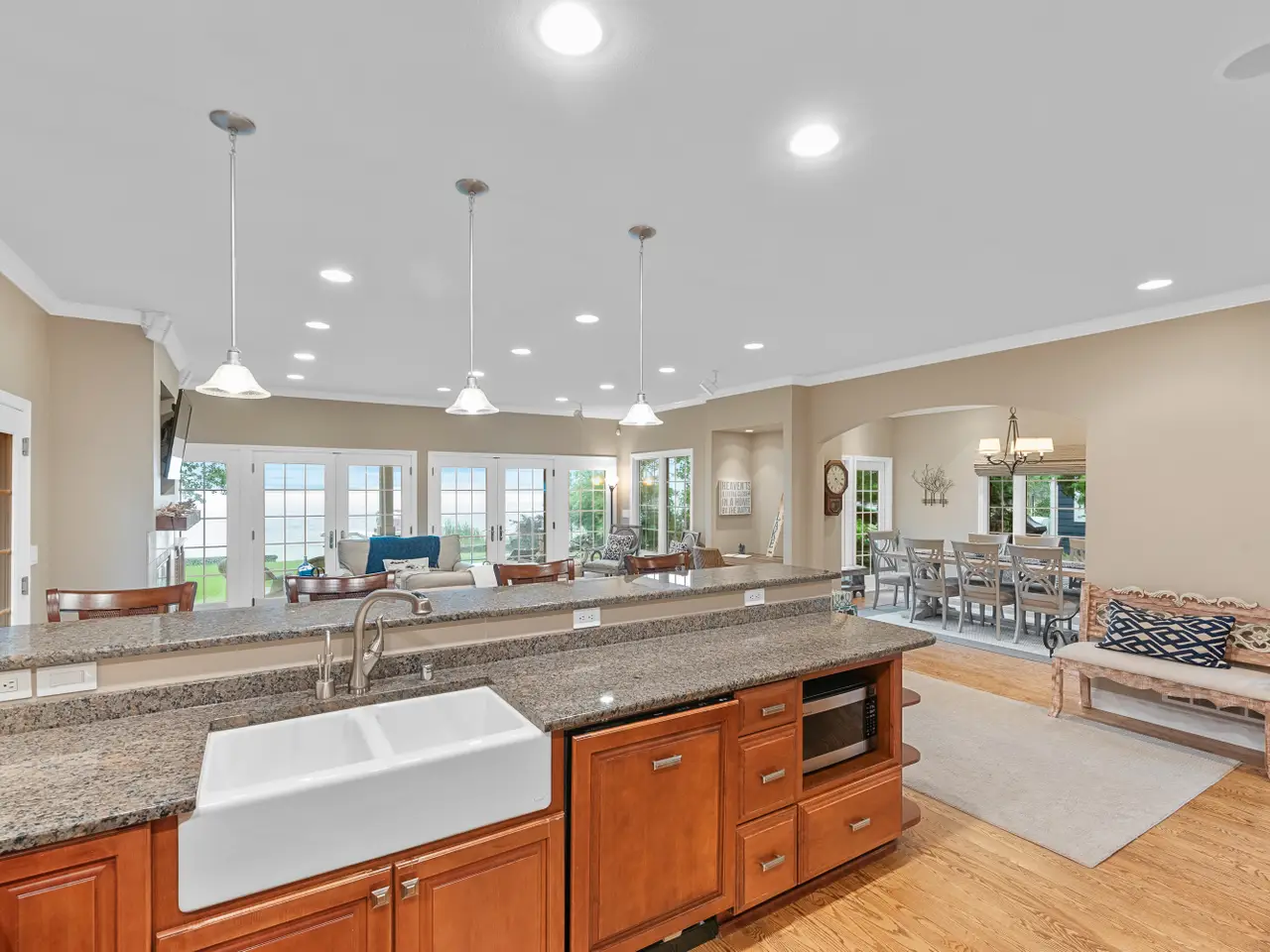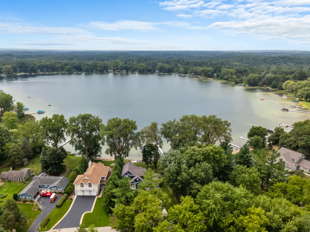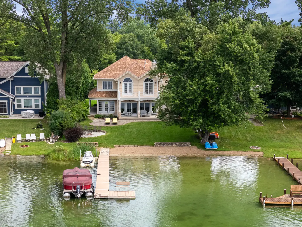 Welcome to this extraordinary lakeside retreat, offering over 3,000 square feet of thoughtfully designed living space with 3 bedrooms plus a private den/office. Perfectly positioned on the shores of sought-after Pretty Lake, this residence blends timeless elegance, modern updates, and breathtaking natural surroundings to create a one-of-a-kind home. From the moment you step inside, the grand travertine foyer and sweeping staircase set the tone for the quality and craftsmanship found throughout. Sunlight fills the open-concept main level, where wall-to-wall French doors frame panoramic lake views and unforgettable sunsets. The warm oak hardwood floors and natural fireplace with gas assist make the Great Room both inviting and sophisticated, while the adjacent dining room and custom kitchen are ideal for entertaining. With custom cabinetry, granite countertops, an apron sink, and a built-in breakfast nook, the kitchen seamlessly blends function with refined style. The expansive owner's suite is a private sanctuary overlooking the water. Vaulted ceilings, a cozy gas fireplace, and sweeping views make this space truly remarkable, while the spa-inspired bath offers dual vanities, a jetted tub, glass block walk-in shower, and double walk-in closets. The upper level also includes two additional bedrooms, a tiled full bath, convenient laundry, and a loft library nook with adjoining den/office- the perfect space for working from home or relaxing with a view. The home's design effortlessly connects indoor and outdoor living. Expansive wraparound porches, newer hardscaping, and landscaped grounds create a stunning backdrop for lakeside living. The heated and insulated 3.5-car garage offers versatility, with space for vehicles, storage, and even entertainment- complete with a pool table and winch system for effortless setup. Set on 65 feet of crystal-clear, sandy-bottom shoreline, this property offers level frontage, a private beach, and a pier for boating, fishing, or simply soaking in the serenity. A fire pit area, mature landscaping, and an automated sprinkler system complete the setting, while natural cattail ecosystems provide beauty and environmental benefits. Pretty Lake is a full-recreation lake, ideal for boating, skiing, paddleboarding, kayaking, and more. The community itself is vibrant and welcoming, with year-round events, a community pavilion, and an active lake district dedicated to preserving its beauty for generations to come. This remarkable property combines luxury, comfort, and the best of lakefront living- a rare opportunity to own not just a home, but a lifestyle.