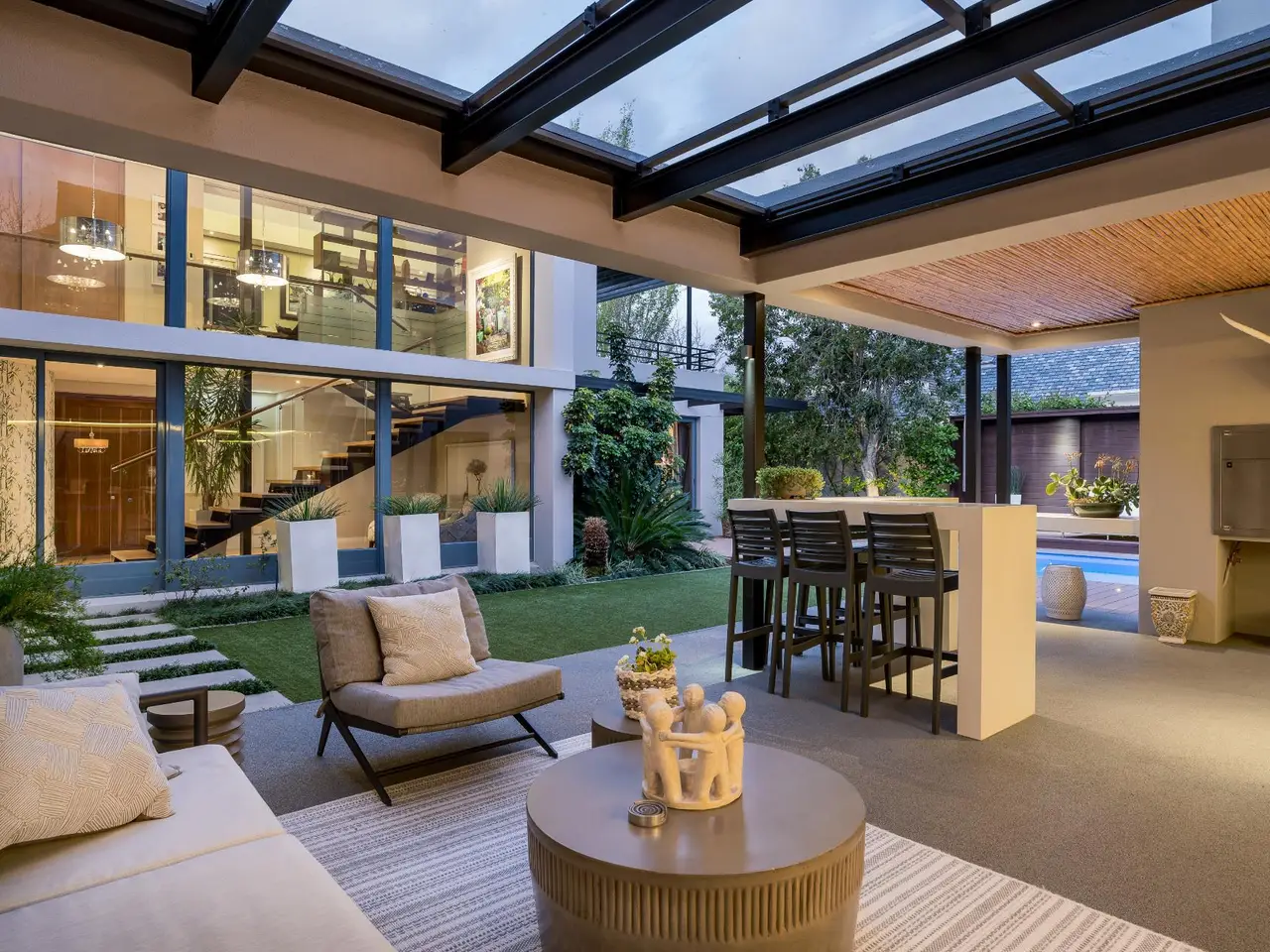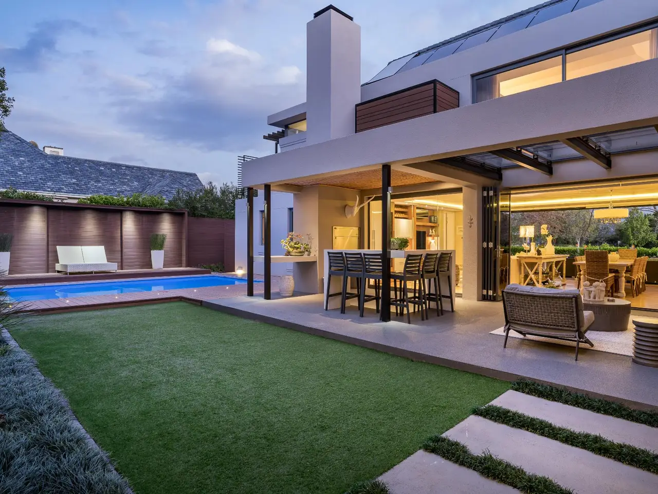 This impeccable property sets the bar for a home on Pearl Valley Golf and Country Estate. The superb location, on the 14th fairway of the award winning Jack Nicklaus Pearl Valley Golf Course, gave the architect an opportunity to work with a great stand and to match the homeowners requirements with the natural beauty of the golf course and surrounding mountain ranges with impressive results. The views from this property are magical. From the home's threshold there are views through floor-to-ceiling glass across the central garden area and beyond making the unique layout truly captivating on entering the property. The living spaces are crafted by a refined and highly practical floor plan with an open plan custom designed kitchen, with integrated Gaggenau appliances, that connects with a number of interior living spaces as well as offering direct access to the stunning outdoor areas including a covered patio, scenic garden, heated pool and sundecks - all that invites for amazing entertaining. Located on the ground floor there is a luxurious guest suite, for undisturbed privacy, as well as a gym / studio / library / study room, guest cloakroom, a utility room as well as a separate laundry room with a laundry shoot from the first floor, staff accommodation, a storage room and 3 garages. The first floor comprises 3 spacious bedroom suites, including the master, as well as a sleek home office sited at the entrance to the landing of the floor. The master suite is beautiful - all that one would expect from a home of this caliber. There are many added features to this meticulous home that includes energy efficient systems of heat pump underfloor heating, solar panels with an inverter battery backup system and LED lighting, engineered wooden flooring, a smart home automation system, a Hergam combustion fireplace, air conditioning throughout, direct access for a golf cart to the golf course and so much more. Custom Features Golf cart garage and car port Underfloor heating system Engineerd wooden flooring Integrated Gaggenau Fridge freezer and wine cooler Home Automation system LED lights through out home Laundry shoot in scullery Full staff accomodation with en-suite and store room Heated pool Caesar stone in kitchen Wood fireplace Portico Entrance Water tank Engineered komposit