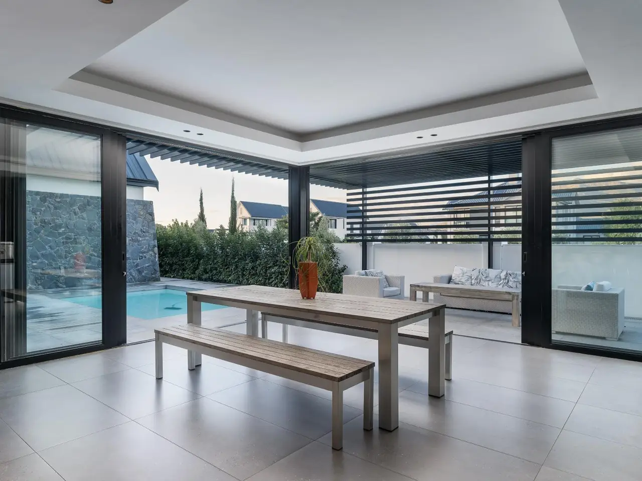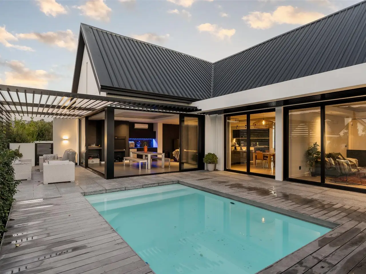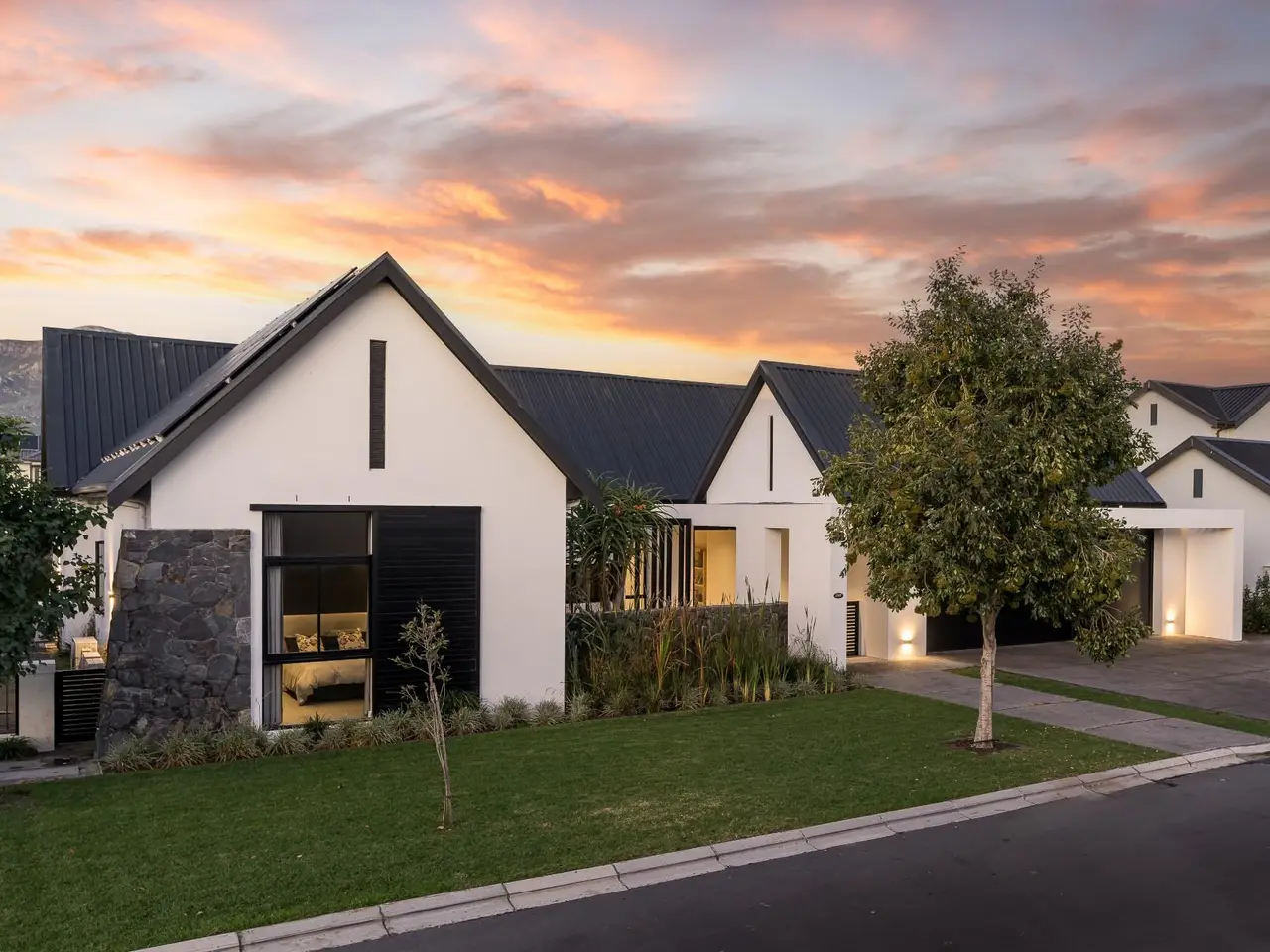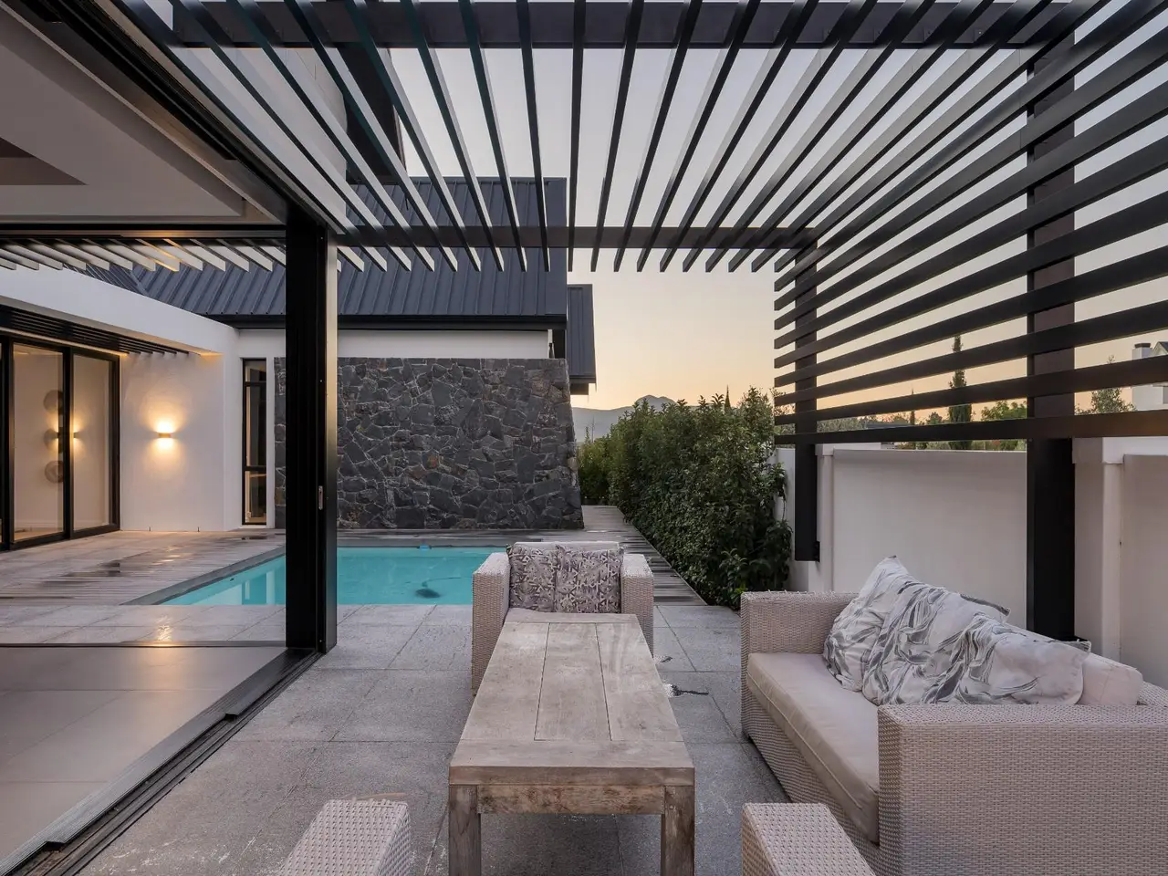 Nestled in the prestigious and secure Val de Vie Estate, this contemporary five bedroom single-story home offers the perfect blend of modern luxury and comfort, all while enjoying spectacular views all around. Located in the tranquil La Vue area, this property is within walking distance to nearby parks and play areas, making it an ideal setting for family living. The estate is renowned as one of the safest in Africa, providing peace of mind for you and your loved ones. Open-plan living with an elegant design that promotes seamless flow and natural light. Equipped with solar and battery back up for energy efficiency. A dedicated workspace for productivity or quiet reflection is next to the cozy pajama lounge to unwind and relax with family or friends. The modern kitchen features top-of-the-line appliances and ample counter space, overlooking the indoor braai area, making it perfect for hosting gatherings or enjoying intimate meals. Dive into luxury with a pristine pool that offers a serene spot to cool off or enjoy outdoor entertainment. Whether you're enjoying the beautiful surroundings, hosting friends, or retreating for a quiet evening, this home is designed for a lifestyle of comfort and ease.